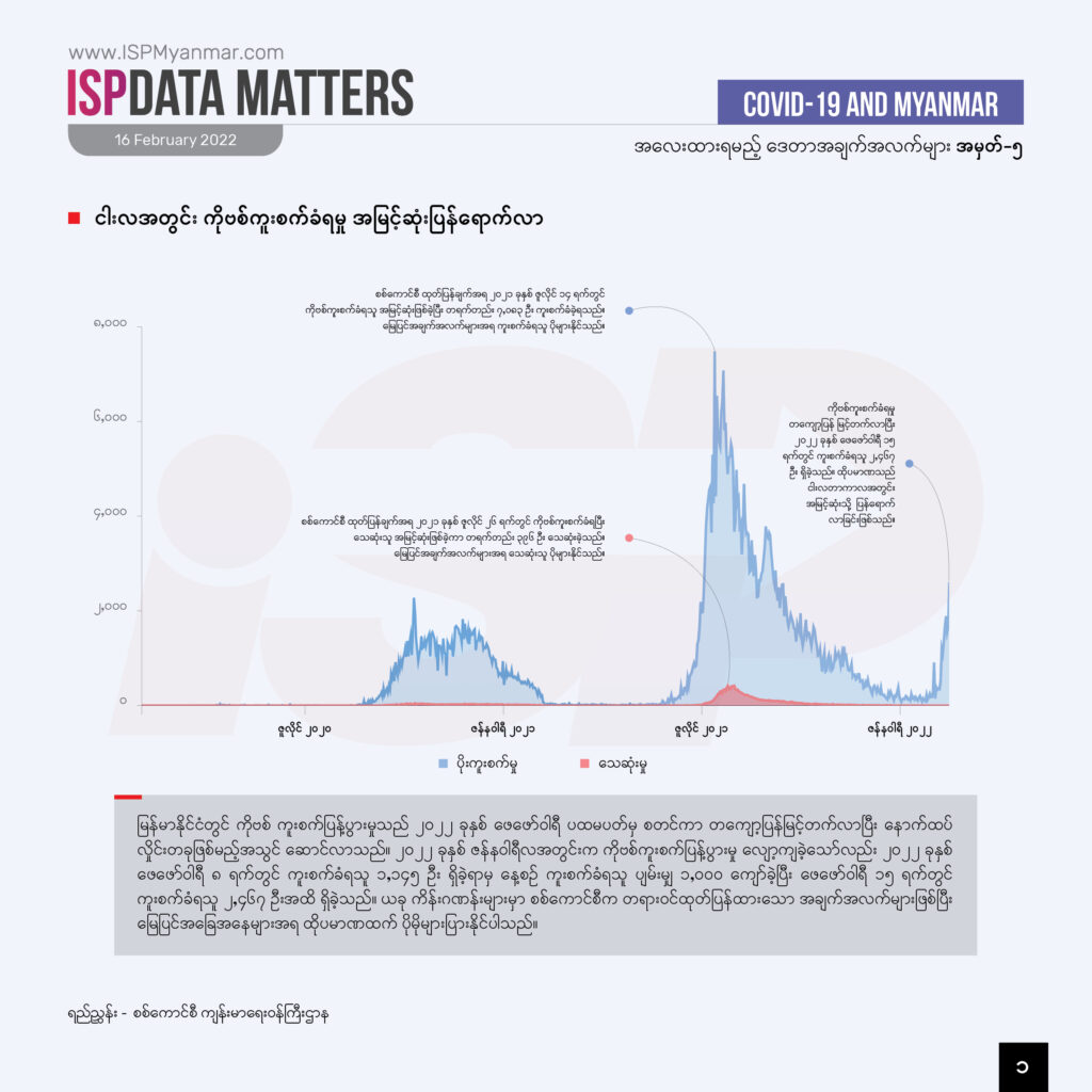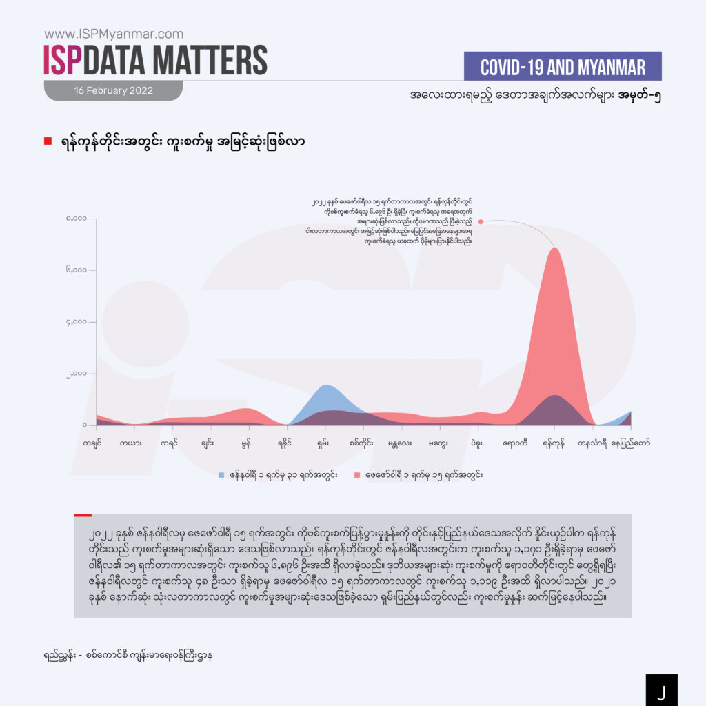 စစ်ကောင်စီရဲ့ တရားဝင်ကိန်းဂဏန်းတွေကို ဆန်းစစ်ရင်ပဲ ကိုဗစ်ကူးစက်မှုဟာ ငါးလအတွင်း အမြင့်ဆုံး ပြန်ရောက်လာတဲ့အပြင် နောက်ထပ် လှိုင်းတခုဖြစ်မယ့် အသွင်ဆောင်လာတာကို တွေ့ရပါတယ်။ ဒီကူးစက်မှုတွေထဲမှာလည်း ရန်ကုန်တိုင်းအတွင်း ကူးစက်မှုက အများဆုံးဖြစ်လာပြီး ဖေဖော်ဝါရီလ ၁၅ ရက်တာကာလ အတွင်း လူပေါင်း ၆,၉၀၀ နီးပါး ကူးစက်ခဲ့ပါတယ်။ တနိုင်ငံလုံးကို ခြုံကြည့်ရင်တော့ ဖေဖော်ဝါရီလ ၁၄ ရက်တာ ကာလအတွင်း ကိုးဗစ်ကူးစက်မှုအားလုံးရဲ့ ၅၄ ရာခိုင်နှုန်းဟာ လူနေထူထပ်တဲ့ ရန်ကုန်တိုင်းအတွင်းမှာ ဖြစ်ပါတယ်။