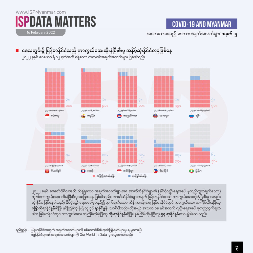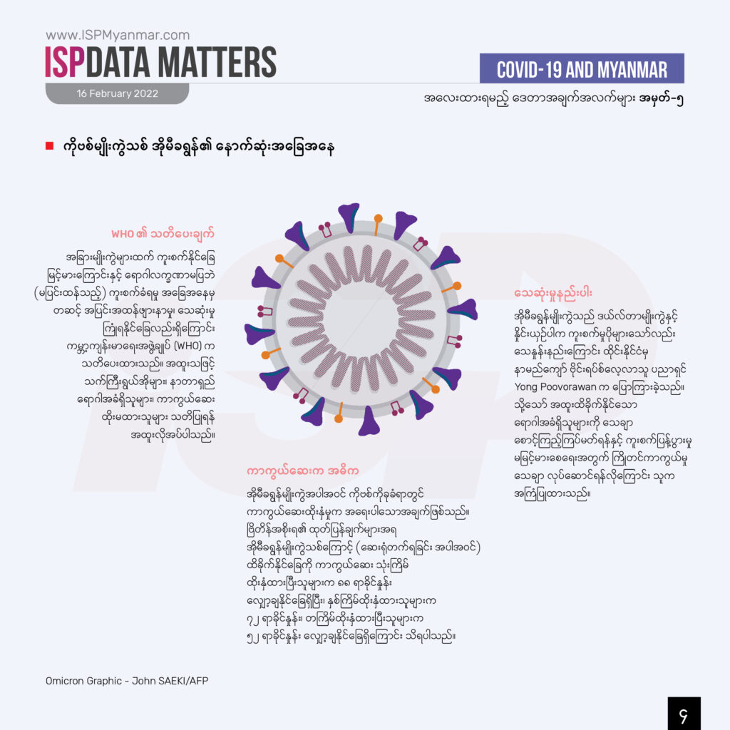 မြန်မာနိုင်ငံမှာ စုစုပေါင်း လူဦးရေရဲ့ ၃၆ ရာခိုင်နှုန်းကိုသာ ကိုဗစ်ကာကွယ်ဆေး နှစ်ကြိမ်ထိုးနှံထားပြီး ပြည်သူ့ကျန်းမာရေးစောင့်ရှောက်မှု ယန္တရားကလည်း အပြည့်အ၀ ပြန်လည်လည်ပတ်နိုင်စွမ်း မရှိသေးပါဘူး။ အိုမီခရွန်ဟာ ကာကွယ်ဆေးနှစ်ကြိမ်ထိုးပြီးသားအပြင် တတိယအကြိမ် (Booster) ထိုးနှံပြီးသားလူတွေကိုပါ ကူးစက်နိုင်တာကြောင့် အခုကူးစက်နှုန်းအတိုင်းသာ ဆက်လက်ပြန့်ပွားသွားမယ်ဆိုရင် ဖေဖော်ဝါရီလကုန်မှာ ကူးစက်မှု တရှိန်ထိုး မြင့်လာနိုင်ပါတယ်။ ဒါကြောင့် ကိုဗစ်ကူးစက်မှု အခြေအနေတွေကို မျက်ခြေမပြတ် စောင့်ကြည့်ပြီး တဦးချင်းကစလို့ ထိရောက်တဲ့ ကာကွယ်တားဆီးမှုလုပ်နိုင်ရေးက အဓိက ကျတာကြောင့် အလေးထားသင့်တဲ့အကြောင်းအချက်တခု ဖြစ်ပါတယ်။