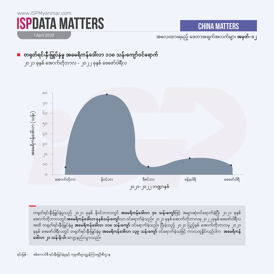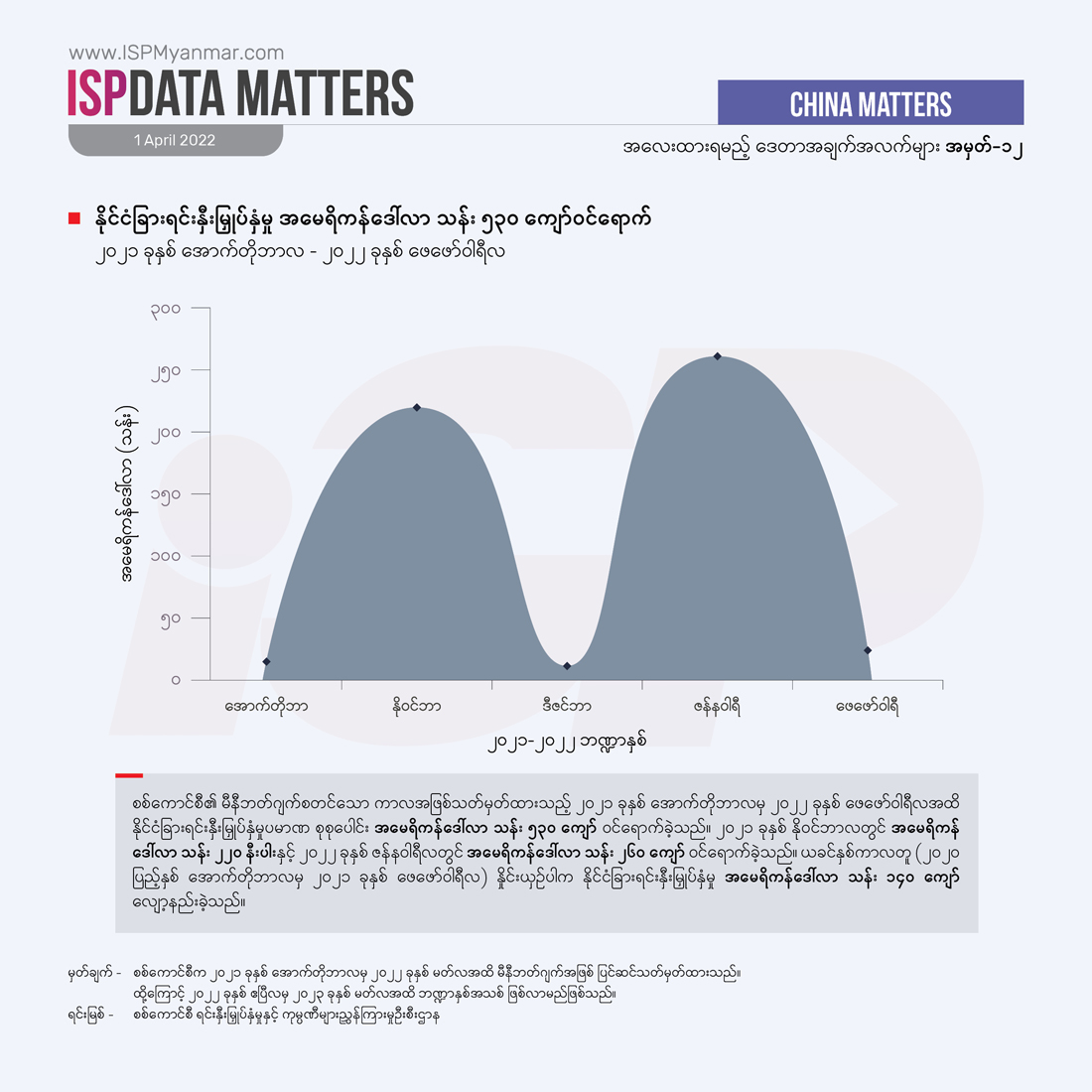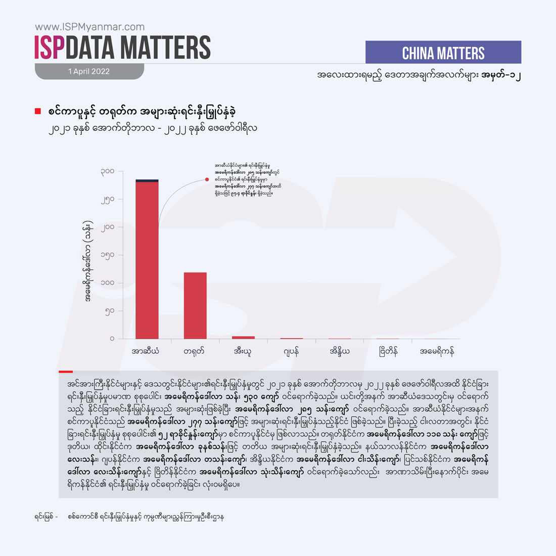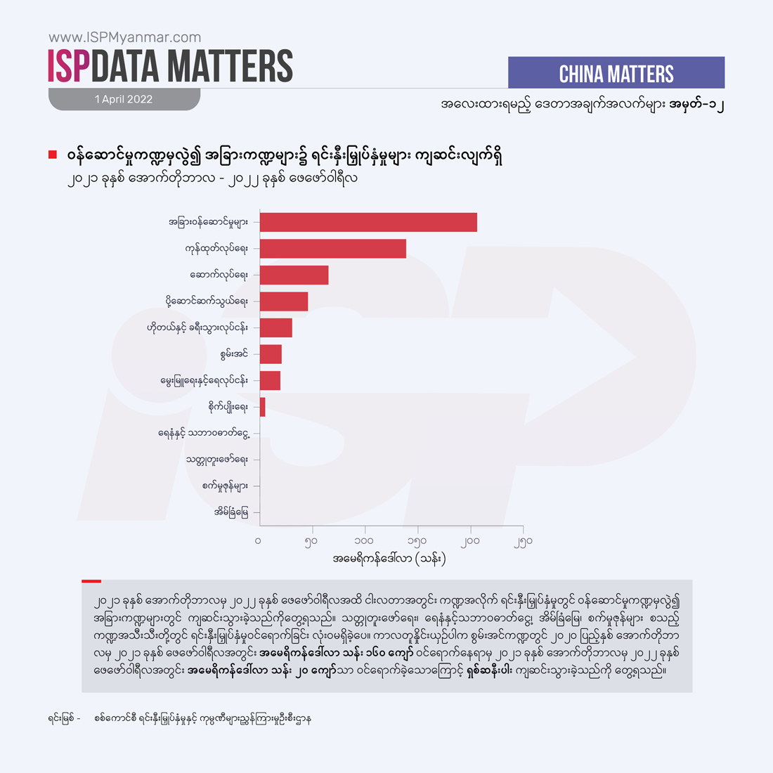 စစ်ကောင်စီက မီနီဘတ်ဂျက်အဖြစ် သတ်မှတ်ခဲ့တဲ့ ၂၀၂၁ ခုနှစ် အောက်တိုဘာလကနေ ၂၀၂၂ ခုနှစ် ဖေဖော်ဝါရီလအထိ ငါးလအတွင်း စုစုပေါင်း နိုင်ငံခြားရင်းနှီးမြှုပ်နှံမှု အမေရိကန်ဒေါ်လာ သန်း ၅၃၀ ကျော် ဝင်ရောက်ခဲ့တဲ့အနက် အာဆီယံနိုင်ငံတွေက အမေရိကန်ဒေါ်လာ ၂၈၅ သန်းကျော်ဖြင့် အများဆုံးဝင်ရောက်ခဲ့ပါတယ်။ ဒီအထဲမှာမှ စင်ကာပူနိုင်ငံက အမေရိကန်ဒေါ်လာ ၂၇၇သန်းကျော်ဖြင့် အများဆုံး ဝင်ရောက်ခဲ့တဲ့ နိုင်ငံ ဖြစ်ပါတယ်။ တရုတ်နိုင်ငံကလည်း အမေရိကန်ဒေါ်လာ ၁၁၈ သန်းကျော်ဖြင့်ဒုတိယအများဆုံးဝင်ရောက်ခဲ့ပါတယ်။ ထိုင်း၊ မလေးရှား တို့လို အခြားအာဆီယံနိုင်ငံတွေဆီကလည်း ရင်းနှီးမြှုပ်နှံမှု အမေရိကန်ဒေါ်လာ ခုနှစ်သန်းနဲ့ အမေရိကန် သုံးသိန်းကျော် အသီးသီး ဝင်ရောက်ခဲ့ကြပါတယ်။ ဂျပန်နိုင်ငံကလည်း အမေရိကန်ဒေါ်လာ တသန်းကျော် ဝင်ရောက်ခဲ့ပါတယ်။ ထူးခြားတာကတော့ ငါးလအတွင်းမှာ ဥရောပသမဂ္ဂအဖွဲ့ဝင် နယ်သာလန်နိုင်ငံမှ အမေရိကန်ဒေါ်လာ လေးသန်း၊ ပြင်သစ်နိုင်ငံမှ အမေရိကန်ဒေါ်လာ လေးသိန်းကျော် စသဖြင့် အာဏာသိမ်းပြီးနောက်ပိုင်း အီးယူနိုင်ငံတွေကနေ ရင်းနှီးမြှုပ်နှံမှုတွေ ပထမဆုံး ပြန်လည်ဝင်ရောက်လာခဲ့တာ ဖြစ်ပါတယ်။