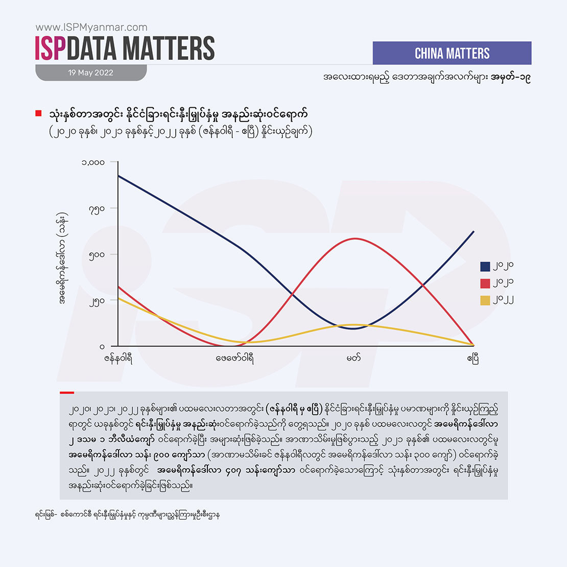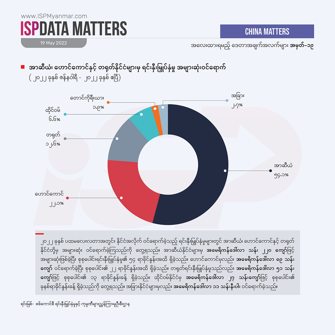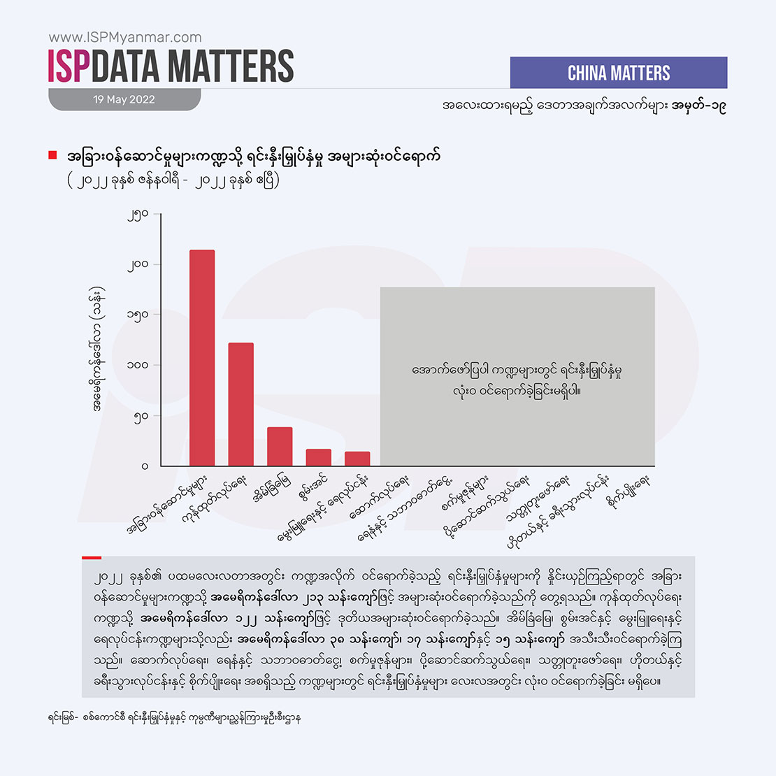 နိုင်ငံခြား ရင်းနှီးမြှုပ်နှံမှုဟာ ဖွံ့ဖြိုးဆဲနိုင်ငံတွေအတွက် အရေးကြီးတဲ့ စီးပွားရေး ဒေါက်တိုင်တခု ဖြစ်ပါတယ်။ ဒါပေမဲ့ နိုင်ငံခြားရင်းနှီးမြှုပ်နှံမှုတိုင်းက စီးပွားရေး ဖွံ့ဖြိုးတိုးတက်မှုကို အာမခံ မပေးနိုင်ပါဘူး။ သယံဇာတ ခေါင်းပုံဖြတ်မှုကို အခြေခံတဲ့၊ သဘာဝပတ်ဝန်းကျင်ကို အလေးမထားတဲ့၊ လူ့အခွင့်အရေးကို လေးစား လိုက်နာမှု မရှိတဲ့၊ ဒေသခံပြည်သူလူထုရဲ့ ဘဝတိုးတက်မှုတွေကို ထောက်ပံ့မှု မပေးနိုင်တဲ့ ရင်းနှီးမြှုပ်နှံမှုတွေကြောင့်လည်း တိုင်းပြည်ဟာ ပိုမိုချွတ်ခြုံကျပြီး ပြည်သူတွေရဲ့ ဘဝကို ဆင်းရဲတွင်းပိုနက်စေပါလိမ့်မယ်။ ဒီလို အဖြစ်အပျက်မျိုး စစ်အစိုးရအဆက်ဆက် မြန်မာနိုင်ငံမှာ ကြုံခဲ့ကြရပြီးပါပြီ။ တခါ မြန်မာနိုင်ငံမှာ ဘယ်နိုင်ငံတွေက ရင်းနှီးမြှုပ်နှံမှုတွေ ပြုလုပ်နေသလဲ၊ ဘယ်လို ရင်းနှီးမြှုပ်နှံမှု အမျိုးအစားတွေ အဓိက ဝင်ရောက်နေသလဲ ဆိုတာဟာ လက်ရှိ နိုင်ငံရေးအကျပ်အတည်းအတွင်း နိုင်ငံတကာပါဝင်မှုကို နားလည်ဖို့ အထောက်အပံ့ ဖြစ်စေပါတယ်။ ဒါ့အပြင် နိုင်ငံခြားရင်းနှီးမြှုပ်နှံမှုဟာ မြန်မာနိုင်ငံရဲ့ ရေရှည်စဉ်ဆက်မပြတ် ဖွံ့ဖြိုးတိုးတက်ရေးနဲ့ ပြည်သူ လူထုတွေရဲ့ နေ့စဉ်ဘဝတွေကိုပါ တိုက်ရိုက် သက်ရောက်မှုရှိတာကြောင့် အာဏာသိမ်း စစ်ကောင်စီအနေနဲ့ ဘယ်လို ရင်းနှီးမြှုပ်နှံမှုတွေကို အတည်ပြုနေသလဲ ဆိုတဲ့အပေါ် မျက်ခြေမပြတ် ရှိနေဖို့ အရေးကြီးပါတယ်။ အထူးသဖြင့် အခုလို သတင်းအချက်အလက် ဂေဟစနစ် ပျက်စီးနေချိန်မှာ စစ်ကောင်စီက အတည်ပြုလိုက်တဲ့ စီမံကိန်းတွေ၊ ခွင့်ပြုလိုက်တဲ့ ရင်းနှီးမြှုပ်နှံမှုတွေက ပွင့်လင်း မြင်သာမှုရှိသလား၊ သက်ရောက်မှု ဘယ်လိုဖြစ်နိုင်သလဲ စတဲ့ ကိစ္စရပ်တွေအတွက် နိုင်ငံခြား ရင်းနှီးမြှုပ်နှံမှုတွေနဲ့ ပတ်သက်တဲ့ အချက်အလက် ကိန်းဂဏန်းတွေက အလေးထား စောင့်ကြည့်စရာ ဖြစ်ပါတယ်။