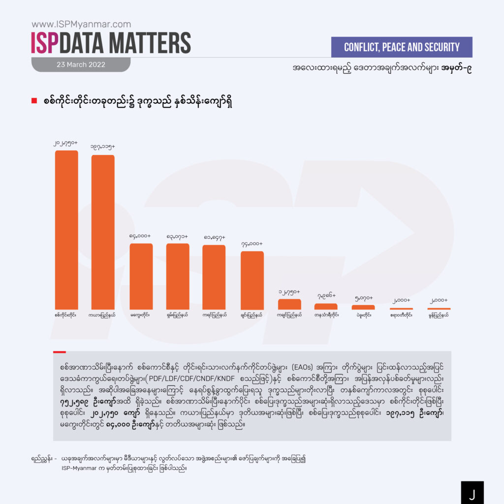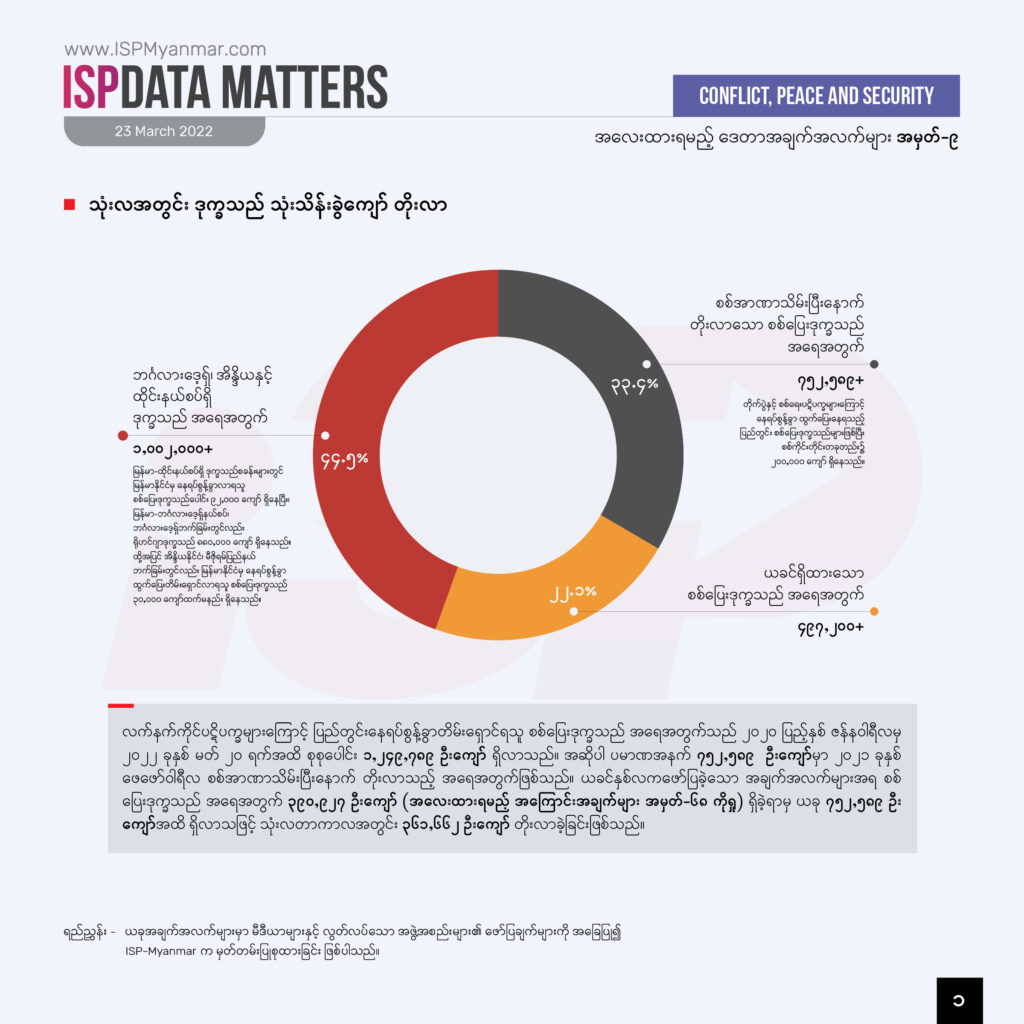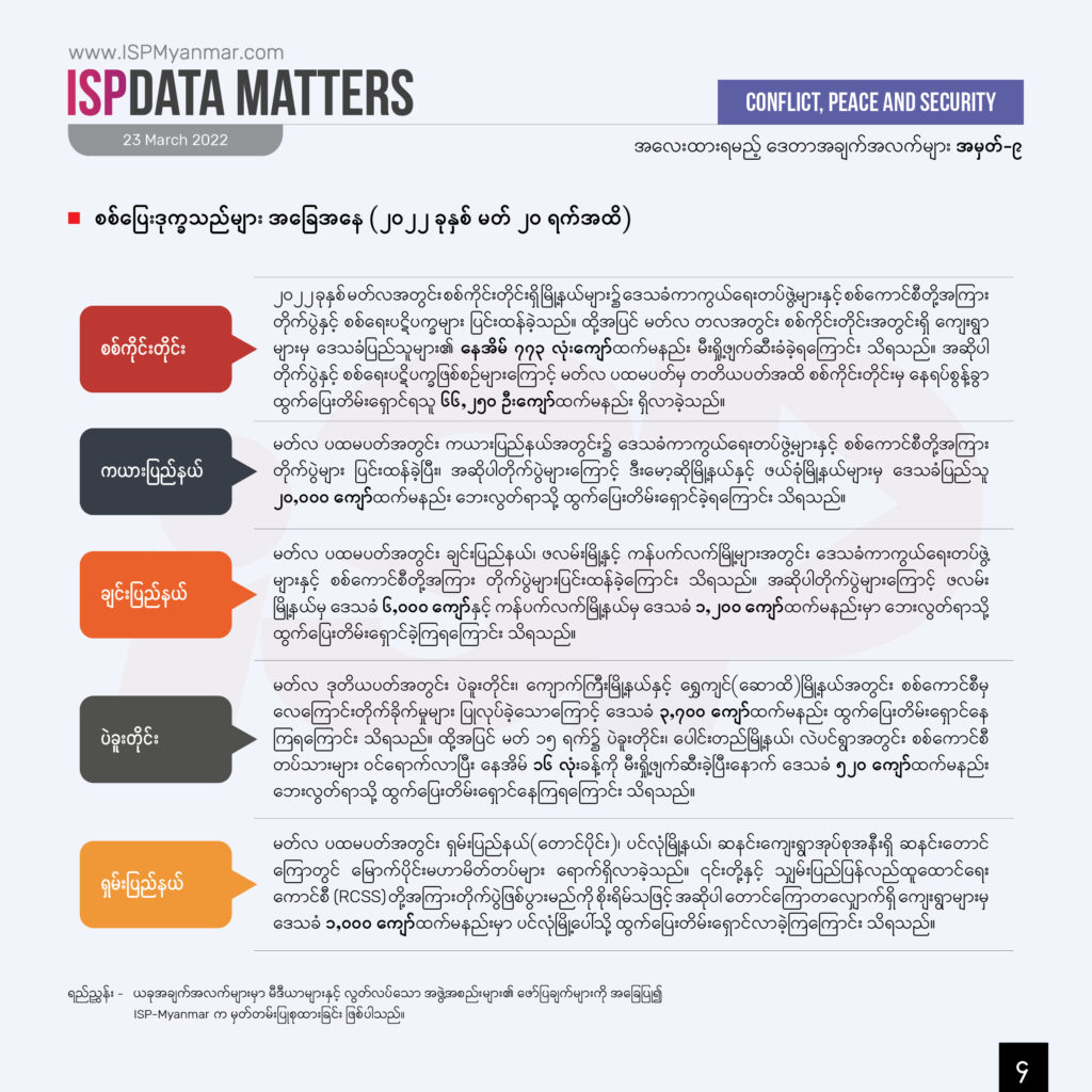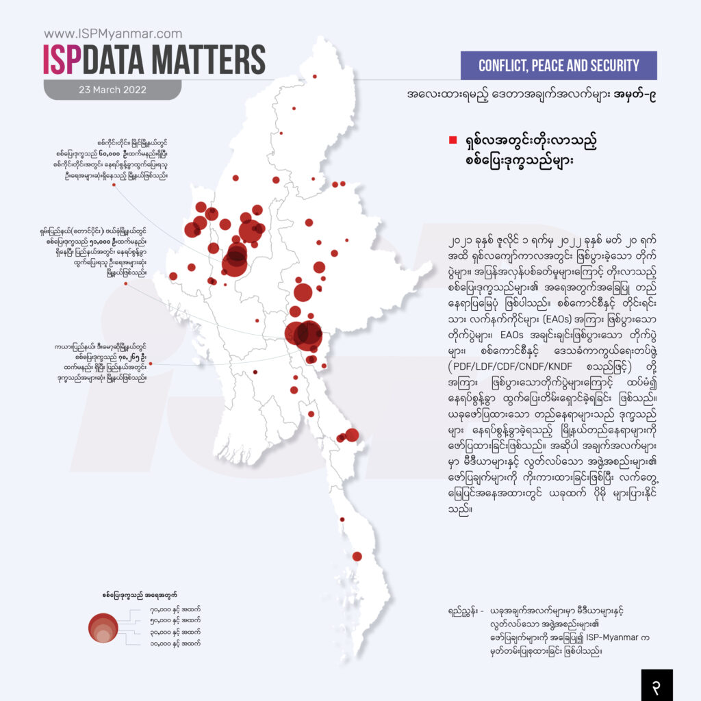 စစ်အာဏာသိမ်းပြီးနောက်ပိုင်း ၂၀၂၁ ခုနှစ် ဖေဖော်ဝါရီ ၁ ရက်ကနေ ၂၀၂၂ ခုနှစ် မတ် ၂၀ ရက်အထိ နေရာအနှံ့မှာ ဖြစ်ခဲ့တဲ့ တိုက်ပွဲတွေနဲ့အပြန်အလှန်ပစ်ခတ်မှု တွေကြောင့် နေရပ်စွန့်ခွာခဲ့ရတဲ့ စစ်ဘေးဒုက္ခသည်အရေအတွက် စုစုပေါင်း ၇၅၂,၅၈၉ ဦးကျော် ရှိလာပါတယ်။ စစ်အာဏာမသိမ်းခင်က စစ်ဘေးဒုက္ခသည် ၄၉၇,၂၀၀ ဦးကျော် ရှိနေတာကြောင့် မြန်မာနိုင်ငံမှာ နေရပ်စွန့်ခွာ ထွက်ပြေးတိမ်းရှောင်နေရတဲ့ စစ်ဘေးဒုက္ခသည် ၁,၂၄၉,၇၈၉ ဦးကျော် ရှိလာပါတယ်။ တခါ ဘင်္ဂလားဒေ့ရှ်၊ အိန္ဒိယနဲ့ ထိုင်းနယ်စပ်က ဒုက္ခသည်စခန်းတွေမှာလည်း ဒုက္ခသည် ၁၀၀,၂၀၀ ဦးကျော် ရှိနေပါတယ်။