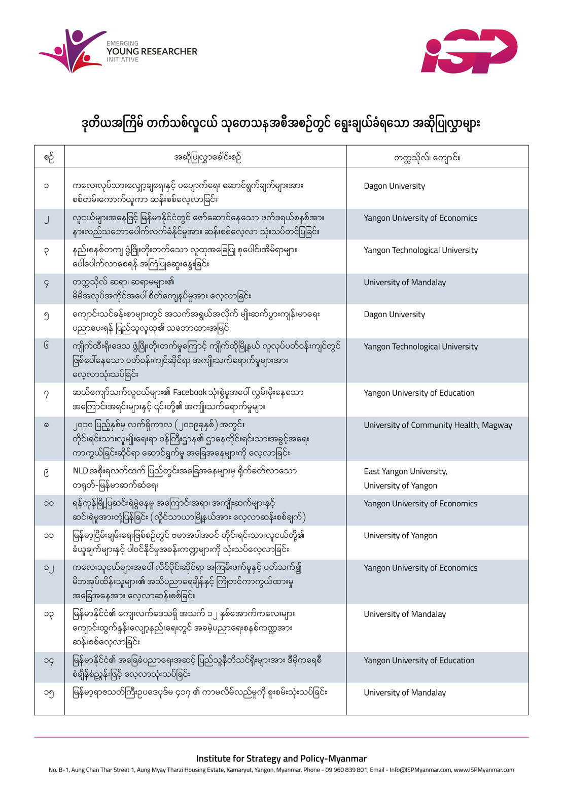 မြန်မာ့မဟာဗျူဟာနှင့် မူဝါဒလေ့လာရေး အင်စတီကျု (ISP-Myanmar) ၏ ဒုတိယအကြိမ် တက်သစ်လူငယ် သုတေသန အစီအစဉ် (Emerging Young Researcher Initiative) သို့ ပေးပို့ခဲ့ကြသည့် သုတေသန အဆိုပြုလွှာ ၄၄ စောင်အနက် ရွေးချယ်ခံရသော အဆိုပြုလွှာ ၁၅ စောင် ကို ယနေ့ (စက်တင်ဘာ ၃၀) တွင် ထုတ်ပြန် ကြေညာလိုက်ပါသည်။ ထုတ်ပြန်ကြေညာချက် အပြည့်အစုံမှာ အောက်ပါ အတိုင်း ဖြစ်ပါသည်။