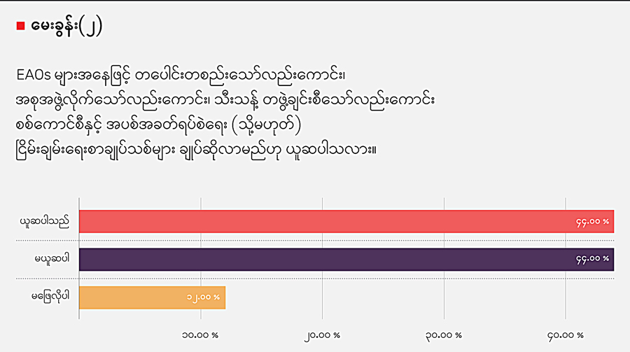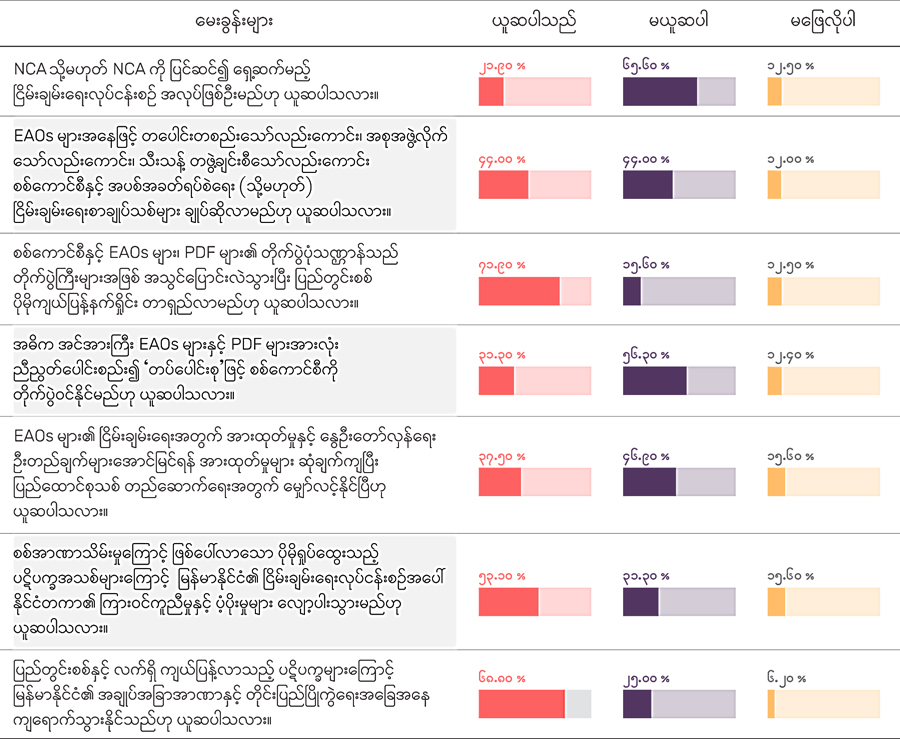 ဒီမေးခွန်းကို ဖြေဆိုကြတဲ့အခါ ဖြစ်လာနိုင်တယ်လို့ ယူဆမှုက ၄၄ ရာခိုင်နှုန်း ရှိသလို မဖြစ်နိုင်ဘူးလို့ ယူဆမှုလည်း ၄၄ ရာခိုင်နှုန်း ရှိခဲ့ပါတယ်။ မဖြေလိုမှုက ၁၂ ရာခိုင်နှုန်း ရှိပါ တယ်။ ဖြစ်လာနိုင်တယ်လို့ ယူဆကြရာမှာ အရင် စစ်အစိုးရ နဝတ၊ နအဖခေတ်မှာ တဖွဲ့ချင်း အပစ်ရပ်လက်မှတ်ထိုးခဲ့တဲ့ သာဓကတွေရှိတာကြောင့် တနှစ်၊ နှစ်နှစ်အတွင်း ဖြစ် လာနိုင်တာ၊ ကိုယ့်အဖွဲ့အကျိုးစီးပွားကိုသာကြည့်ပြီး စစ်ကောင်စီနဲ့ အပေးအယူလုပ်မယ့် EAOs များ ရှိလာနိုင်တာ၊ နောက်ကွယ်မှာ တရုတ်အစိုးရရဲ့ဖိအားတွေ ရှိနေနိုင်တာ စတဲ့ အချက်တွေကြောင့် ယူဆတာကို တွေ့ရပါတယ်။ မဖြစ်နိုင်ဘူးလို့ ယူဆသူတွေကတော့ လက်ရှိ နိုင်ငံရေး၊ စစ်ရေးအခြေအနေ အဘက်ဘက်မှာ စစ်ကောင်စီဟာ နာမည်ပျက်များ နေတာကြောင့် ယုံကြည်မှုအားနည်းနေပြီး ဘယ် EAO ကမှ စာချုပ်ချုပ်ဆိုဖို့ စဉ်းစားမှာ မဟုတ်ဘူး။ ဒါ့အပြင် စစ်ကောင်စီက အချိန်မရွေး ပြုတ်ကျနိုင်တဲ့ အနေအထားရှိတာကို နှစ်ဖက်လုံးက နားလည်ကြတဲ့အတွက် မဖြစ်နိုင်ဘူးလို့ယူဆတာ အစရှိတဲ့အချက်တွေကို အဓိကထား ပြောဆိုကြပါတယ်။