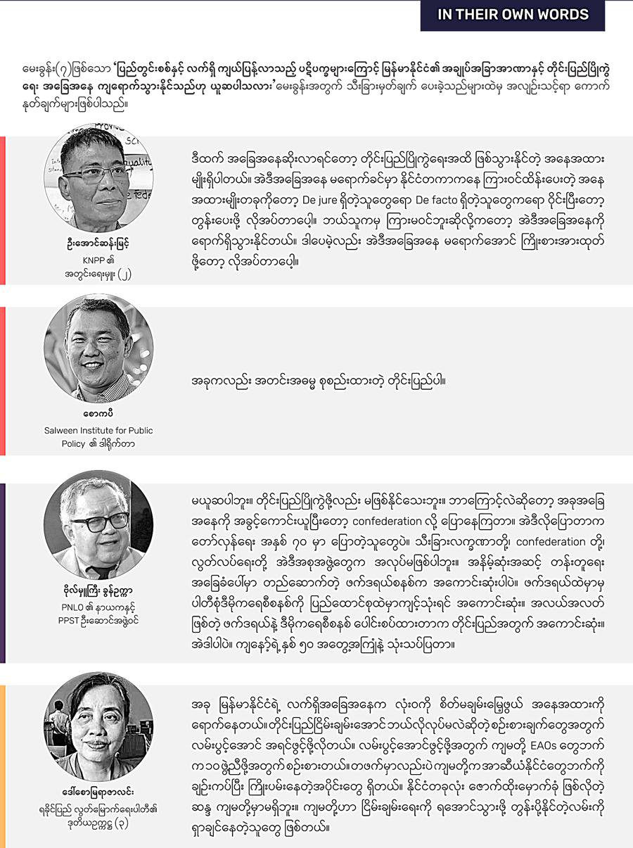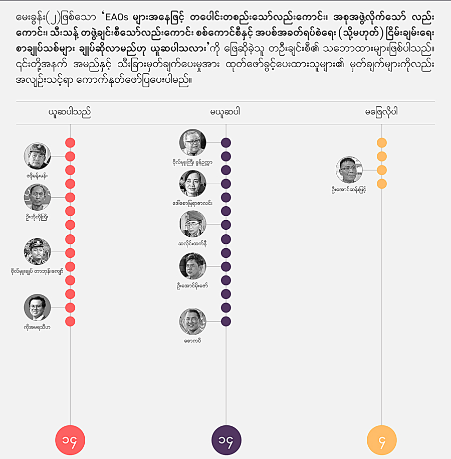နှစ် ၇၀ ကျော်ကြာ မြန်မာ့ပြည်တွင်းစစ်မှာ EAOs တွေရဲ့ ငြိမ်းချမ်းရေးအတွက် အားထုတ်မှုဟာ တန်းတူရေးနဲ့ ကိုယ်ပိုင် ပြဋ္ဌာန်းခွင့်ကို အခြေခံတဲ့ ဖက်ဒရယ်ပြည်ထောင်စု တည်ဆောက်ရေး ဖြစ်ပါတယ်။ စစ်အာဏာရှင် စနစ်ဆန့်ကျင်ရေး လူထုလှုပ်ရှားမှု နွေဦးတော်လှန်ရေးရဲ့ ဦးတည်ချက်တွေထဲမှာ အကြောင်းအချက်ငါးရပ် ပါဝင်ပြီး အာဏာသိမ်း စစ်ကောင်စီ ပြုတ်ကျရေး၊ နိုင်ငံတော်သမ္မတဦးဝင်းမြင့်နဲ့ နိုင်ငံတော်၏ အတိုင်ပင်ခံပုဂ္ဂိုလ် ဒေါ်အောင်ဆန်းစုကြည် အပါအဝင် အခြားဖမ်းဆီးခံထားရသူတွေ ပြန်လွှတ်ပေးရေး၊ ၂၀၂၀ အထွေထွေ ရွေးကောက်ပွဲရလဒ်ကို အသိအမှတ်ပြုရေး၊ ရွေးကောက်ခံ တရားဝင် အစိုးရသစ် ဖွဲ့စည်းနိုင်ရေး၊ ၂၀ဝ၈ ခုနှစ် ဖွဲ့စည်းပုံအခြေခံဥပဒေ ဖျက်သိမ်းရေးနဲ့ ဖွဲ့စည်းပုံ အခြေခံဥပဒေသစ် ပေါ်ထွန်းရေး၊ ဖက်ဒရယ်ဒီမိုကရေစီပြည်ထောင်စု တည်ဆောက်ရေး တို့ ဖြစ်ပါတယ်။ ဒါကြောင့်လက်ရှိအချိန်မှာ “EAOs တွေရဲ့ ငြိမ်းချမ်းရေးအတွက် အား ထုတ်မှုနဲ့ နွေဦးတော်လှန်ရေး ဦးတည်ချက်တွေ အောင်မြင်ဖို့ အားထုတ်မှုတွေ ဆုံချက်ကျပြီး ပြည်ထောင်စုသစ် တည်ဆောက်ဖို့အတွက် မျှော်လင့်နိုင်ပြီလား” ဆိုတာက အဓိက ကျတဲ့ မေးခွန်းတခုဖြစ်ပါတယ်။