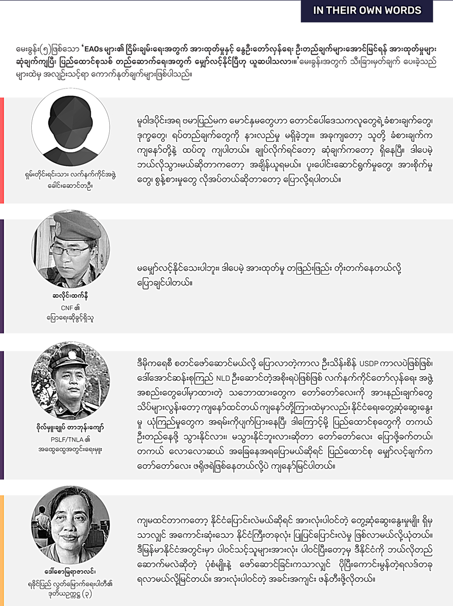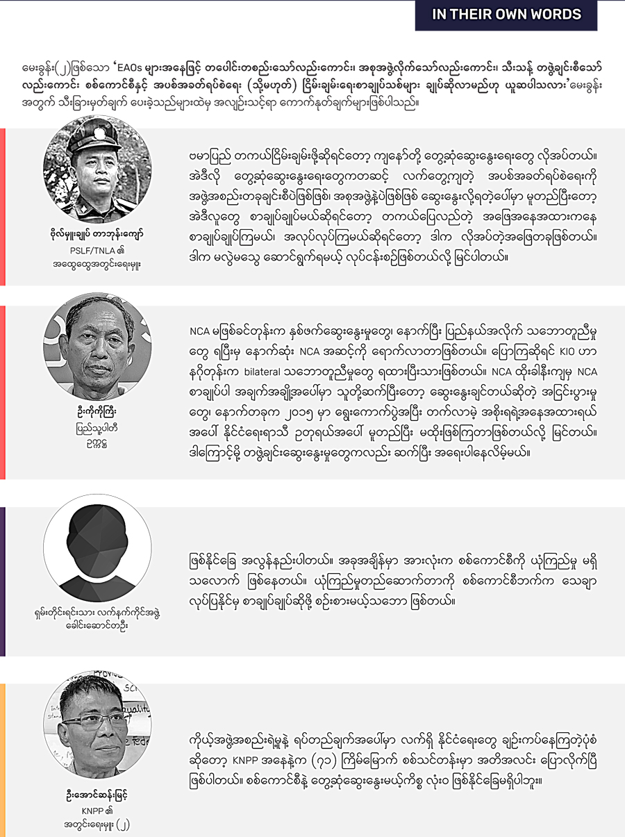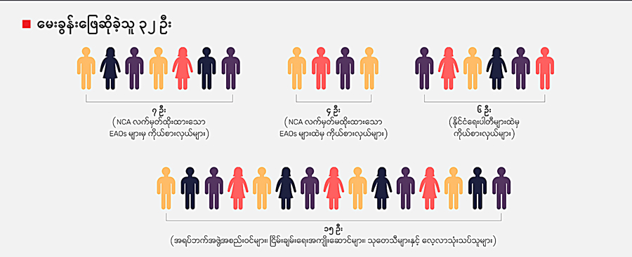 ISP-Myanmar ရဲ့ မေးခွန်းတွေကို ဖြေခဲ့ကြတဲ့ ၃၂ ဦးထဲမှာ ခုနစ်ဦးဟာ NCA စာချုပ်လက်မှတ်ရေးထိုးထားတဲ့ EAOs တွေထဲက ကိုယ်စားလှယ်တွေဖြစ်ပါတယ်။ တခါ NCA လက်မှတ်ထိုးမထားတဲ့ EAOs တွေထဲက ကိုယ်စားလှယ်လေးဦးလည်း ပါဝင်ပါတယ်။ ဒါ့အပြင် နိုင်ငံရေးပါတီတွေထဲက ကိုယ်စားလှယ် ခြောက်ဦး၊ နိုင်ငံရေး လေ့လာသုံးသပ် သူတွေအပါအဝင် ငြိမ်းချမ်းရေးကြိုးပမ်းမှု ဖြစ်စဉ်တလျှောက်ပါခဲ့တဲ့ အရပ်ဘက် အဖွဲ့အစည်းတွေ၊ ငြိမ်းချမ်းရေးအကျိုးဆောင်တွေ၊ သုတေသီတွေ စသဖြင့် စုစုပေါင်း ၁၅ ဦး လည်း ပါဝင်ဖြေဆိုခဲ့ပါတယ်။ အခုဖော်ပြချက်မှာ ဖြေဆိုသူတွေရဲ့ ပုဂ္ဂလိကလုံခြုံမှုကို အလေးထားပြီး ကာယကံရှင်တွေရဲ့ဆန္ဒမပါဘဲ ပုဂ္ဂိုလ်ရေးဆိုင်ရာ အချက်အလက်တွေကို ထုတ်ဖော်ပြောဆိုမှာမဟုတ်ပါဘူး။ ဖြေဆိုသူ ၃၂ ဦးစလုံးဟာ မေးခွန်းဖြေဆိုမှုတွေအပြင် မေးခွန်းတခုချင်းစီအတွက် သီးခြားမှတ်ချက်ပေးမှုတွေကိုလည်း ပြုလုပ်ခဲ့ကြပါတယ်။ ဒီလိုမှတ်ချက်ပေးမှုတွေထဲမှာ သူတို့မှတ်ချက်စကားတွေကို ဖော်ပြခွင့်ပေးခဲ့သူတွေရဲ့ ဖြေဆိုချက်တွေကိုလည်း အလျဉ်းသင့်သလို ကောက်နုတ်ဖော်ပြပေးသွားပါမယ်။