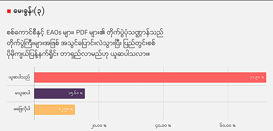 ဒီမေးခွန်းကို ဖြေဆိုကြရာမှာ တိုက်ပွဲတွေ ကြီးမားကျယ်ပြန့်ပြီး ပြည်တွင်းစစ် ပိုမို ကျယ်ပြန့်နက်ရှိုင်း တာရှည်လာမယ်လို့ ယူဆမှုက ၇၂ ရာခိုင်နှုန်းအထိရှိတာ တွေ့ရပါတယ်။ မဖြစ်နိုင်ဘူးဆိုတဲ့ ယူဆမှုက ၁၆ ရာခိုင်နှုန်းရှိပြီး၊ မဖြေလိုတာ ၁၂ ရာခိုင်နှုန်း ရှိပါတယ်။ တိုက်ပွဲတွေ ကျယ်ပြန့်လာမယ်လို့ ယူဆကြရာမှာ စစ်အာဏာရှင်စနစ် ဆန့်ကျင်ရေး အကြမ်းမဖက်လှုပ်ရှားမှုတွေကို စစ်ကောင်စီက ဖြိုခွင်းနှိပ်စက်တာတွေ၊ စစ်မြေပြင်သဖွယ် ကိုင်တွယ်ပုံတွေနဲ့ ပြုမူတုံ့ပြန်နေပုံတွေဟာ အဲဒီအခြေအနေ ရောက်ရှိအောင် တွန်းပို့နေတာ၊ ဒီလုပ်ရပ်တွေကြောင့်လည်း ပြည်သူလူထုဘက်က လက်နက်ကိုင်လမ်းစဉ်ကို ရွေးချယ်ထားခြင်းဖြစ်နေတာ စတဲ့အချက်တွေက အဓိကကျတယ်လို့ ပြောဆိုကြပါ တယ်။ တိုက်ပွဲတွေ ကြီးမားကျယ်ပြန့်လာမှာမဟုတ်ဘူးလို့ ယူဆတဲ့အခါ NCAလက်မှတ် ထိုးထားတဲ့ EAOs တွေအားလုံး တိုက်ပွဲဝင်နေတာမဟုတ်ဘူး၊ UWSA နဲ့ AA တပ်ဖွဲ့တွေ က နှုတ်ဆိတ်နေဆဲဖြစ်နေတာ၊ PDF တွေဟာ ဗဟိုကနေ သေနင်္ဂဗျူဟာ ညွှန်ကြားနိုင်တဲ့ အမိန့်ပေးစနစ် (Central Command) နဲ့ တိုက်ပွဲဝင်နိုင်ခြင်း မရှိသေးတာ စတဲ့အချက် တွေကို ထောက်ပြကြတာတွေ့ရပါတယ်။