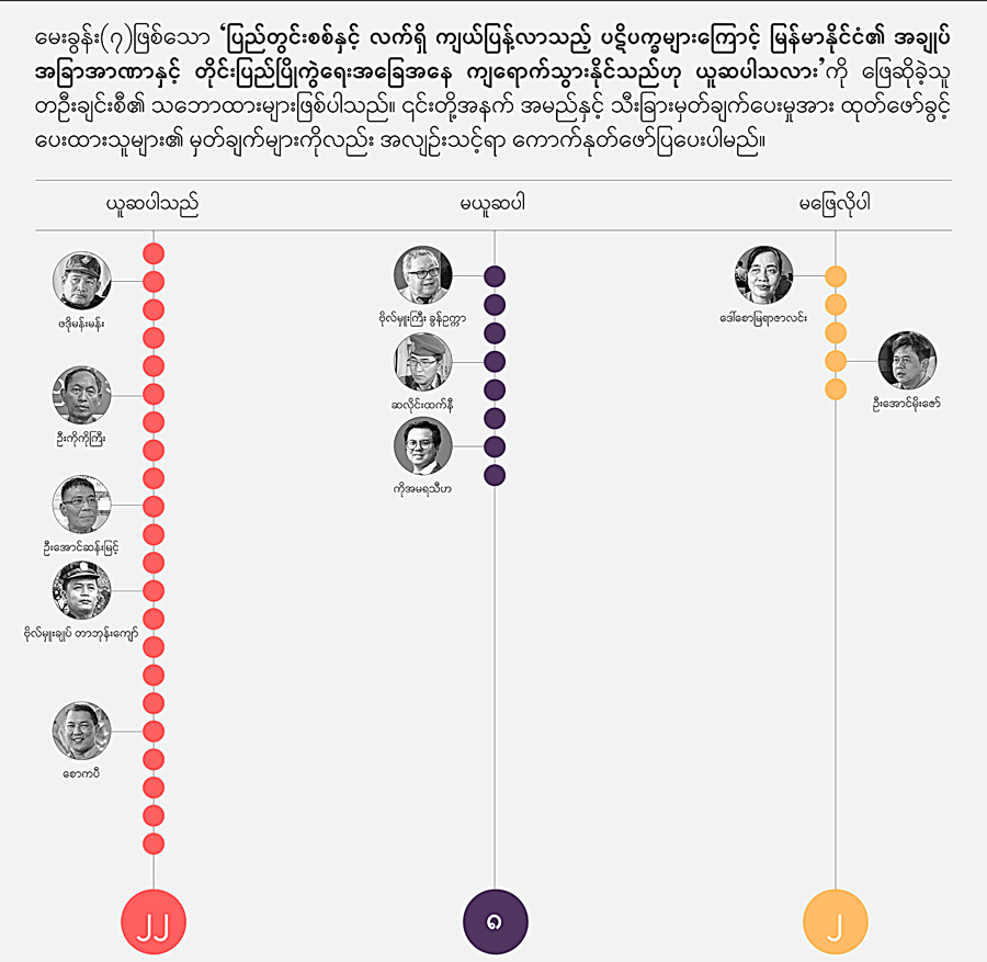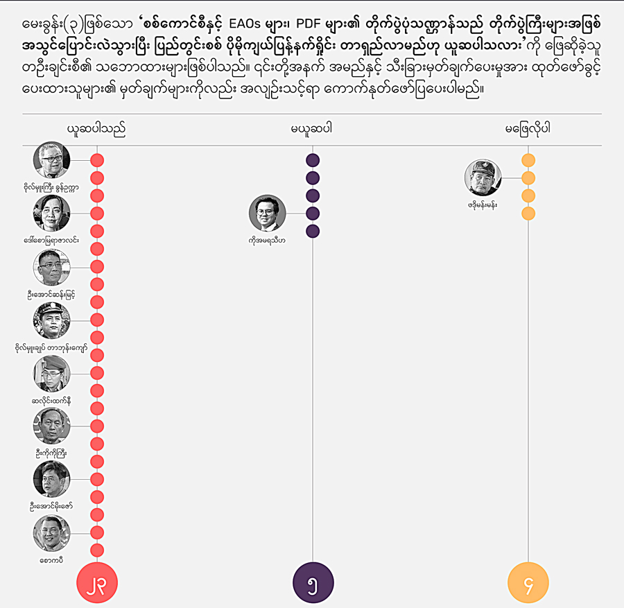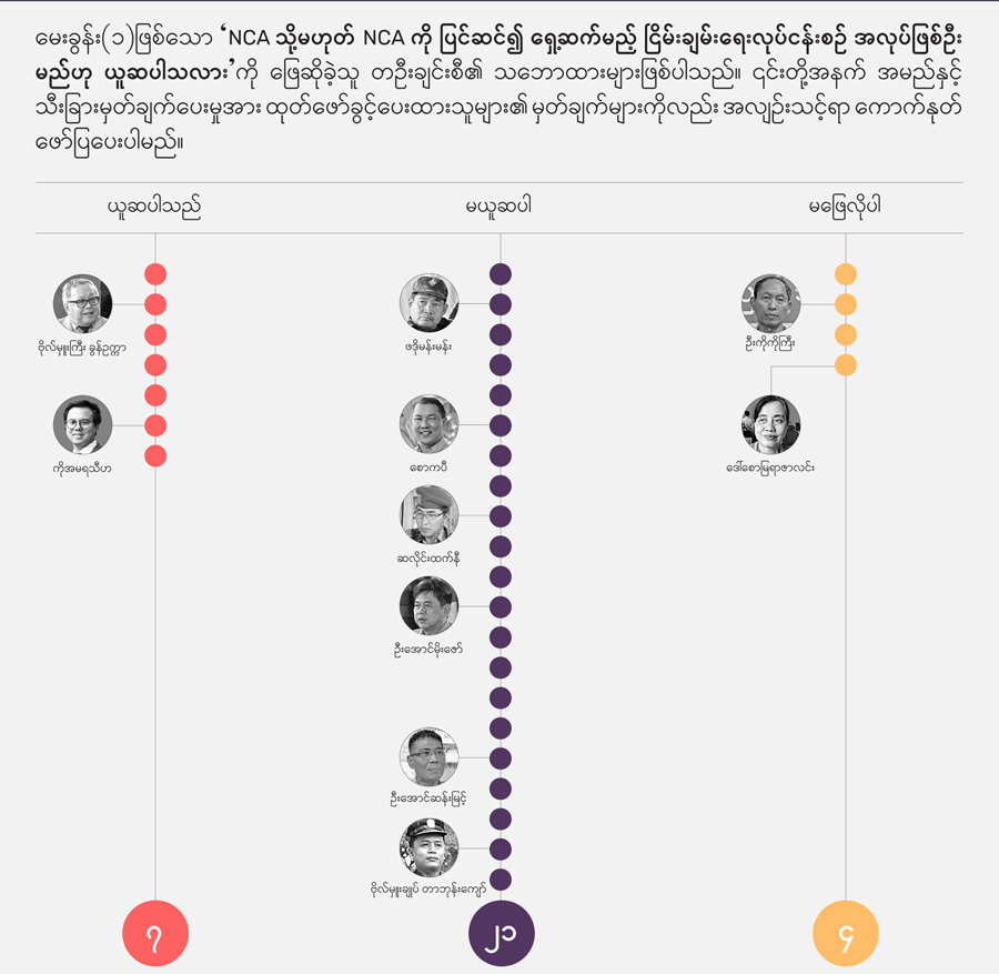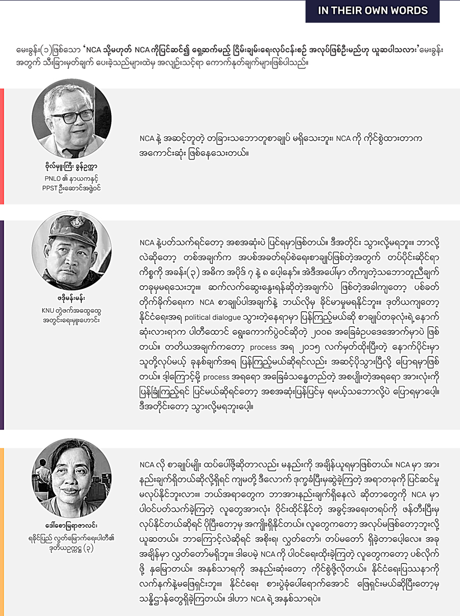 ✤ မိတ်ဆက် NCA ခြောက်နှစ်ပြည့်နှင့် မြန်မာ့ ငြိမ်းချမ်းရေး ဖြစ်စဉ်အတွက် အထူးကဏ္ဍ (Special Features) အဖြစ် အကြောင်းအရာ ငါးခုကိုအပိုင်းလိုက်ခွဲ၍ ISP-Myanmar က ဖော်ပြနေခြင်း ဖြစ်ပါသည်။ ပထမဆုံး အနေဖြင့် “မြန်မာ့ငြိမ်းချမ်းရေး ဖြန်တန်ခြေ များအားဖြန့်ထွက် စဉ်းစားခြင်း” (Scenario Thinking) ကို အောက်တိုဘာ ၁၇ ရက်တွင် ဖော်ပြခဲ့ပြီး၊ “မြန်မာ့ ငြိမ်းချမ်းရေး လုပ်ငန်းစဉ်- အခင်းအကျင်းသစ်နှင့် အသစ်အသစ်သော အင်အားစုများ” အကြောင်း ပိုင်းခြားစိတ်ဖြာသုံးသပ်ချက် (Analysis) ကို အောက်တိုဘာ ၂၀ ရက်က ဖော်ပြခဲ့ပါသည်။ ယခု “စစ်အာဏာသိမ်းပြီးနောက်ပိုင်း ငြိမ်းချမ်းရေးဖြစ်စဉ်နှင့် ပတ်သက်၍ ပြန်လှန်ဆန်းစစ်သော မေးခွန်း ၇ ခု” (Key Questions) ကို ငြိမ်းချမ်းရေး ကြိုးပမ်းမှု ဖြစ်စဉ်တွင် ပါဝင်ခဲ့သူများ၊ သုတေသီများနှင့် လေ့လာသုံးသပ်သူ စုစုပေါင်း ၃၂ ဦးအား ISP-Myanmar က မေးမြန်းခဲ့ပြီး၊ ၎င်းတို့၏ ဖြေဆိုချက်များကို ဖော်ပြခြင်းဖြစ်ပါသည်။ နောက်ရက်များတွင် ငြိမ်းချမ်းရေးဖြစ်စဉ်အတွက် သိသင့်သမျှအကြောင်းချင်းရာ (Backgrounder) နှင့် သိထားသင့်သော ဒေတာအချက်အလက်များအား စုစည်းဖော်ပြမည့် Visual Story တို့ကိုလည်း ဖော်ပြသွားမည် ဖြစ်သည်။