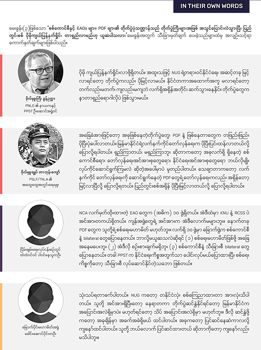 NCA မတိုင်ခင် ငြိမ်းချမ်းရေးဆွေးနွေးမှုမှာ EAOs တဖွဲ့ချင်းစီနဲ့ စကားပြောပြီး နှစ်ဘက်အပစ်ရပ်ရေး သဘောတူညီချက် အရင်လုပ်ခဲ့တာတွေ ရှိပါတယ်။ နောက်ပိုင်းမှာ EAOs အဖွဲ့တွေ ပေါင်းစည်းပြီး NCA လမ်းကြောင်း ဖြစ်လာပါတယ်။ လက်ရှိမှာလည်း NCA လက်မှတ်ထိုးမထားပေမဲ့ ပဏာမ အပစ်ရပ်သဘောတူစာချုပ် လုပ်ထားတဲ့ EAOs တွေ ရှိသလို၊ NCA မဟုတ်တဲ့ စာချုပ်သစ်ဖော်ဆောင်ဖို့ အရေးဆိုထားတဲ့ မြောက်ပိုင်း မဟာမိတ်အဖွဲ့ (FPNCC) လို အဖွဲ့တွေလည်း ရှိနေပါတယ်။ NLD အစိုးရလက်ထက် NCA အကျပ်ရိုက်မှု deadlock ဖြစ်ချိန်ကလည်း ငြိမ်းချမ်းရေးဖော်ဆောင်မှု ရှေ့ရောက်စေဖို့ NCA ပြင်ပ စာချုပ် ဒါမှမဟုတ် သဘောတူညီချက်ယူပြီးလုပ်ဖို့ လမ်းစဖော်တာမျိုးရှိခဲ့ပေမဲ့ အပြီး မသတ်နိုင်ခင်မှာပဲ စစ်အာဏာသိမ်းမှုဖြစ်ခဲ့ပါတယ်။ စစ်အာဏာသိမ်းပြီးနောက်ပိုင်း NCA အကောင်အထည်ဖော်မှု ရပ်ဆိုင်းသွားပြီး ရွေးကောက်ခံအစိုးရနဲ့ လွှတ်တော် မရှိတော့တဲ့ အခြေအနေမှာ “EAOs တွေအနေနဲ့ တပေါင်းတစည်းဖြစ်စေ၊ အစုအဖွဲ့လိုက် ဖြစ်စေ၊ သီးသန့်တဖွဲ့ချင်းဖြစ်စေ စစ်ကောင်စီနဲ့ အပစ်အခတ်ရပ်စဲရေး ဒါမှမဟုတ် ငြိမ်း ချမ်းရေးစာချုပ်သစ် ချုပ်ဆိုလာမည်လား} ဆိုတာ အဓိကကျတဲ့မေးခွန်းတခု ဖြစ်ပါတယ်။