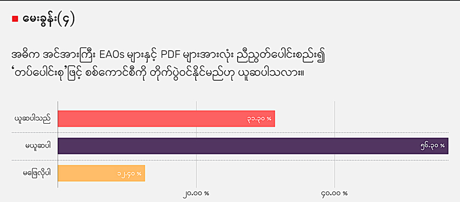 အဲဒီမေးခွန်းကို ဖြေဆိုရာမှာ “တပ်ပေါင်းစု” နဲ့ တိုက်ပွဲဝင်နိုင်မယ်လို့ ယူဆမှုက ၃၁ ဒသမ ၃ ရာခိုင်နှုန်းရှိပြီး ၅၆ ဒသမ ၃ ရာခိုင်နှုန်းက မယူဆဘူးလို့ ဖြေဆိုခဲ့ပါတယ်။ ကျန် ၁၂ ဒသမ ၄ ရာခိုင်နှုန်း က ဖြေကြားလိုခြင်း မရှိခဲ့ပါဘူး။ မယူဆဘူးလို့ ပြောသူတွေက EAOs နဲ့ PDF တွေအကြား “တပ်ပေါင်းစု” ဖြစ်လာဖို့အတွက် ပြောဖို့အလွန်စောပြီး ခက်ခဲနိုင်ကြောင်း၊ သမိုင်းကြောင်းများအရ “တပ်ပေါင်းစု” တွေ တာရှည်ခံလေ့မရှိတာကို ထောက်ပြကြပါတယ်။ တခါ အခုကာလမှာလည်း အမျိုးသားညီညွတ်ရေး အတိုင်ပင်ခံ ကောင်စီ (NUCC) မှာ အခက်အခဲများစွာရှိနေတယ်လို့ ဆိုပါတယ်။ ဒါ့အပြင် EAOs တွေနဲ့ အသစ်ပေါ်ပေါက်လာတဲ့ PDF တွေအကြား စစ်ရေးရည်မှန်းချက်တွေ မတူညီနိုင်ကြောင်း ပြောကြပါတယ်။ ယူဆတယ်လို့ မှတ်ချက်ပေးကြသူတွေကတော့ EAOs တွေနဲ့ PDFs တွေ ပေါင်းစည်းဖို့ လူထုက ဖိအားပေးနေတာကြောင့် မကြာခင် စုစည်းမှုပုံစံသစ်တွေ မြင်ရနိုင်တယ်လို့ ဆိုပါတယ်။ ဒါပေမဲ့ လိုအပ်တဲ့ နိုင်ငံရေးဆွေးနွေးမှုတွေဟာ အင်အားကြီး EAOs တွေ အကြားမှာ ပြီးပြတ်ခြင်းမရှိသေးသလို၊ ဦးစွာပါဝင်လာတဲ့ EAOs တွေ အစဉ်သဖြင့် ဆက်ပါနိုင်ရေးဟာ အမျိုးသားညီညွတ်ရေးအစိုးရ (NUG) ရဲ့ ဆွေးနွေးညှိနှိုင်းမှုနဲ့ ကတိကဝတ်အပေါ်မှာသာ မူတည်တယ်လို့ သုံးသပ်ကြပါတယ်။