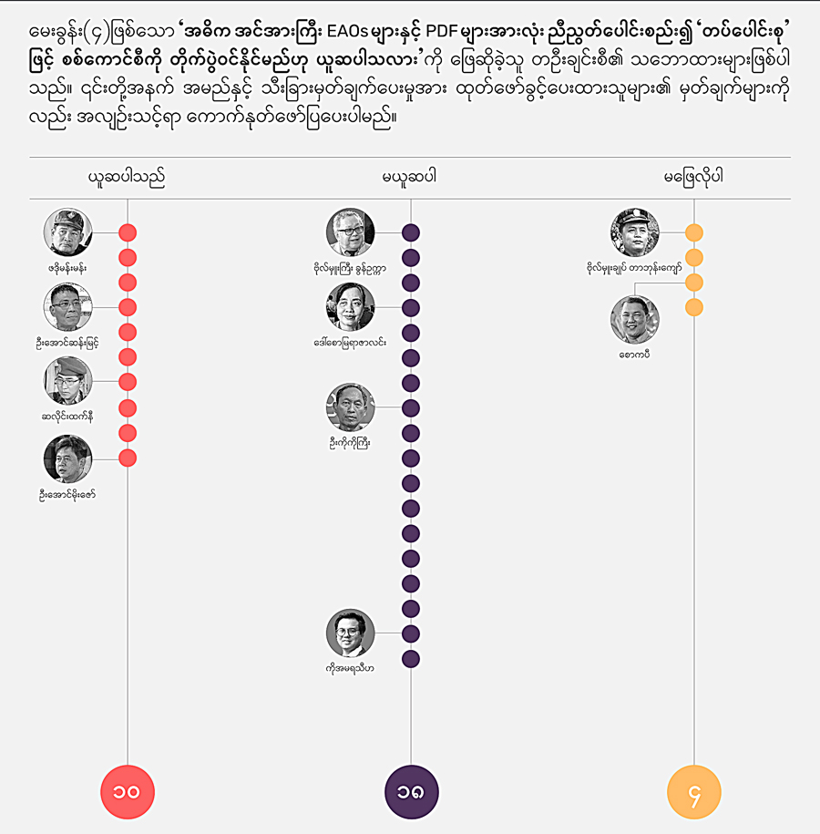 အင်အားကြီးမားတဲ့ EAOs တွေ အပါအဝင် အားလုံးပေါင်းစည်းထားတဲ့ “တပ်ပေါင်းစု” နဲ့ စစ်အာဏာရှင်ကို တိုက်ပွဲဝင်၊ အောင်ပွဲခံနိုင်ရေးကို နှစ် ၇၀ ကျော်ကြာ မြန်မာပြည်တွင်း စစ် ကာလအတွင်း တော်လှန်ရေးအင်အားစုတွေ အကြိမ်ကြိမ် ကြိုးစားခဲ့ကြဖူးပါတယ်။ ဒါပေမဲ့ “တပ်ပေါင်းစု” နဲ့ တိုက်ပွဲဝင်နိုင်ရေးက မျှော်မှန်းကြိုးစားသလို မဖြစ်ခဲ့ဘဲ အကြောင်းအမျိုးမျိုးကြောင့် ပျက်ပြယ်ခဲ့တာတွေ ရှိခဲ့ပါတယ်။ အခု စစ်အာဏာရှင်စနစ် ဆန့်ကျင်ရေး လက်နက်ကိုင်တော်လှန်မှုမှာလည်း အင်အားကြီး EAOs တွေအားလုံးပါဝင် တဲ့ “တပ်ပေါင်းစု” နဲ့ တိုက်ပွဲဝင်နိုင်ရေးက မျှော်မှန်းချက်တခု ဖြစ်လာပါတယ်။ တချိန်ထဲမှာပဲ အားလုံးပါဝင်သော အမျိုးသားညီညွတ်ရေး အတိုင်ပင်ခံကောင်စီ (NUCC) က ဆုံချက်ဖြစ်လာပြီး ဖက်ဒရယ်ဒီမိုကရေစီပဋိညာဉ် (Federal Charter) အသက်ဝင်လာမယ် ဆိုရင် အင်အားကြီး EAOs တွေနဲ့ “တပ်ပေါင်းစု” ဖွဲ့စည်းဖို့ ဆွဲဆောင်နိုင်မယ့် မြော်မြင်ချက်တွေ ရှိနေပါတယ်။ ဒါကြောင့် “အဓိက အင်အားကြီး EAOs တွေနဲ့ PDF တွေအားလုံး ညီညွတ်ပေါင်းစည်းပြီး “တပ်ပေါင်းစု” နဲ့ စစ်ကောင်စီကို တိုက်ပွဲဝင်နိုင်မလား” ဆိုတာက အဓိကကျလာတဲ့ မေးခွန်းတခု ဖြစ်ပါတယ်။