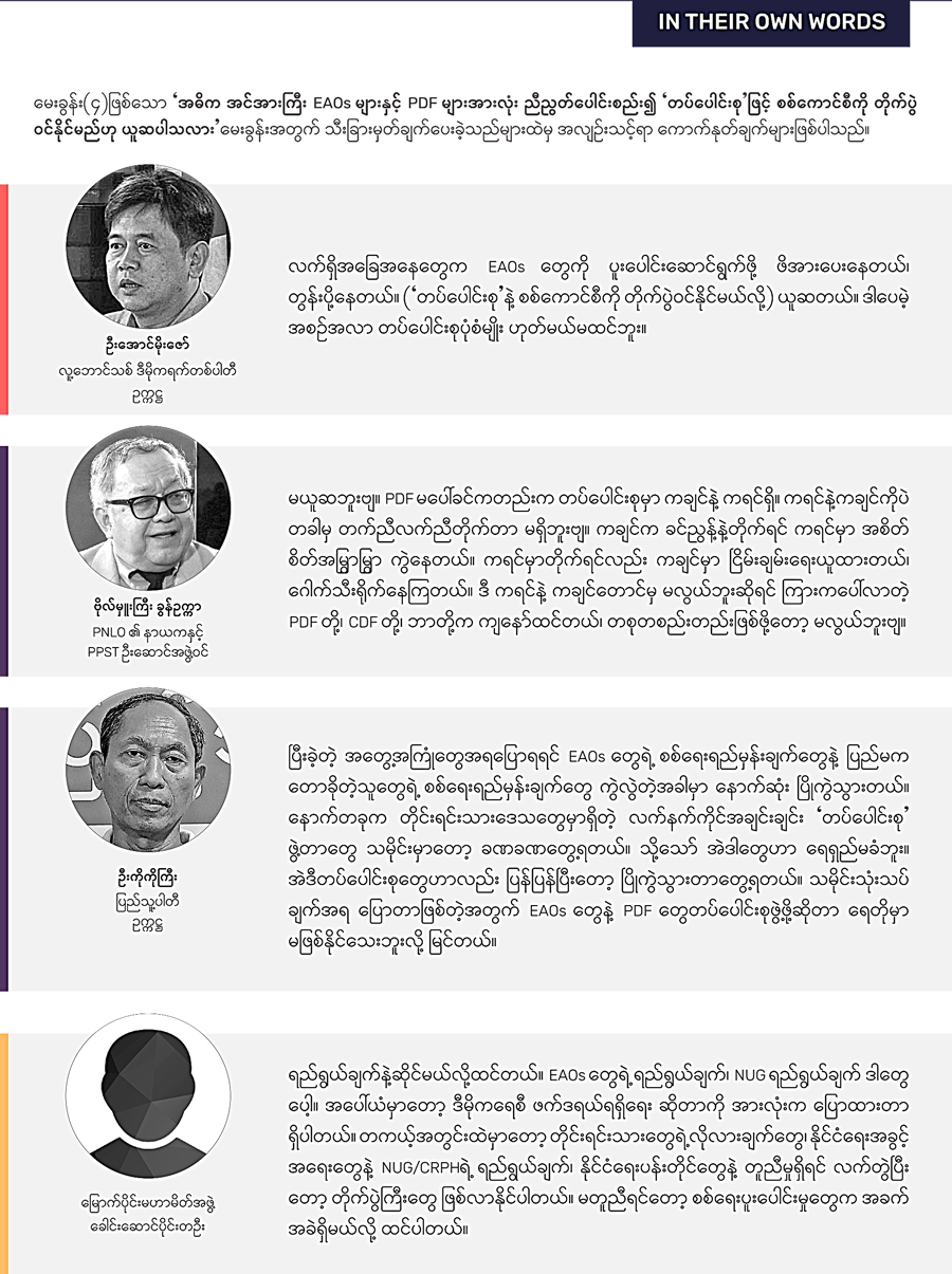 အဓိက အင်အားကြီး EAOs များနှင့် PDF များ အားလုံး ညီညွတ်ပေါင်းစည်း၍ “တပ်ပေါင်းစု” ဖြင့် စစ်ကောင်စီကို တိုက်ပွဲဝင်နိုင်မည်ဟု ယူဆပါသလား။
