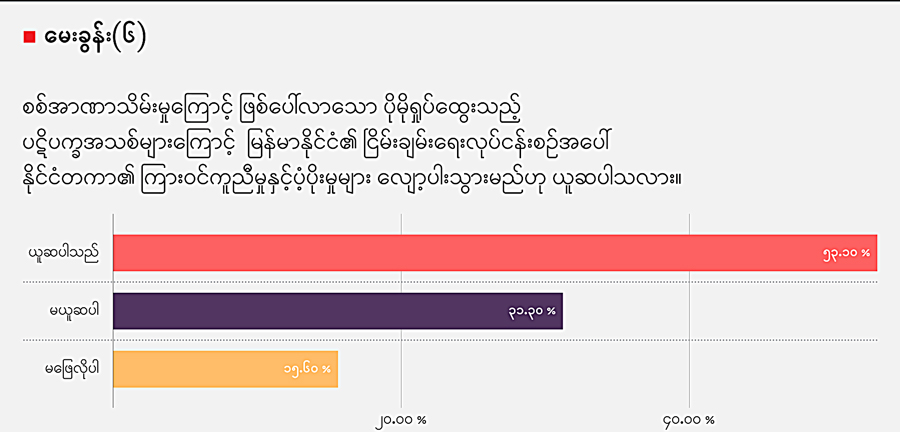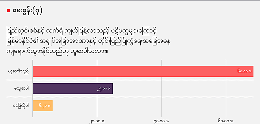 ပြည်တွင်းစစ်နှင့် လက်ရှိ ကျယ်ပြန့်လာသည့် ပဋိပက္ခများကြောင့် မြန်မာနိုင်ငံ၏ အချုပ်အခြာအာဏာနှင့် တိုင်းပြည်ပြိုကွဲရေးအခြေအနေ ကျရောက်သွားနိုင်သည်ဟု ယူဆပါသလား။