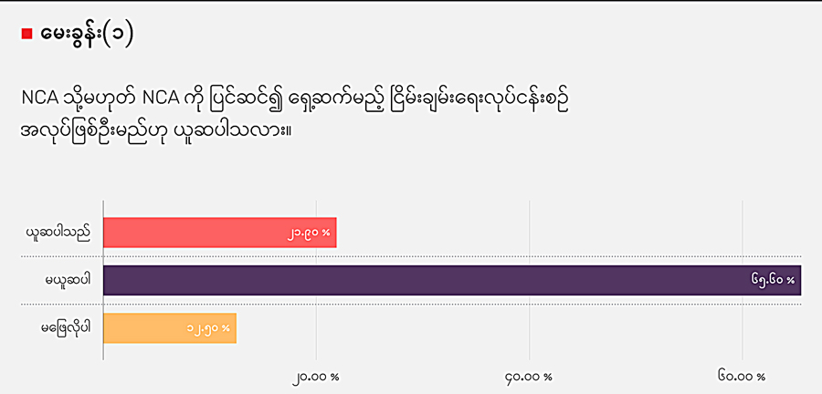 ဒီမေးခွန်းကို ဖြေဆိုကြရာမှာ NCA ဟာ အလုပ်မဖြစ်နိုင်တော့ဘူးလို့ ယူဆမှု ၆၆ ရာခိုင်နှုန်းအထိရှိခဲ့ပြီး အများဆုံးဖြစ်ခဲ့ပါတယ်။ အလုပ်ဖြစ်သေးတယ်လို့ ယူဆမှု ၂၂ ရာခိုင်နှုန်း ရှိပြီး သဘောထားမှတ်ချက်မပေးလိုမှု ၁၂ ရာခိုင်နှုန်း ရှိခဲ့ပါတယ်။ ဒါကြောင့် NCA အခြေပြု ငြိမ်းချမ်းရေးလုပ်ငန်းစဉ်အပေါ် အစဉ်တစိုက် ပါဝင်ပတ်သက်နေကြသူများ ကိုယ်တိုင် ယုံကြည်မှု လျော့ပါးလာတာကို တွေ့ရပါတယ်။ NCA စာချုပ် လက်မှတ်ထိုး ထားတဲ့ EAOs တွေထဲမှာတောင် NCA အလုပ်မဖြစ်နိုင်တော့ဘူးလို့ ဖြေဆိုကြတာရှိပါတယ်။ NCA ကို လိုအပ်တဲ့ ပြင်ဆင်မှုတွေလုပ်နိုင်ရင် ဆက်သွားနိုင်မယ်လို့ မျှော်လင့်တာတွေ ရှိကြသလို တဖက်မှာလည်း အရင်ကတည်းက အကောင်အထည်ဖော်မှု အလွန်အားနည်းတဲ့ သဘောတူညီချက် ဖြစ်နေတဲ့အပြင် ရွေးကောက်ခံအစိုးရ၊ လွှတ်တော် အစရှိတဲ့ ယန္တရားတွေ မရှိတော့တာကြောင့် ရှေ့ဆက်ဖို့ မဖြစ်နိုင်တော့ဘူးလို့ ယူဆကြတာကိုတွေ့ ရပါတယ်။