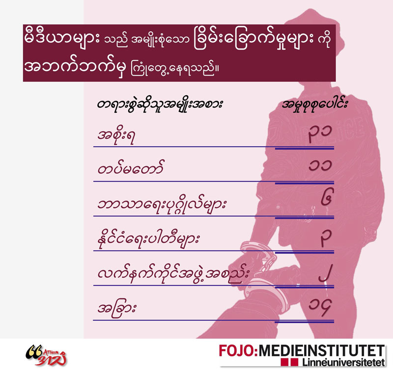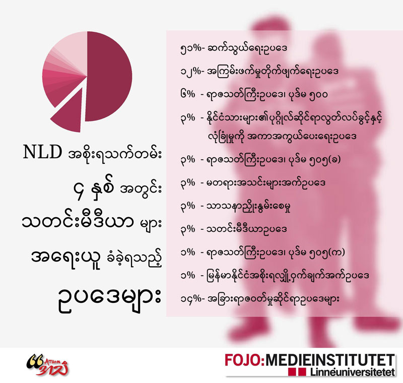 ယခုဆောင်းပါးတွင် NLD အစိုးရလက်ထက် သတင်းမီဒီယာလွတ်လပ်ခွင့်နှင့်ပတ်သက်၍ သတင်းသမားများကို တရားစွဲဆိုရာ၌ အသုံး ပြုလေ့ရှိသည့် ဥပဒေများ ပြုပြင်ပြောင်းလဲရေး၊ သတင်းသမားများအပေါ် တရားစွဲဆိုမှု အရေအတွက်နှင့် သတင်း အချက်အလက် ရပိုင်ခွင့်အခြေအနေတို့ပေါ်တွင်အခြေခံကာ လေ့လာသုံးသပ်ထား ပါသည်။