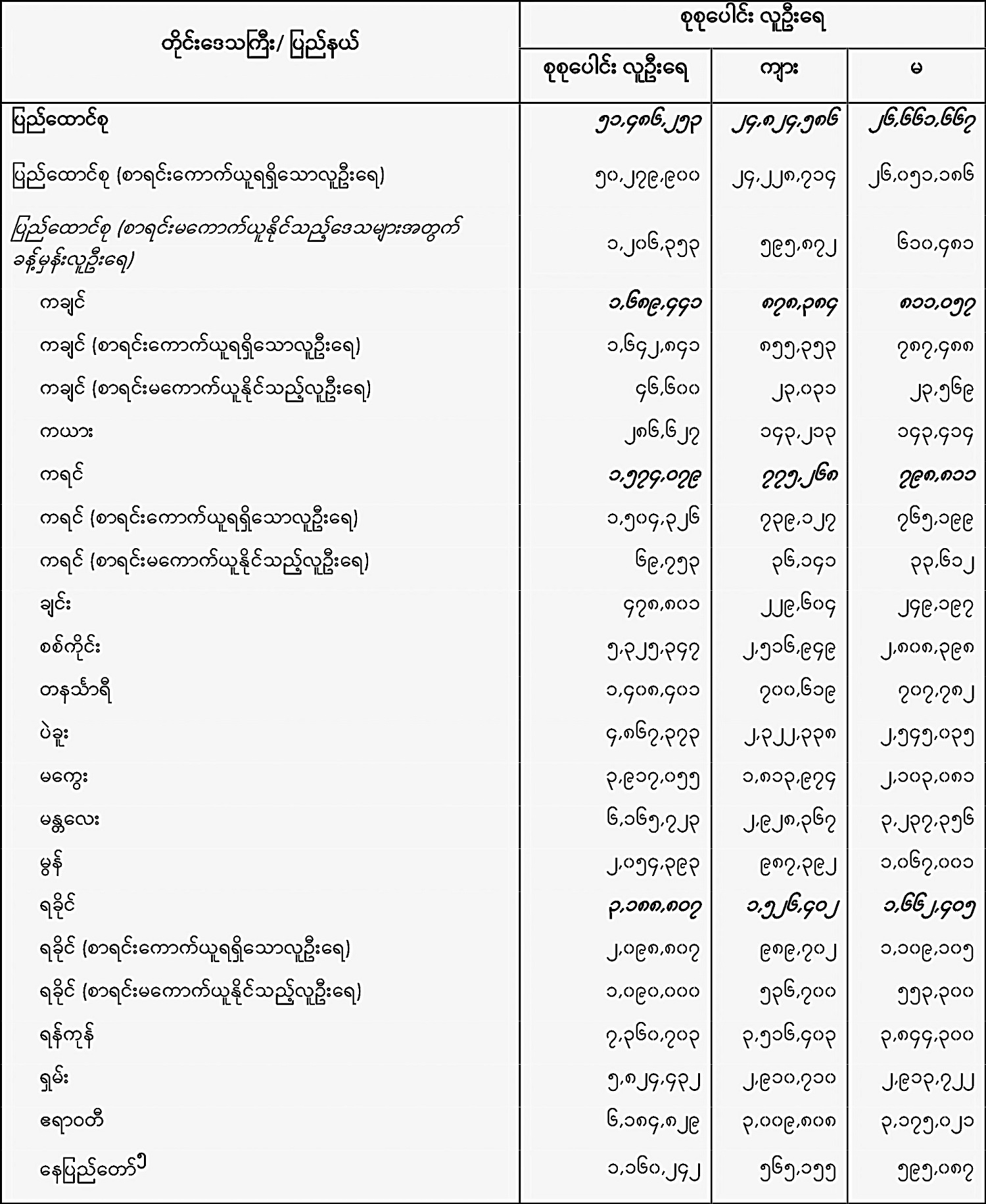 -အထက်ဖော်ပြပါ ကိန်းဂဏန်း အချက်အလက်များအား လူဝင်မှုကြီးကြပ်ရေးနှင့် ပြည်သူ့အင်အားဝန်ကြီးဌာန၊ ပြည်သူ့အင်အားဦးစီးဌာနက ၂၀၁၅ ခုနှစ် မေတွင် ထုတ်ဝေခဲ့သော “၂၀၁၄ ခုနှစ် မြန်မာနိုင်ငံ လူဦးရေနှင့် အိမ်အကြောင်းအရာ သန်းခေါင်စာရင်း” ပြည်ထောင်စု သန်းခေါင်စာရင်း အစီရင်ခံစာ အတွဲ(၂)၊ စာမျက်နှာ ၁၉ တွင် ဖော်ပြထားချက်အား ပြန်လည်ဖော်ပြခြင်း ဖြစ်ပါသည်။