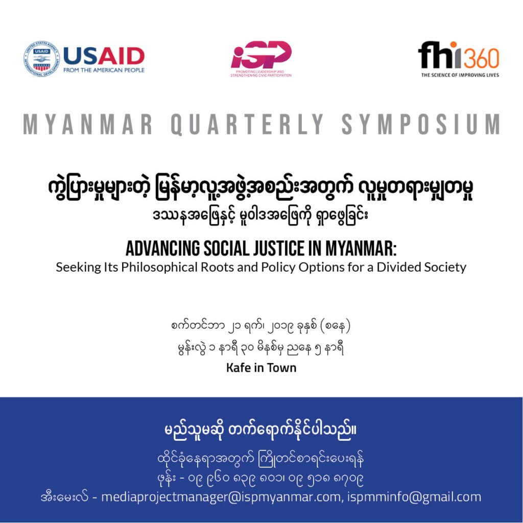 စက်တင်ဘာ ၂၁ ရက်တွင် ပြုလုပ်မည့် Myanmar Quarterly Symposium ၌ လူမှုတရားမျှတမှု (social justice) အကြောင်း ဆွေးနွေးရာတွင် နောက်ခံပြုမည့် အကြောင်းအရာ နှစ်ခုရှိပါမည်။