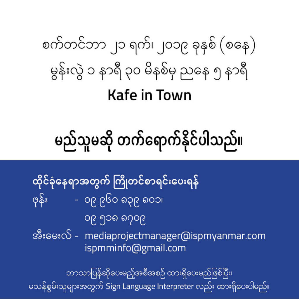 ► တက်ရောက်လိုသူများအနေဖြင့် – ဖုန်း – ဝ၉ ၉၆၀ ၈၃၉ ၈၀၁၊ ဝ၉ ၅၁၈၈ ၇၀၉ များသို့ ဆက်သွယ်၍ လည်းကောင်း၊ အီးမေးလ်- mediaprojectmanager@ispmyanmar.com, ispmminfo@gmail.com သို့ အမည်စာရင်း ပေးပို့၍ လည်းကောင်း ကြိုတင် စာရင်းပေးသွင်းနိုင်ပါသည်။