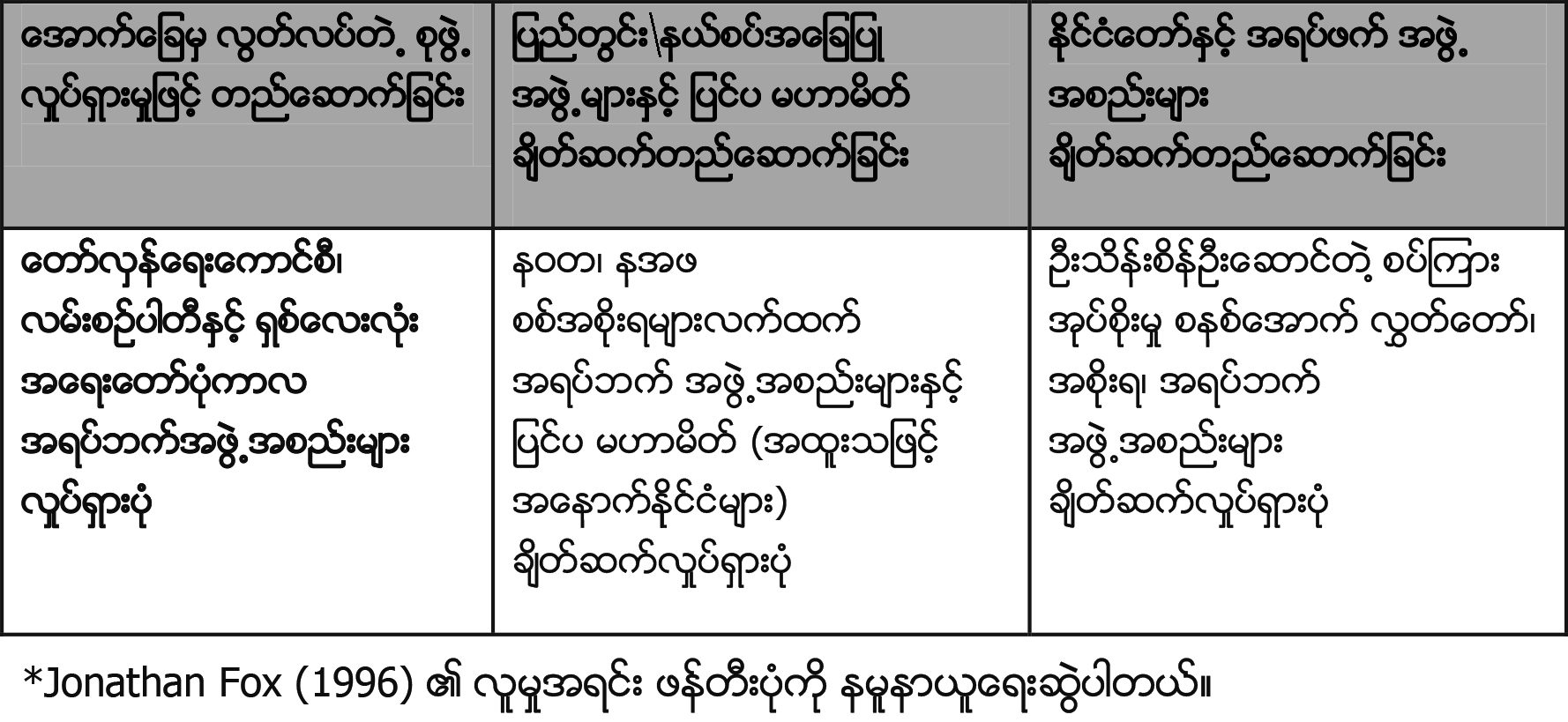 ၁၀  ဒီ သုံးသပ်ချက်ကို Jonathan Fox (1996) ရဲ့ လူမှုအရင်း တည်ဆောက်ပုံကို နမူနာယူ ပြုလုပ်ပါတယ်။