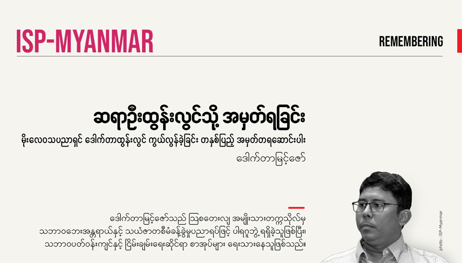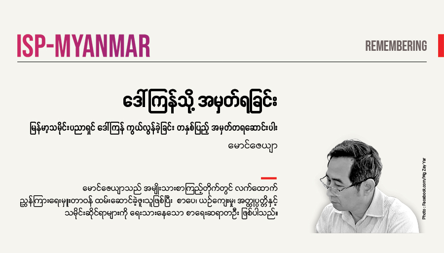 3 Nov 2020 Articles • Latest Notes & Updates ချည်သောကြိုးများ ဖြတ်ခဲ့ပါ… (မီဒီယာလွတ်လပ်ခွင့်နှင့် ပြောင်းလဲရမည့်ဥပဒေများ) အယ်ဒီတာမှတ်ချက် ISP-Myanmar အနေဖြင့် မြန်မာနိုင်ငံကို ရုန်းထကြံ့ခိုင်မှု အားကောင်းပြီး သည်းခံစိတ်ကြီးမားသော လူ့အဖွဲ့အစည်းတရပ် ပေါ်ထွန်းလာရေးအတွက် မြော်မြင်ဆောင်ရွက်လျက်ရှိသည်။ ထို့အတူ အစိုးရသည် လည်း တာဝန်ယူမှု၊ တာဝန်ခံမှုရှိသည့်အပြင် ပြည်သူအားလုံးပါဝင်မှုကို လမ်းဖွင့်ပေးသော အစိုးရတရပ် ဖြစ်ပေါ်ရေးကို ဦးတည်ပါသည်။ အဆိုပါ ဦးတည်ချက်၊ မြော်မြင်ချက်များနှင့် ပတ်သတ်၍ ရှုထောင့်စုံ အမြင်များ ထုတ်ဖော်ခွင့်ရရေး၊ ထိုအမြင်များပေါ် အခြေခံ၍ ဆီလျော် ထိရောက်မည့် မူဝါဒများ ပေါ်ထွန်း ရေးကို အားပေးပါသည်။ သို့ဖြစ်၍ ပြင်ပသုတေသီများ၊ လှုပ်ရှား ဆောင်ရွက်နေသူများကို ဖိတ်ခေါ်၍ သဘောထားအမြင် ဆောင်းပါးများ ရေးသားရန်တောင်းခံပါသည်။ မတူကွဲပြားသည့် အမြင်များကို ကျယ်ကျယ်ပြန့်ပြန့် ထည့်သွင်းစဉ်းစား၍ မူဝါဒများ ချမှတ်နိုင်စေရေး ရည်သန်ပါသည်။ ဆောင်းပါးများပါ အမြင်သဘောထားများမှာ ဆောင်းပါးရှင်များ၏ အာဘော်သာဖြစ်ပါသည်။ ယခုဆောင်းပါးတွင် […]