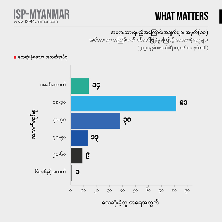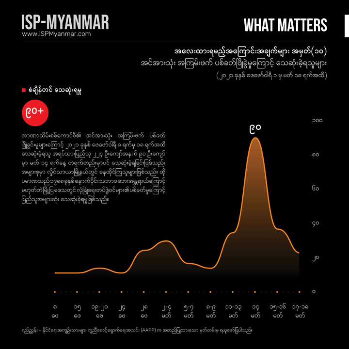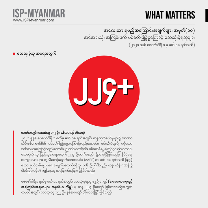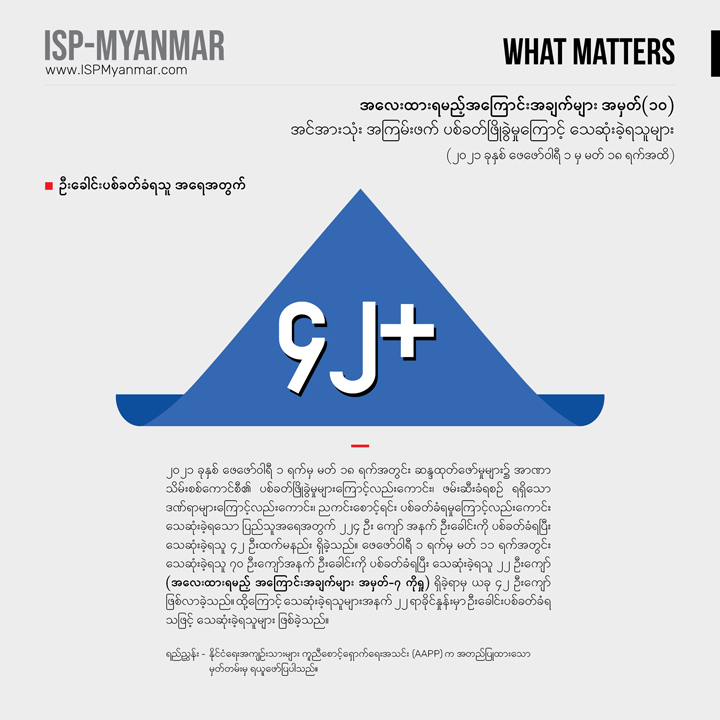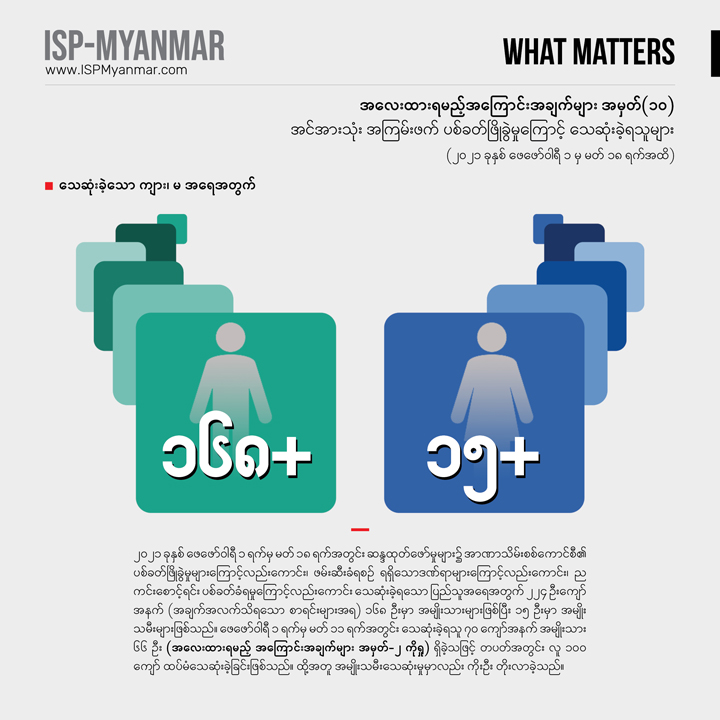 လက်ရှိ တိုင်းပြည်မှာ ဖြစ်ပေါ်နေတဲ့ စစ်အာဏာသိမ်းမှုနဲ့ ပြည်သူတွေ အံတုတဲ့ လူထု လှုပ်ရှားမှုတွေကို သုတေသန ရှုထောင့်ကနေ အကျိုးပြုနိုင်စေဖို့ အလေးထားရမယ့် အကြောင်းအချက်များ “What Matters” ဆိုတဲ့ ခေါင်းစဉ်နဲ့ ကဏ္ဍတခုကို ISP-Myanmar က ဖော်ပြနေတာပါ။ ဒီကဏ္ဍဟာ သုတေသန တွေ့ရှိချက်တွေကို အခြေခံပြီး တင်ပြပုံ လွယ်လွယ်နဲ့ ဖတ်ချိန် တိုတိုအတွင်း အလေးထားသင့်တဲ့ ကိစ္စရပ်တွေနဲ့ ဒေတာ အချက်လက်တွေကို လူတိုင်း လက်လှမ်း မီနိုင်အောင် မိတ်ဆက်ပေးသွားဖို့ ရည်ရွယ်ပါတယ်။ ကိစ္စရပ်မိတ်ဆက် ချက်တွေကို အမှန်၊ အမှား ယတိပြတ်သဘော ရှုမြင်ဖို့ မဟုတ်ဘဲ ဦးနှောက် နှိုးဆွဖို့ စဉ်းစား ဆင်ခြင်စရာအဖြစ် ဖော်ပြလိုတာ ဖြစ်ပါတယ်။ ဒေတာ အချက်လက် တင်ပြချက်တွေကိုတော့ ပိုမှန်ကန် ပြည့်စုံအောင် ဖြည့်စွက်သွား ဖို့ ရည်ရွယ်ပါတယ်။