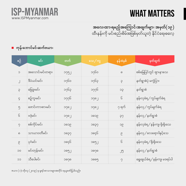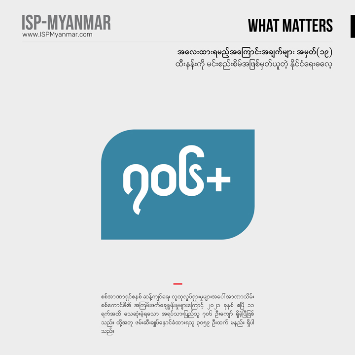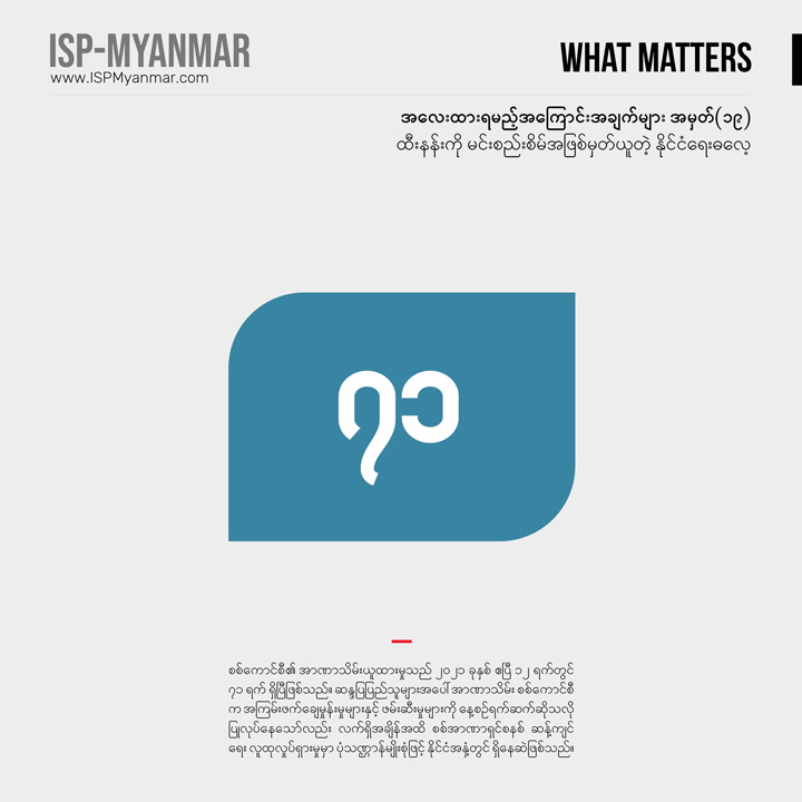 လက်ရှိ တိုင်းပြည်မှာ ဖြစ်ပေါ်နေတဲ့ စစ်အာဏာသိမ်းမှုနဲ့ ပြည်သူတွေ အံတုတဲ့ လူထု လှုပ်ရှားမှုတွေကို သုတေသန ရှုထောင့်ကနေ အကျိုးပြုနိုင်စေဖို့ အလေးထားရမယ့် အကြောင်းအချက်များ “What Matters” ဆိုတဲ့ ခေါင်းစဉ်နဲ့ ကဏ္ဍတခုကို ISP-Myanmar က ဖော်ပြနေတာ ဖြစ်ပါတယ်။ ဒီကဏ္ဍဟာ သုတေသန တွေ့ရှိချက်တွေကို အခြေခံပြီး တင်ပြပုံ လွယ်လွယ်နဲ့ ဖတ်ချိန် တိုတိုအတွင်း အလေးထားသင့်တဲ့ ကိစ္စရပ်တွေနဲ့ ဒေတာ အချက်လက်တွေကို လူတိုင်း လက်လှမ်း မီနိုင်အောင် မိတ်ဆက်ပေးသွားဖို့ ရည်ရွယ်ပါတယ်။ ကိစ္စရပ်မိတ်ဆက် ချက်တွေကို အမှန်၊ အမှား ယတိပြတ်သဘော ရှုမြင်ဖို့ မဟုတ်ဘဲ ဦးနှောက် နှိုးဆွဖို့ စဉ်းစား ဆင်ခြင်စရာအဖြစ် ဖော်ပြလိုတာ ဖြစ်ပါတယ်။ ဒေတာ အချက်လက် တင်ပြချက်တွေကိုတော့ ပိုမှန်ကန် ပြည့်စုံအောင်ဖြည့်စွက်သွားဖို့ ရည်ရွယ်ပါတယ်။