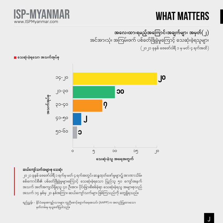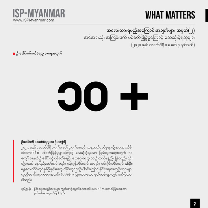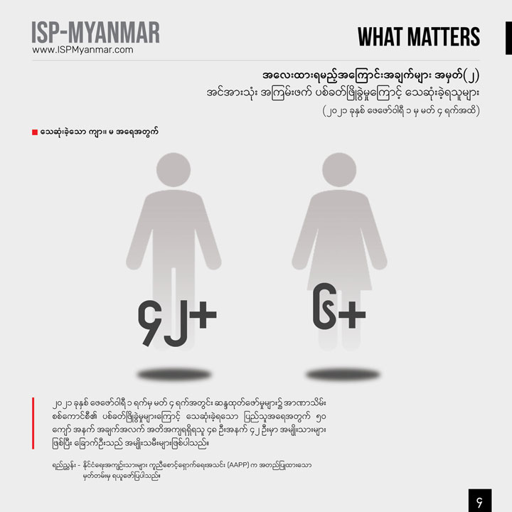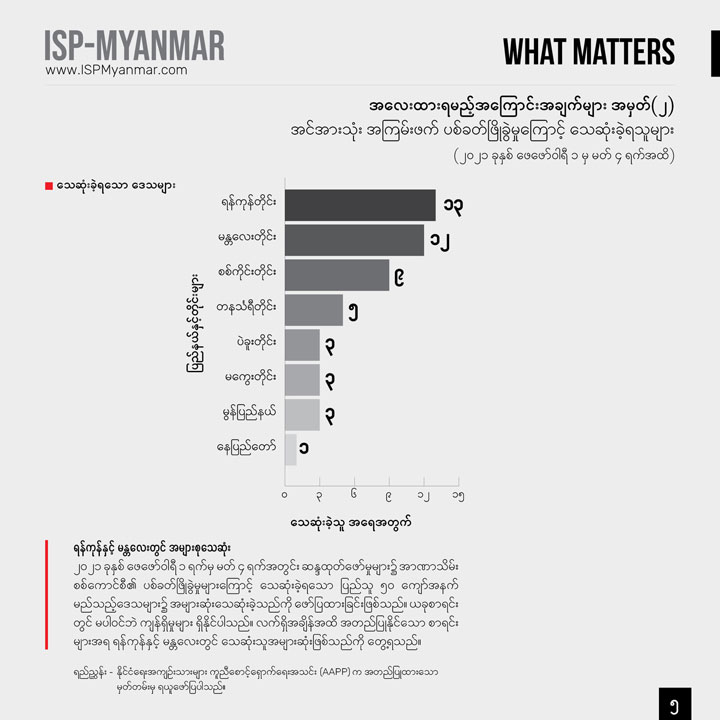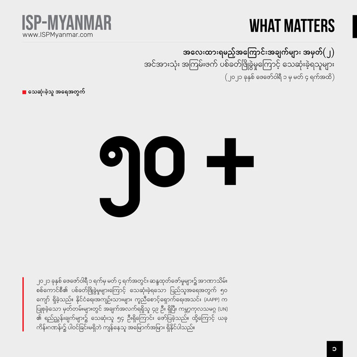 လက်ရှိ တိုင်းပြည်မှာ ဖြစ်ပေါ်နေတဲ့ စစ်အာဏာသိမ်းမှုနဲ့ ပြည်သူတွေ အံတုတဲ့ လူထု လှုပ်ရှားမှုတွေကို သုတေသန ရှုထောင့်ကနေ အကျိုးပြုနိုင်စေဖို့ အလေးထားရမယ့် အကြောင်းအချက်များ “What Matters” ဆိုတဲ့ ခေါင်းစဉ်နဲ့ ကဏ္ဍသစ်တခုကို ISP-Myanmar က တင်ဆက်သွားပါမယ်။ ဒီကဏ္ဍဟာ သုတေသန တွေ့ရှိချက်တွေကို အခြေခံပြီး တင်ပြပုံ လွယ်လွယ်နဲ့ ဖတ်ချိန် တိုတိုအတွင်း အလေးထားသင့်တဲ့ ကိစ္စရပ်တွေနဲ့ ဒေတာ အချက်လက်တွေကို လူတိုင်း လက်လှမ်း မီနိုင်အောင် မိတ်ဆက်ပေးသွားဖို့ ရည်ရွယ်ပါတယ်။ ကိစ္စရပ်မိတ်ဆက် ချက်တွေကို အမှန်၊ အမှား ယတိပြတ်သဘော ရှုမြင်ဖို့ မဟုတ်ဘဲ ဦးနှောက် နှိုးဆွဖို့ စဉ်းစား ဆင်ခြင်စရာအဖြစ် ဖော်ပြလိုတာ ဖြစ်ပါတယ်။ ဒေတာ အချက်လက် တင်ပြချက်တွေကိုတော့ ပိုမှန်ကန် ပြည့်စုံအောင်ဖြည့်စွက်သွားဖို့ ရည်ရွယ်ပါတယ်။