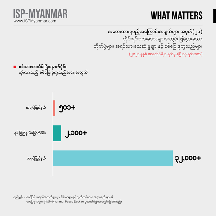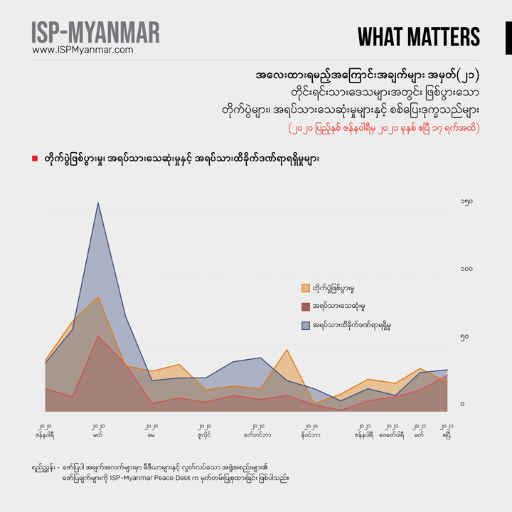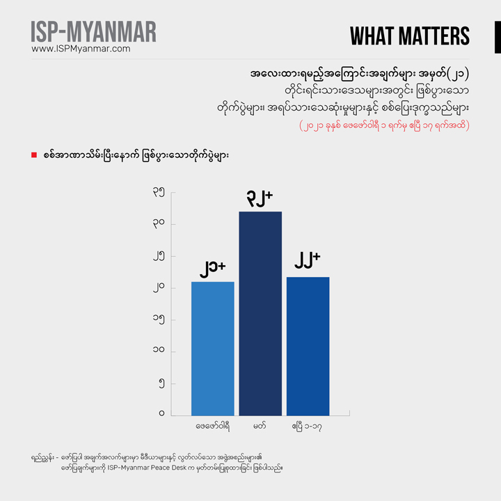 လက်ရှိ တိုင်းပြည်မှာ ဖြစ်ပေါ်နေတဲ့ စစ်အာဏာသိမ်းမှုနဲ့ ပြည်သူတွေ အံတုတဲ့ လူထု လှုပ်ရှားမှုတွေကို သုတေသန ရှုထောင့်ကနေအကျိုးပြုနိုင်စေဖို့ အလေးထားရမယ့် အကြောင်းအချက်များ “What Matters” ဆိုတဲ့ ခေါင်းစဉ်နဲ့ ကဏ္ဍတခုကို ISP-Myanmar ကဖော်ပြနေတာပါ။ ဒီကဏ္ဍဟာ သုတေသန တွေ့ရှိချက်တွေကို အခြေခံပြီး တင်ပြပုံ လွယ်လွယ်နဲ့ ဖတ်ချိန် တိုတိုအတွင်းအလေးထားသင့်တဲ့ ကိစ္စရပ်တွေနဲ့ ဒေတာ အချက်လက်တွေကို လူတိုင်း လက်လှမ်း မီနိုင်အောင် မိတ်ဆက်ပေးသွားဖို့ ရည်ရွယ်ပါတယ်။ ကိစ္စရပ်မိတ်ဆက် ချက်တွေကို အမှန်၊ အမှား ယတိပြတ်သဘော ရှုမြင်ဖို့ မဟုတ်ဘဲ ဦးနှောက် နှိုးဆွဖို့ စဉ်းစား ဆင်ခြင်စရာအဖြစ် ဖော်ပြလိုတာ ဖြစ်ပါတယ်။ ဒေတာ အချက်လက် တင်ပြချက်တွေကိုတော့ ပိုမှန်ကန် ပြည့်စုံအောင် ဖြည့်စွက်သွားဖို့ရည်ရွယ်ပါတယ်။