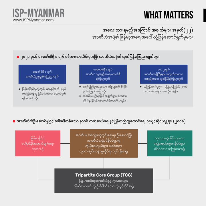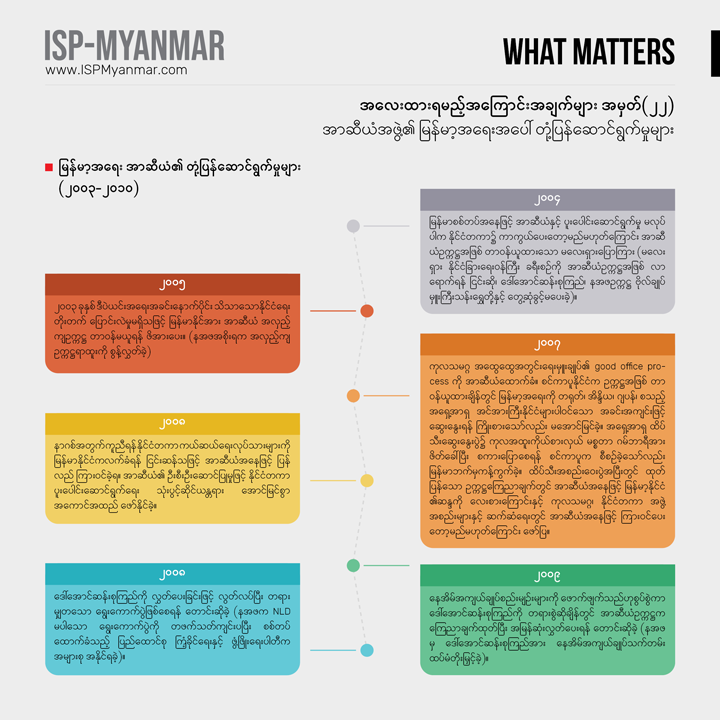 လက်ရှိ တိုင်းပြည်မှာ ဖြစ်ပေါ်နေတဲ့ စစ်အာဏာသိမ်းမှုနဲ့ ပြည်သူတွေ အံတုတဲ့ လူထု လှုပ်ရှားမှုတွေကို သုတေသန ရှုထောင့်ကနေ အကျိုးပြုနိုင်စေဖို့ အလေးထားရမယ့် အကြောင်းအချက်များ “What Matters” ဆိုတဲ့ ခေါင်းစဉ်နဲ့ ကဏ္ဍတခုကို ISP-Myanmar က ဖော်ပြနေတာ ဖြစ်ပါတယ်။ ဒီကဏ္ဍဟာ သုတေသန တွေ့ရှိချက်တွေကို အခြေခံပြီး တင်ပြပုံ လွယ်လွယ်နဲ့ ဖတ်ချိန် တိုတိုအတွင်း အလေးထားသင့်တဲ့ ကိစ္စရပ်တွေနဲ့ ဒေတာ အချက်လက်တွေကို လူတိုင်း လက်လှမ်း မီနိုင်အောင် မိတ်ဆက်ပေးသွားဖို့ ရည်ရွယ်ပါတယ်။ ကိစ္စရပ်မိတ်ဆက် ချက်တွေကို အမှန်၊ အမှား ယတိပြတ်သဘော ရှုမြင်ဖို့ မဟုတ်ဘဲ ဦးနှောက် နှိုးဆွဖို့ စဉ်းစား ဆင်ခြင်စရာအဖြစ် ဖော်ပြလိုတာ ဖြစ်ပါတယ်။ ဒေတာ အချက်လက် တင်ပြချက်တွေကိုတော့ ပိုမှန်ကန် ပြည့်စုံအောင်ဖြည့်စွက်သွားဖို့ ရည်ရွယ်ပါတယ်။