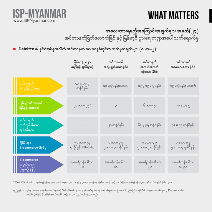 လက်ရှိ အင်တာနက် ဖြတ်တောက်မှုကြောင့် မြန်မာနိုင်ငံရဲ့ စီးပွားရေးကဏ္ဍ ဘယ်လောက် ဆုံးရှုံးမှု ဖြစ်စေနိုင်သလဲဆိုတာကို Deloitte ရဲ့ တွက်ချက်နည်းနဲ့ ခန့်မှန်းနိုင်ပါတယ်။ မြန်မာနိုင်ငံဟာ အင်တာနက် အသုံးနည်းသော နိုင်ငံအုပ်စုရဲ့ အချက်အလက်တွေနဲ့ နီးစပ်တာကို ဇယား (၂) မှာ အသေးစိတ် လေ့လာနိုင် ပါတယ်။ အင်တာနက် အသုံးနည်းတဲ့ နိုင်ငံမှာ ဖြစ်ပွားနိုင်တဲ့ ဆုံးရှုံးမှု တန်ဖိုးနဲ့ တွက်ချက်ရင် (လူ ၁၀ သန်း လျှင် တရက် ဆုံးရှုံးနှုန်း အမေရိကန်ဒေါ်လာ ခြောက်သိန်း ခန့်မှန်းတာဖြစ်ပြီး (မြန်မာ့လူဦးရေ ၅၄ သန်းခန့် နဲ့တွက်ချက်ရင်) တရက်ကို မြန်မာ့စီးပွားရေးဟာ ခန့်မှန်းခြေ အမေရိကန် ဒေါ်လာ ၃ ဒသမ ၂၄ သန်းနှုန်းနဲ့ ဆုံးရှုံးနိုင်ပါတယ်။ Statista ဝက်ဘ်ဆိုက်ရဲ့ ၂၀၂၁ ခုနှစ် ခန့်မှန်းချက်ဖြစ်တဲ့ ဒစ်ဂျစ်တယ် ကုန်သွယ်မှု ဈေးကွက်တန်ဖိုး အမေရိကန်ဒေါ်လာ ၁ ဒသမ ၁၅၂ ဘီလီယံ ကို ၃၆၅ ရက် နဲ့ စားရင် ပျမ်းမျှအားဖြင့် တရက်ကို အမေရိကန်ဒေါ်လာ ၃ ဒသမ ၁၅၆ သန်း ဆုံးရှုံးနိုင်မယ်လို့ ခန့်မှန်းနိုင်ပါတယ်။ ဒါတွေဟာ အင်တာနက်အပေါ် ပိုပြီး မှီခိုလာရတဲ့ ပညာရေးလုပ်ငန်းတွေနဲ့ အင်တာနက်ကြော်ငြာကြောင့် ရောင်းအား တက်လာတဲ့ (အင်တာနက်နဲ့ တိုက်ရိုက် မသက်ဆိုင်သော) အခြားလုပ်ငန်းတွေကို ထည့် မတွက်ရသေး ပါဘူး။ ဒါ့အပြင် တယ်လီကွန်း ကုမ္ပဏီတွေရဲ့ ဆုံးရှုံးမှုတွေလည်း မပါသေးပါဘူး။ သာဓက တခုကတော့ ဖေဖော်ဝါရီ ၁ ရက် စစ်အာဏာသိမ်းပြီးနောက်ပိုင်း တယ်လီနောကုမ္ပဏီဟာ ၂၀၂၁ ခုနှစ် ပထမသုံးလတာ ကာလအတွင်း ဆုံးရှုံးငွေ အမေရိကန်ဒေါ်လာ ၇၈၃ သန်း ရှိခဲ့ပါတယ်။ Netblocks ဝက်ဘ်ဆိုက်ရဲ့ တွက် ချက်မှုအရဆိုရင် မြန်မာနိုင်ငံမှာ အင်တာနက် တရက်လုံး ပြတ် တောက်မှု ဖြစ်ခဲ့မယ်ဆိုရင် အမေရိကန်ဒေါ်လာ ၂၄ ဒသမ ၁၉ သန်း ဆုံးရှုံးမှု ဖြစ်မယ်လို့ ခန့်မှန်းပါတယ်။ ဒီထဲကမှ ဆိုရှယ်မီဒီယာ တခုဖြစ်တဲ့ Facebook ကို ပိတ်ခဲ့မယ်ဆိုရင် တရက်ကို အမေရိကန်ဒေါ်လာ တသန်းကျော် ဆုံးရှုံးနိုင်ခြေ ရှိပြီး၊ Facebook အပြင် Youtube ကိုပါ ပိတ်ခဲ့မယ် ဆိုပါက တရက်ကို အမေရိကန်ဒေါ်လာ ၂ ဒသမ ၂ သန်းကျော် ဆုံးရှုံးနစ်နာမယ်လို့ ခန့်မှန်းထားပါတယ်။