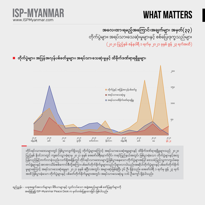 မြန်မာနိုင်ငံမှာ စစ်အာဏာ သိမ်းပြီးနောက်ပိုင်း ဖြစ်ပွားလာတဲ့ တိုက်ပွဲအခြေအနေနဲ့ အကျိုးဆက်တွေ အပါအဝင် တိုင်းရင်းသားဒေသတွေမှာ ဖြစ်ပွားနေတဲ့ တိုက်ပွဲတွေ၊ အရပ်သား ထိခိုက်သေဆုံးမှုတွေနဲ့ စစ်ဘေးရှောင်ဒုက္ခသည် အခြေအနေတွေကိုလွတ်လပ်တဲ့ သတင်းမီဒီယာတွေ၊ အထူးသဖြင့် တိုင်းရင်းသား သတင်းဌာနတွေရဲ့ မြေပြင် အခြေအနေ ဖော်ပြချက်တွေအပြင်၊မြန်မာနိုင်ငံဆိုင်ရာ ကုလသမဂ္ဂ လူသားချင်းစာနာမှုဆိုင်ရာ ညှိနှိုင်းရေးရုံး (UNOCHA Myanmar) လို ကုလသမဂ္ဂဆိုင်ရာ အဖွဲ့အစည်းတွေ၊ အခြား လွတ်လပ်သော ပြည်တွင်း ပြည်ပအဖွဲ့အစည်းတွေရဲ့ မှတ်တမ်း၊ အစီရင်ခံစာ စတာတွေနဲ့လည်း တွဲဖက်လေ့လာနိုင်ပါတယ်။