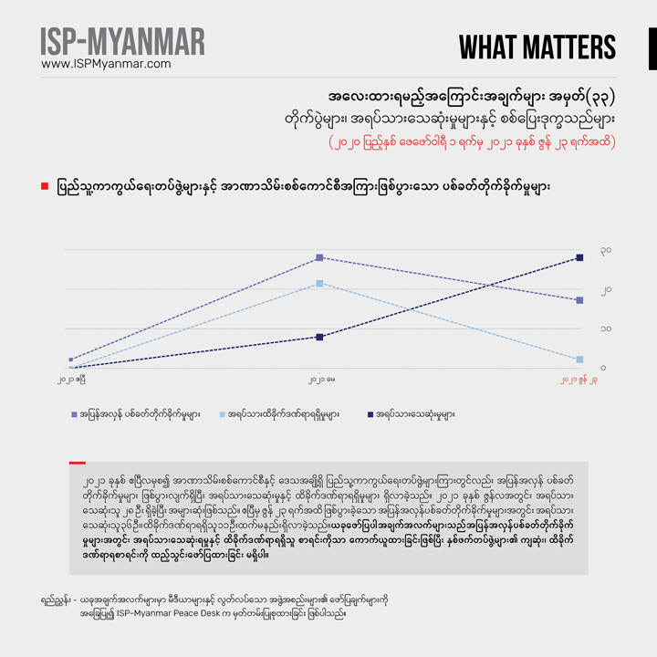 အာဏာသိမ်း စစ်ကောင်စီနဲ့ တိုင်းရင်းသား လက်နက်ကိုင် တပ်ဖွဲ့တွေအကြား၊ တိုင်းရင်းသား လက်နက်ကိုင် အဖွဲ့ အချင်းချင်းအကြား ဖြစ်ပွားနေတဲ့ တိုက်ပွဲတွေအတွင်း သေဆုံး၊ ဒဏ်ရာရရှိခဲ့ရတဲ့ အရပ်သားပြည်သူ အရေအတွက်၊ သေဆုံး ဒဏ်ရာရခဲ့ပုံဖြစ်စဉ်တွေနဲ့ စစ်ဘေး တိမ်းရှောင်နေရတဲ့ ဒုက္ခသည်ပမာဏကို လေ့လာခြင်းအားဖြင့် လက်နက်ကိုင် တပ်ဖွဲ့တွေရဲ့ လူ့အခွင့်အရေးချိုးဖောက်မှု ကျူးလွန်တာတွေ ရှိ၊ မရှိဆိုတဲ့အပေါ် အသွင်ကူး ပြောင်းမှု ဆိုင်ရာ တရားမျှတမှု ရှုထောင့် (Transitional Justice) ကနေ သုတေသနပြုနိုင်မှာ ဖြစ်ပါတယ်။ ဒါ့အပြင် စစ်အာဏာသိမ်းပြီးနောက်ပိုင်း ဖြစ်ပွားလာတဲ့ တိုက်ပွဲ အခြေအနေ တွေကိုလေ့လာခြင်း အားဖြင့်လည်း မြန်မာနိုင်ငံရဲ့ ရှိရင်းစွဲ ငြိမ်းချမ်းရေးဖြစ်စဉ် (Peace Process) အခင်းအကျင်း ပြောင်းလဲမှု ရှိ၊ မရှိအပေါ် သုတေသနပြု ဖော်ထုတ်နိုင်မှာ ဖြစ်တာကြောင့် အလေးထားသင့်သော ဒေတာ အချက်အလက်များပဲ ဖြစ်ပါတယ်။