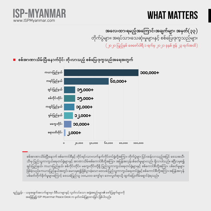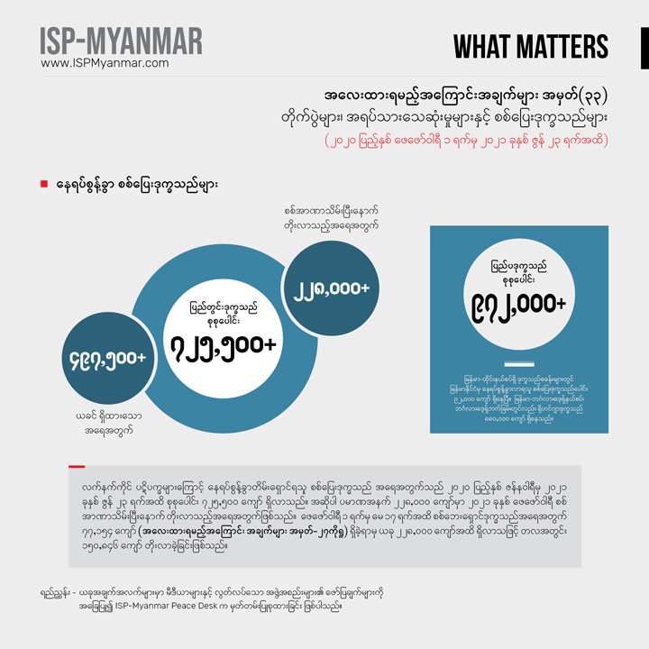 တခါ ဖြစ်ပွားခဲ့တဲ့ တိုက်ပွဲနဲ့ အပြန်အလှန် ပစ်ခတ်မှုတွေကြောင့် ယခုတလအတွင်း စစ်ပြေး ဒုက္ခသည် ၁၅၀,၈၄၆ တိုးလာပြီး၊ စစ်အာဏာသိမ်းမှု နောက်ပိုင်း စစ်ပြေး ဒုက္ခသည် အရေအတွက် ၂၂၈,၀၀၀ ဦးကျော် ရှိလာခဲ့ပါတယ်။ ၂၀၂၀ ပြည့်နှစ်ကစပြီး အခု၂၀၂၁ ခုနှစ် ဇွန် တတိယပတ် ကာလအထိ စစ်ပြေး ဒုက္ခသည် အရေအတွက်ကိုကြည့်ရင် ၇၂၅,၅၀၀ ဦးကျော် ရှိလာခဲ့ပါတယ်။ တိုးလာတဲ့ စစ်ပြေး ဒုက္ခသည်တွေအနက် ၁၀၀,၀၀၀ ကျော်ဟာ ကယား ပြည်နယ်အတွင်း အာဏာသိမ်း စစ်ကောင်စီနဲ့ ဒေသခံ ပြည်သူ့ကာကွယ်ရေးတပ်ဖွဲ့တွေအကြား အပြန်အလှန် ပစ်ခတ် တိုက်ခိုက်မှုများအပြီး ဘေးလွတ်ရာကို တိမ်းရှောင်လာကြတာပဲ ဖြစ်ပါတယ်။ ဒါက ကယားပြည်နယ်အတွင်း ရှိနေသူတွေထဲက သုံးပုံတပုံကျော်ဟာ စစ်ပြေးဒုက္ခသည် ဖြစ်လာကြတာ ဖြစ်ပါတယ်။အလားတူ ပစ်ခတ် တိုက်ခိုက်မှုတွေကြောင့် ချင်းပြည်နယ်မှာ စစ်ပြေးဒုက္ခသည် ၁၅,၀၀၀ ကျော်၊ စစ်ကိုင်းတိုင်းမှာ ၁၅,၀၀၀ ကျော်၊မကွေးတိုင်းမှာ ၁၀,၀၀၀ ကျော်နဲ့ ဧရာဝတီတိုင်းမှာ ၂,၀၀၀ ကျော်အထိ အသီးသီးရှိလာခဲ့ပါတယ်။ ပြည်တွင်းမှာ နေရပ်စွန့်ခွာထွက်ပြေး တိမ်းရှောင်နေရတဲ့ စစ်ပြေးဒုက္ခသည် အရေအတွက်က ၇၀၀,၀၀၀ ကျော်အထိ ရှိလာသလို၊ အရင်ကတည်းက ဖြစ်ပွားခဲ့တဲ့ လက်နက်ကိုင် ပဋိပက္ခတွေကြောင့် ပြည်ပမှာ ခိုလှုံနေရတဲ့ ဒုက္ခသည် အရေအတွက်ကလည်း ၉၇၂,၀၀၀ ကျော်အထိ ရှိနေပါတယ်။ မြန်မာ-ဘင်္ဂလားဒေ့ရှ်နယ်စပ်၊ ဘင်္ဂလား ဒေ့ရှ်ဘက်ခြမ်းမှာ ရိုဟင်ဂျာဒုက္ခ သည်ပေါင်း ၈၈၀,၀၀၀ ကျော်၊ ထိုင်း-မြန်မာနယ်စပ်၊ ထိုင်းဘက်ခြမ်းမှာ စစ်ရှောင်ဒုက္ခသည် ၉၂,၀၀၀ ကျော်အထိ ရှိနေပါတယ်။