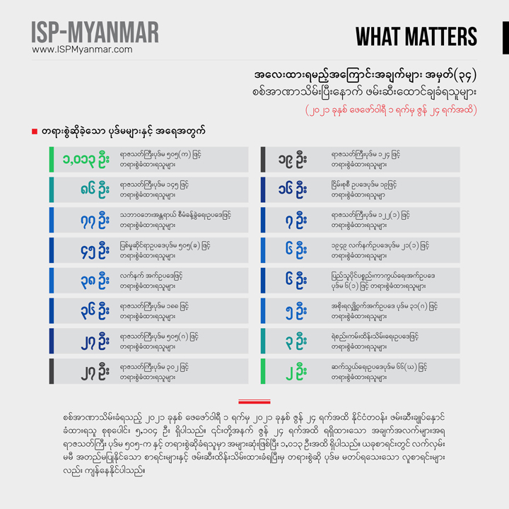 ၂၀၂၁ ခုနှစ် ဖေဖော်ဝါရီ ၁ ရက် စစ်အာဏာသိမ်းပြီး နောက်ပိုင်း ဇွန် ၂၄ ရက်အထိ နိုင်ငံတဝန်း ဖမ်းဆီးခံရသူ စုစု ပေါင်း ၅၀၀၀ကျော် အထိ ရှိခဲ့ပါတယ်။ ဒီအထဲကမှ ၅၁၀၄ ဦးဟာ လက်ရှိ အချိန်အထိ ဖမ်းဆီး ချုပ်နှောင်ခံ ထားရဆဲ ဖြစ်ပါတယ်။ ဖမ်းဆီးခံထားရသူတွေထဲမှာ NLD အစိုးရ ထိပ်ပိုင်းခေါင်းဆောင်တွေ အပါအဝင်၊ လွှတ်တော် ကိုယ်စားလှယ်တွေ၊ ရွေးကောက်ပွဲကော်မရှင်အဖွဲ့ဝင်တွေလည်း ပါဝင်ပြီး၊ NLD ပါတီဝင်တွေကို လည်း ဖမ်းဆီးခံခဲ့ရပါတယ်။ စစ်အာဏာရှင်စနစ် ဆန့်ကျင်ရေးလူထုလှုပ်ရှားမှုမှာ ပါဝင်ခဲ့ကြတဲ့ ကျောင်သားတွေ၊ အရပ်သား ပြည်သူတွေ၊ CDM မှာပါဝင်တဲ့ ဝန်ထမ်းတွေနဲ့ CDM ကို ထောက်ခံအားပေးသူတွေ၊ အနုပညာရှင်တွေနဲ့ သတင်းသမားတွေကိုလည်း ဖမ်းဆီးခဲ့ပါတယ်။ ဖမ်းဆီးခံ ထားရသူတွေနဲ့ ၀ရမ်းထုတ် ခံထားရသူတွေအပေါ် တရားစွဲဆိုမှု ပြုလုပ်တဲ့ ကိန်းဂဏန်းတွေကို လေ့လာ ကြည့်ရင်လည်း ပုဒ်မ ၅၀၅ (က) ကို အများဆုံး အသုံးပြုနေတာ တွေ့ရပါတယ်။ အရင်လက ဖော်ပြခဲ့တဲ့ အလေးထားရမည့် အကြောင်းအချက်များ အမှတ် – ၂၈ မှာ ပါရှိတဲ့ ကိန်းဂဏန်းတွေနဲ့နှိုင်းယှဉ် လေ့လာမယ်ဆိုရင် တလအတွင်း ဖမ်းဆီးထိန်းသိမ်းထားခံရသူ အရေအတွက် ၉၀၀ ကျော် တိုးလာပြီး အဖမ်းခံရသူအများစုက အရပ်သား ပြည်သူတွေ ဖြစ်နေပါတယ်။