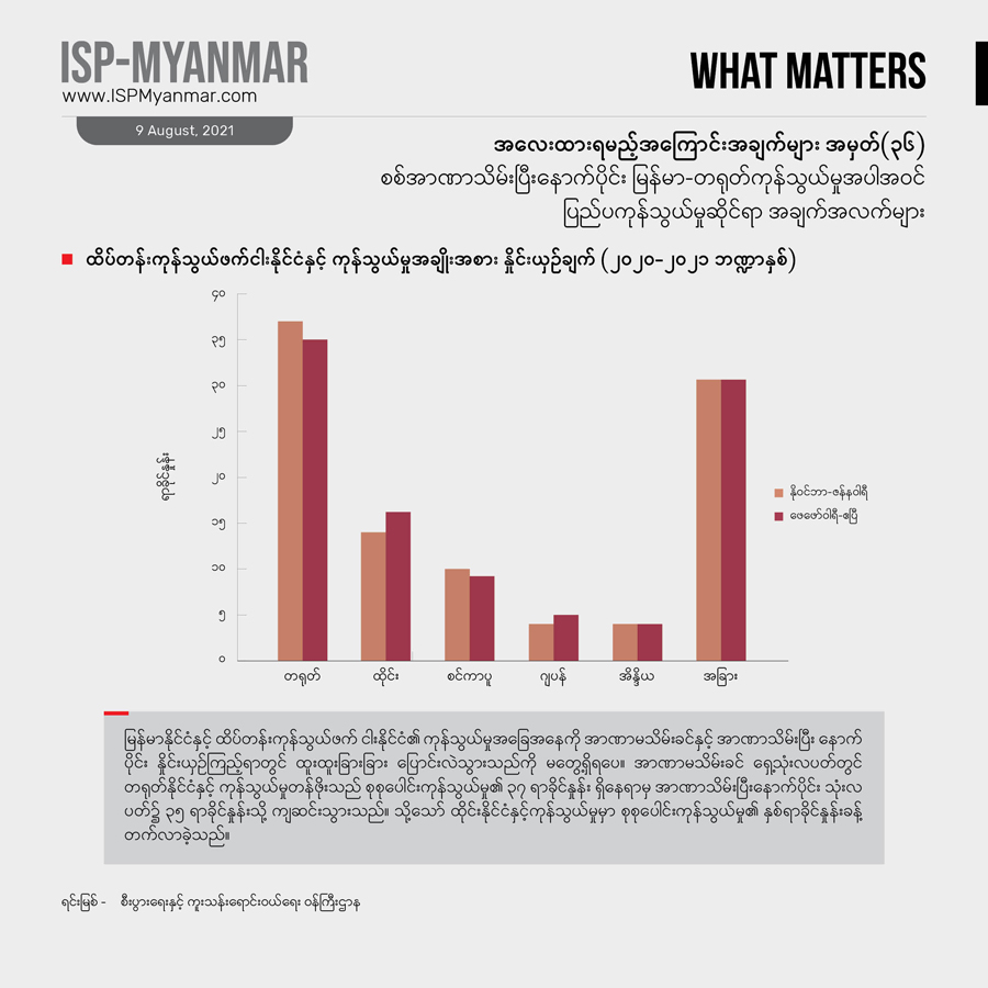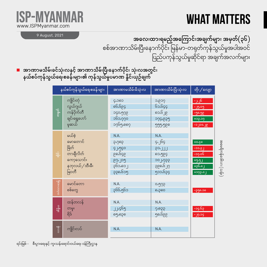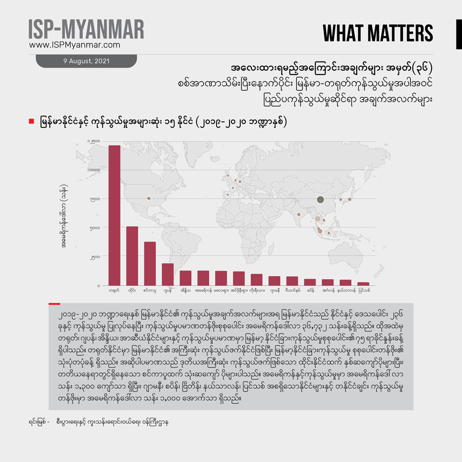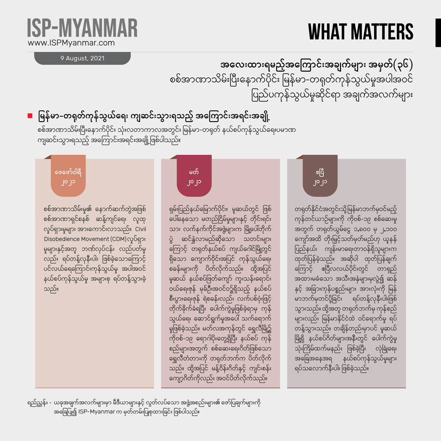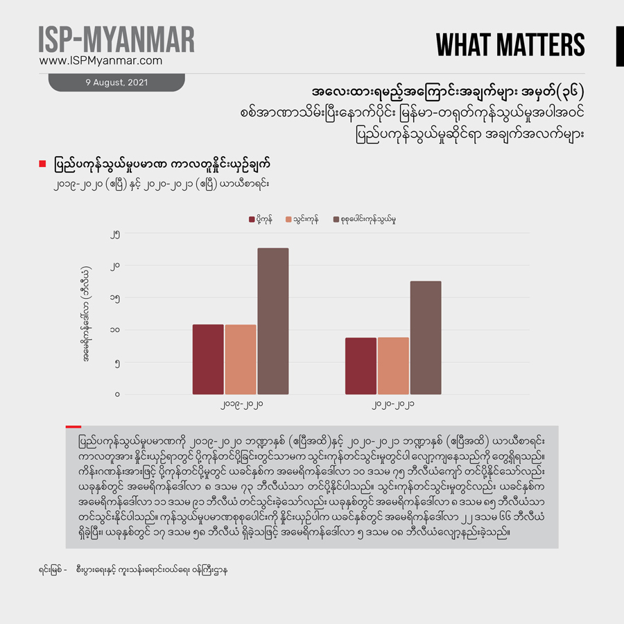 ပိုဆိုးတာက အခုအချိန်မှာ ကိုဗစ်-၁၉ တတိယလှိုင်းရဲ့ ရိုက်ခတ်မှုကို နိုင်ငံတဝန်း ပြင်းပြင်းထန်ထန် ရင်ဆိုင် နေရတာကြောင့်စီးပွားရေး၊ လူမှုရေး ထိခိုက်မှုတွေဟာ ခန့်မှန်းထားတာတွေထက် ပိုပြီး ဆိုးနိုင်ခြေ ရှိပါတယ်။ အာဏာသိမ်းမှုအပြီးမှာ ဖြစ်ပွားခဲ့တဲ့စီးပွားရေး အကျပ်အတည်းတွေနဲ့ အနောက်နိုင်ငံတွေရဲ့ စီးပွားရေး ပိတ်ဆို့ အရေးယူမှုတွေက မြန်မာနိုင်ငံရဲ့ ပြည်ပ ကုန်သွယ်မှုအပေါ်မှာ ဘယ်လို သက်ရောက်မှုတွေရှိမလဲ ဆိုတာဟာ မြန်မာနိုင်ငံရဲ့ စီးပွားရေးနဲ့ ဒီမိုကရေစီ ပြုပြင်ပြောင်းလဲရေးအတွက်အရေးပါပါတယ်။ ဒါ့အပြင် စီးပွားရေး ကိန်းဂဏန်းတွေဟာ ပြည်ပနိုင်ငံတွေရဲ့ နိုင်ငံရေးနဲ့ အကျိုးစီးပွား စဉ်းစားချက်တွေကို များစွာ ထင်ဟပ်လျက်ရှိတာကြောင့် မြန်မာနိုင်ငံရဲ့ ဒီမိုကရေစီရေးကြိုးပမ်းမှုမှာ ပြည်ပနိုင်ငံတွေရဲ့ အခန်းကဏ္ဍကို ပိုပြီးထဲထဲဝင်ဝင်နားလည်စေဖို့ အထောက်အပံ့ ဖြစ်စေမှာ ဖြစ်ပါတယ်။