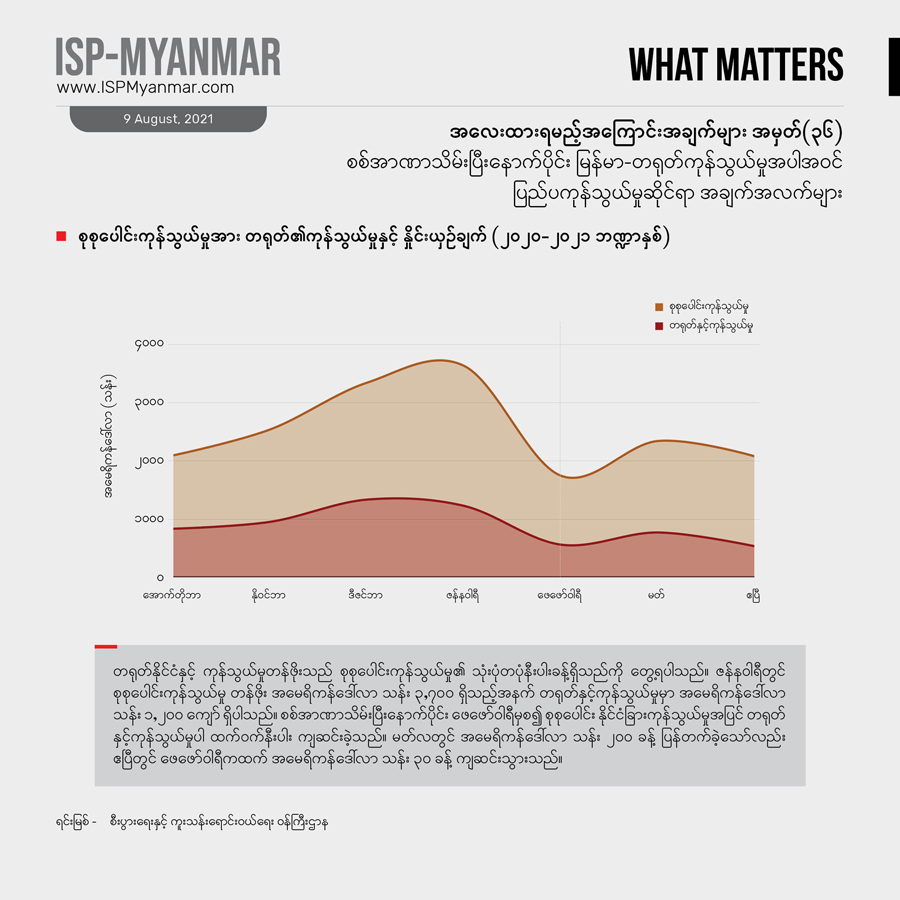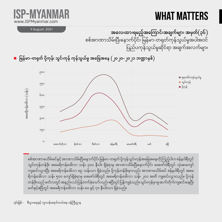 နိုင်ငံတခု၊ အုပ်ချုပ်မှု အဖွဲ့အစည်းတရပ် ရပ်တည် ရှင်သန်နိုင်ဖို့ဆိုရင် ကုန်သွယ်မှု ကဏ္ဍကလည်း အရေးပါတဲ့ ကိစ္စရပ်တခု ဖြစ်ပါတယ်။ ဒါကြောင့် စစ်အာဏာသိမ်းပြီး နောက်ပိုင်း မြန်မာနိုင်ငံရဲ့ ပြည်ပ ကုန်သွယ်မှု ဆိုင်ရာ အချက်အလက်တွေကို အလေးထားစောင့်ကြည့်ရမယ့် ကိန်းဂဏန်းအချက်အလက်များအဖြစ် လစဉ် ထုတ်နှုတ် တင်ပြသွားမှာ ဖြစ်ပါတယ်။ ဒီလိုတင်ပြရာမှာ စစ်အာဏာ မသိမ်းခင် ကုန်သွယ်ရေး အခြေအနေတွေနဲ့ နှိုင်းယှဉ်သုံးသပ်ပြီး ဘယ်လို ပြောင်းလဲလာတယ်။ ကုန်သွယ်ရေးမှာ ဘယ်နိုင်ငံတွေကို ပိုပြီး အားကိုးလာရတယ် ဆိုတာကို အထောက်အထားအားဖြင့် ပေါ်လွင်စေမှာ ဖြစ်ပါတယ်။ အထူးသဖြင့် မြန်မာနိုင်ငံရဲ့ အကြီးမားဆုံး ကုန်သွယ်ဘက် ဖြစ်သလို အာဏာသိမ်း စစ်ကောင်စီကို အဓိက ကျောထောက် နောက်ခံပြုပေးနိုင်တဲ့ တရုတ်နိုင်ငံနဲ့ ကုန်သွယ်ရေး အခြေအနေတွေကို အလေးပေးစောင့်ကြည့် တင်ပြသွားမှာ ဖြစ်ပါတယ်။