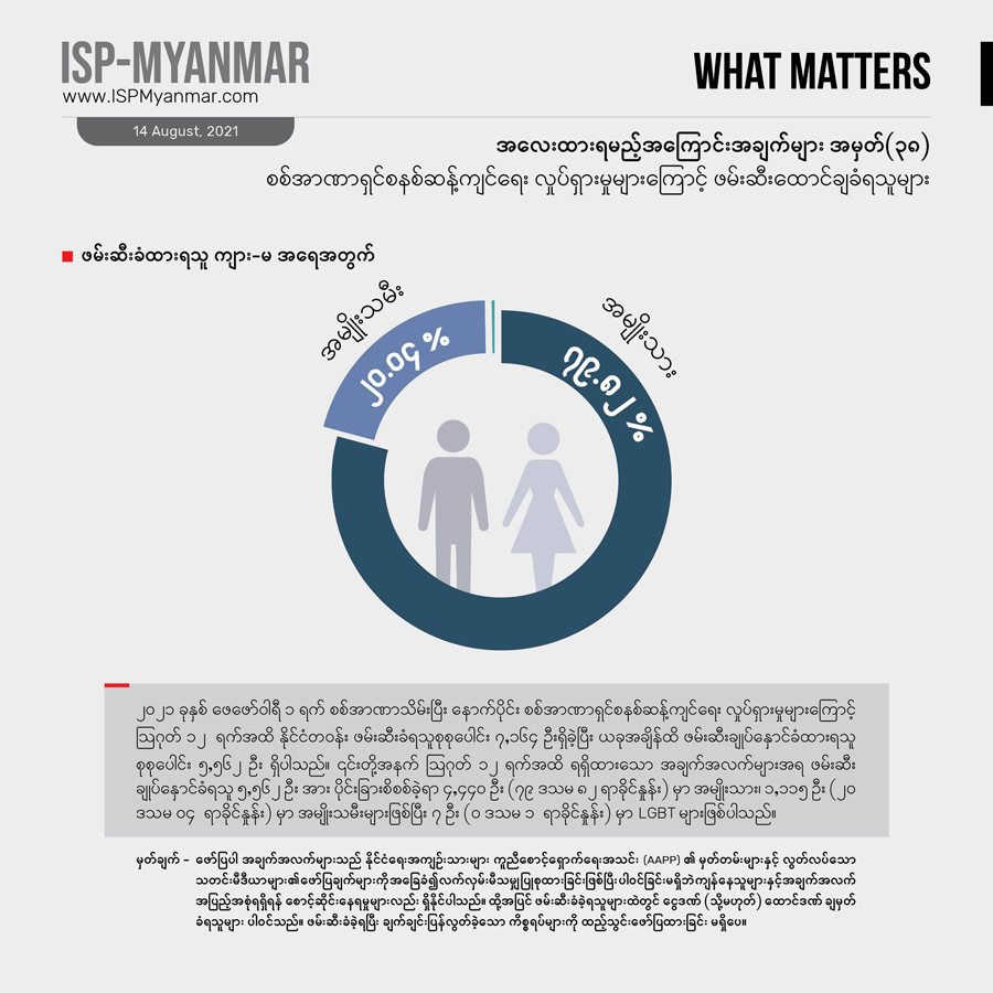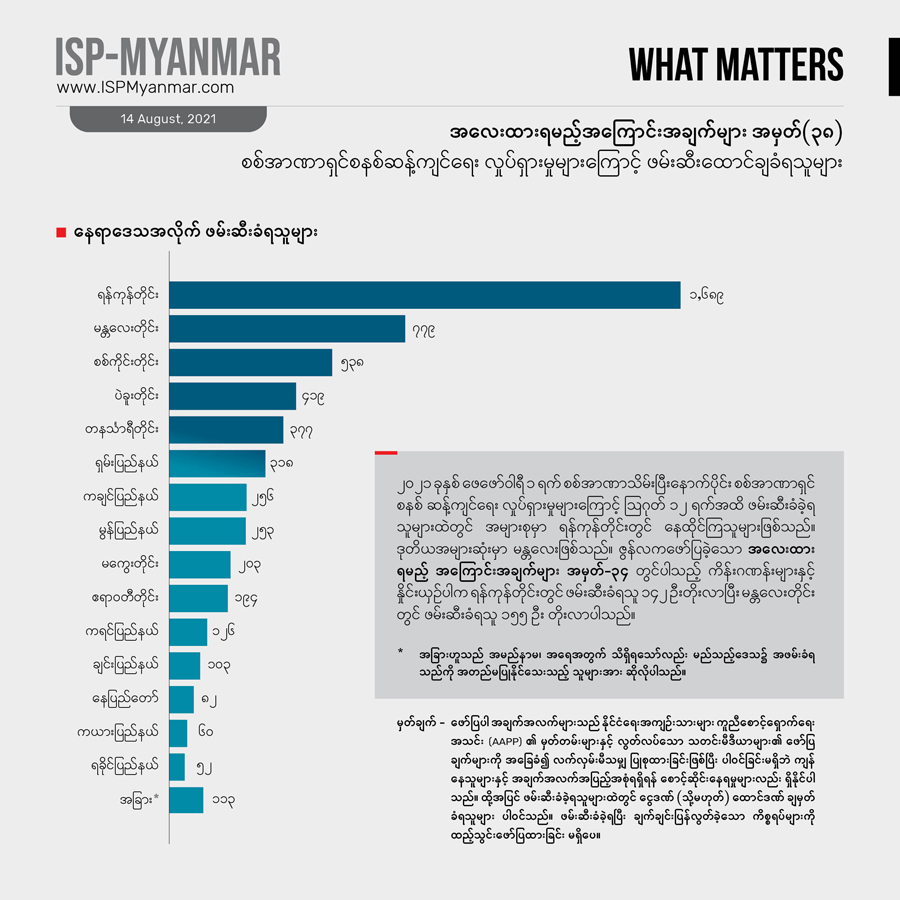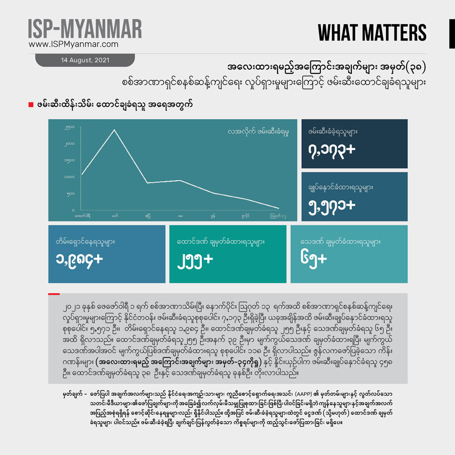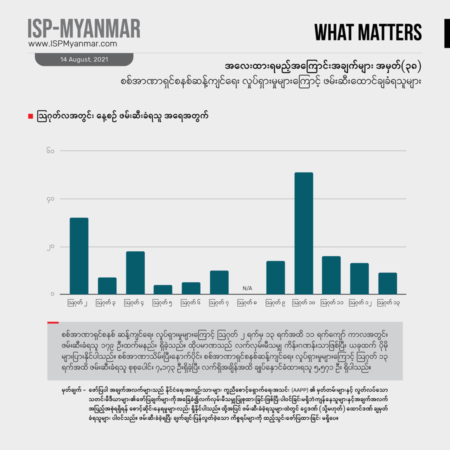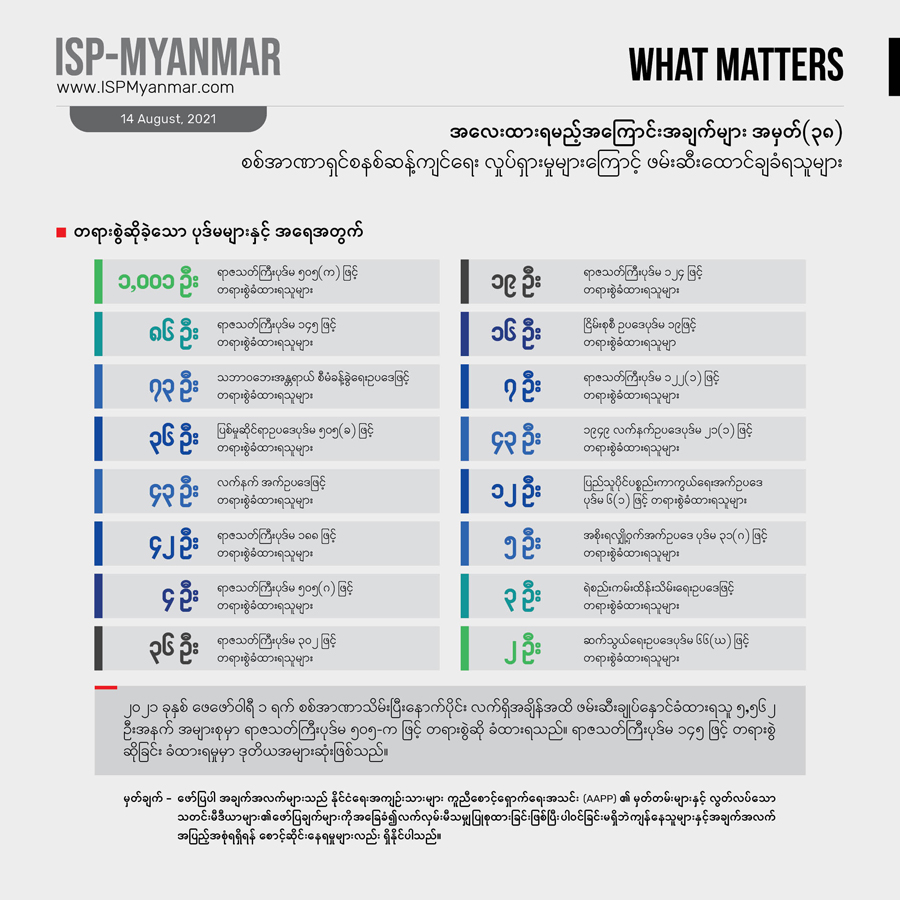 ၂၀၂၁ ခုနှစ် ဖေဖော်ဝါရီ ၁ ရက် စစ်အာဏာသိမ်းပြီး နောက်ပိုင်း ဩဂုတ်လ ၁၂ ရက်အထိ စစ်အာဏာရှင်စနစ် ဆန့်ကျင်ရေးလှုပ်ရှားမှုတွေကြောင့် နိုင်ငံတဝန်း ဖမ်းဆီးခံရသူ စုစုပေါင်း ၇၀၀၀ ကျော် အထိ ရှိခဲ့ပါတယ်။ ဒီအထဲကမှ ၅၅၇၁ ဦးဟာ လက်ရှိအချိန်အထိ ဖမ်းဆီး ချုပ်နှောင်ခံ ထားရဆဲ ဖြစ်ပါတယ်။ ဖမ်းဆီး ခံထားရသူအများစုက စစ်အာဏာရှင်စနစ် ဆန့်ကျင်ရေး လူထုလှုပ်ရှားမှုမှာ ပါဝင်ခဲ့ကြတဲ့ သာမန်အရပ်သား ပြည်သူတွေနဲ့ ကျောင်းသားတွေ ဖြစ်ကြပါတယ်။ CDM မှာ ပါဝင်တဲ့ ဝန်ထမ်းတွေနဲ့CDM ကို ထောက်ခံအားပေးသူတွေ၊ အနုပညာရှင်တွေနဲ့ သတင်းသမားတွေသာမက ဆရာဝန်၊ သူနာပြုနှင့် ဆေးဘက်ဆိုင်ရာဝန်ထမ်းတွေကိုလည်း ဖမ်းဆီး ထိန်းသိမ်းထားပါတယ်။ လက်ရှိ အချိန်ထိဖမ်းဆီး ချုပ်နှောင်ခံရသူတွေထဲမှာ ဆရာဝန် ၄၈ ဦးပါဝင်နေပြီး ကိုဗစ်ကာလ ဆေးကုသမှု လှည့်လည် ပြုလုပ်ပေးနေတဲ့ ပရဟိတဆရာဝန်တွေကိုပါ စစ်ကောင်စီက ဖမ်းဆီးမှုတွေလုပ်နေပါတယ်။ ဖမ်းဆီးထားသူတွေအပေါ် တရားစွဲဆိုမှု လုပ်ထားတဲ့ ကိန်းဂဏန်းတွေကို လေ့လာ ကြည့်ရင် ပုဒ်မ ၅၀၅ (က) ကိုအများဆုံး အသုံးပြုနေတာ တွေ့ရပါတယ်။ ဇွန်လက ဖော်ပြခဲ့တဲ့ အလေးထားရမည့် အကြောင်းအချက်များ အမှတ် – ၃၄ မှာ ပါရှိတဲ့ ကိန်းဂဏန်းတွေနဲ့ နှိုင်းယှဉ် လေ့လာမယ်ဆိုရင် ဖမ်းဆီး ထိန်းသိမ်းထားခံရသူ အရေအတွက် ၄၀၀ ကျော် တိုးလာပါတယ်။