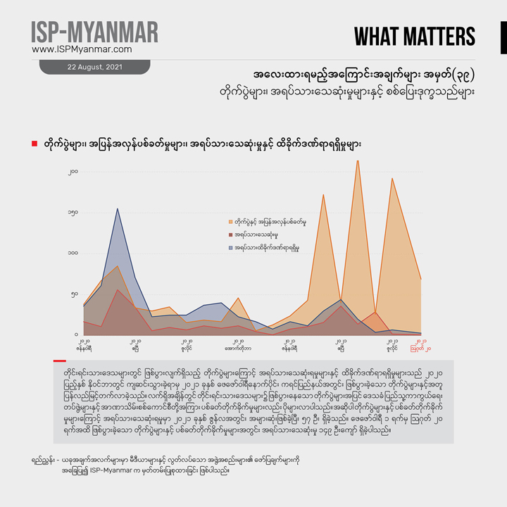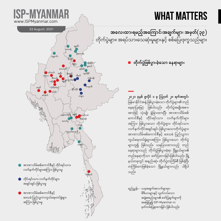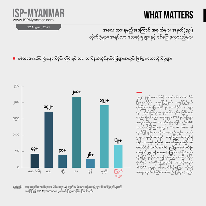 မြန်မာနိုင်ငံမှာ စစ်အာဏာ သိမ်းပြီးနောက်ပိုင်း ဖြစ်ပွားလာတဲ့ တိုက်ပွဲအခြေအနေနဲ့ အကျိုးဆက်တွေ အပါအဝင် တိုင်းရင်းသားဒေသတွေမှာ ဖြစ်ပွားနေတဲ့ တိုက်ပွဲတွေ၊ အရပ်သား ထိခိုက်သေဆုံးမှုတွေနဲ့ စစ်ဘေးရှောင်ဒုက္ခသည် အခြေအနေတွေကိုလွတ်လပ်တဲ့ သတင်းမီဒီယာတွေ၊ အထူးသဖြင့် တိုင်းရင်းသား သတင်းဌာနတွေရဲ့ မြေပြင် အခြေအနေ ဖော်ပြချက်တွေအပြင်၊မြန်မာနိုင်ငံဆိုင်ရာ ကုလသမဂ္ဂ လူသားချင်းစာနာမှုဆိုင်ရာ ညှိနှိုင်းရေးရုံး (UNOCHA Myanmar) လို ကုလသမဂ္ဂဆိုင်ရာ အဖွဲ့အစည်းတွေ၊ အခြား လွတ်လပ်သော ပြည်တွင်း ပြည်ပအဖွဲ့အစည်းတွေရဲ့ မှတ်တမ်း၊ အစီရင်ခံစာ စတာတွေနဲ့လည်း တွဲဖက်လေ့လာနိုင်ပါတယ်။