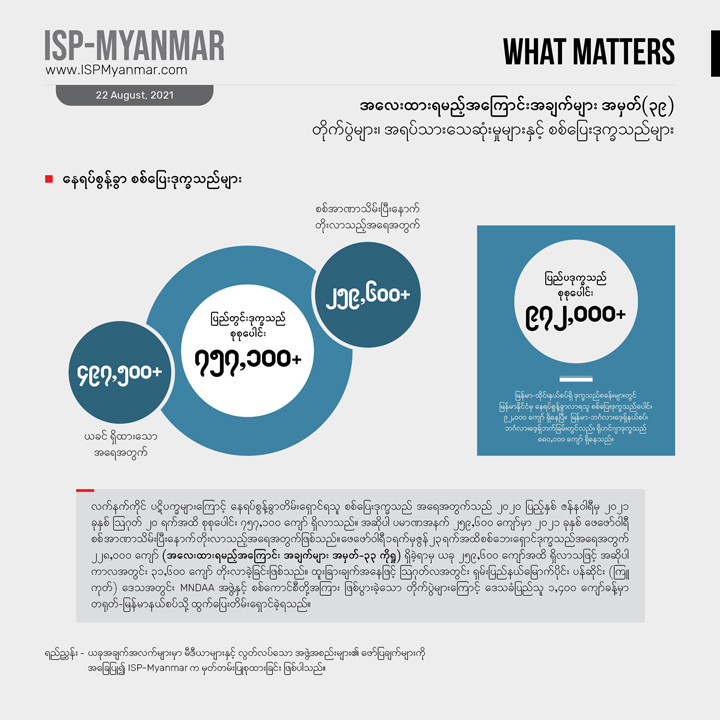 တခါ ဖြစ်ပွားခဲ့တဲ့ တိုက်ပွဲနဲ့ အပြန်အလှန် ပစ်ခတ်မှုတွေကြောင့် ယခုတလအတွင်း စစ်ပြေး ဒုက္ခသည် ၃၁,၆၀၀ ကျော် တိုးလာပြီး၊စစ်အာဏာသိမ်းမှု နောက်ပိုင်း စစ်ပြေးဒုက္ခသည် အရေအတွက် ၂၅၉,၆၀၀ ဦးကျော် ရှိလာခဲ့ပါတယ်။ ၂၀၂၀ ပြည့်နှစ် ဇန်နဝါရီ၁ရက် ကစပြီး အခု ၂၀၂၁ ခုနှစ် ဩဂုတ် ၂၀ ရက်အထိ စစ်ပြေး ဒုက္ခသည် အရေအတွက်ကို ကြည့်ရင် ၇၅၇,၁၀၀ ဦးကျော် ရှိလာခဲ့ပါတယ်။