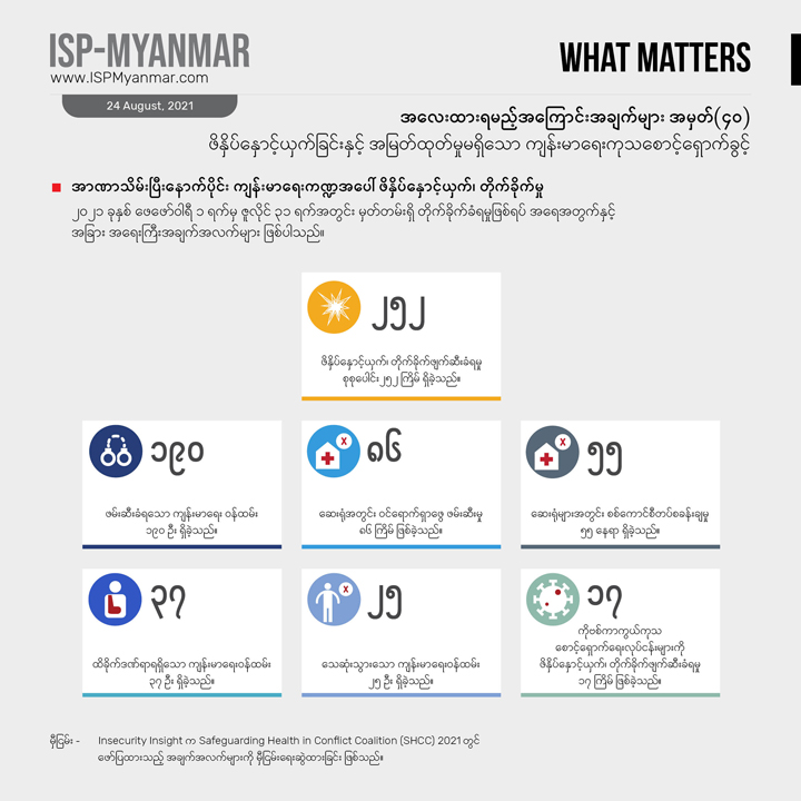 ကမ္ဘာ့နိုင်ငံ အနှံ့မှာ ဖြစ်ပွားနေတဲ့ ကျန်းမာရေး ကုသစောင့်ရှောက်မှု လုပ်ငန်းတွေအပေါ် တိုက်ခိုက်၊ ဖိနှိပ်၊ နှောင့်ယှက်မှုတွေပြုလုပ်ခြင်းအပေါ် စာရင်းပြုစုတဲ့ Insecurity Insight က ထုတ်ပြန်တဲ့ အချက်အလက်တွေအရ မြန်မာနိုင်ငံမှာ ၂၀၂၁ ခုနစ်ဖေဖော်ဝါရီ ၁ ရက်ကနေ ဇူလိုင် ၃၁ ရက်အထိ ကျန်းမာရေး ကဏ္ဍအပေါ် တိုက်ခိုက်နှောက်ယှက်မှု ဖြစ်ရပ်ပေါင်း ၂၅၂ ခု ရှိခဲ့ပါတယ်။ ဆေးရုံတွေကို ဝင်ရောက် တိုက်ခိုက်တာ၊ စီးနင်းတာတွေ ဖြစ်ခဲ့သလို ဆေးပညာရှင်တွေကို တိုက်ခိုက် ဖမ်းဆီး ဖိနှိပ်ခဲ့တာကြောင့် ၂၅ ဦး အသက် ဆုံးရှုံးခဲ့ရတယ်လို့ ဖော်ပြပါတယ်။ နိုင်ငံရေး အကျဉ်းသားများ ကူညီ စောင့်ရှောက် ရေးအသင်း(AAPP)ရဲ့ စာရင်းအရ ကျန်းမာရေး ဝန်ထမ်း စုစုပေါင်း ၅၉၅ ဦးကိုလည်း စစ်ကောင်စီက ရာဇသတ်ကြီး ပုဒ်မ ၅၀၅(က) နဲ့တရားစွဲဆို ဝရမ်း ထုတ်ထားပါတယ်။ ဒါ့အပြင် ဆရာဝန် ၄၈ ဦး ဖမ်းဆီး ချုပ်နှောင် ခံထားရပါတယ်။ ဒီစာရင်းတွေမှာ မပါဝင်သေးတဲ့ ဖြစ်ရပ်တွေလည်း ရှိနိုင်ပါတယ်။ ဒီအခြေ အနေတွေအရ မြန်မာနိုင်ငံမှာ လွတ်လပ်စွာ ဆေးကုသ စောင့်ရှောက်ခံယူခွင့်ပျက်ပြားနေတယ်လို့ ဆိုနိုင်ပါတယ်။
