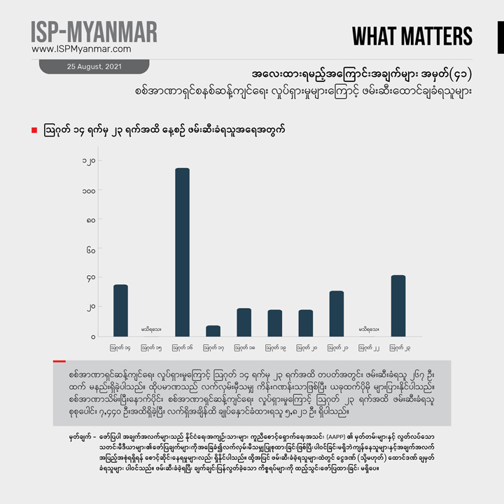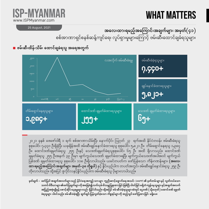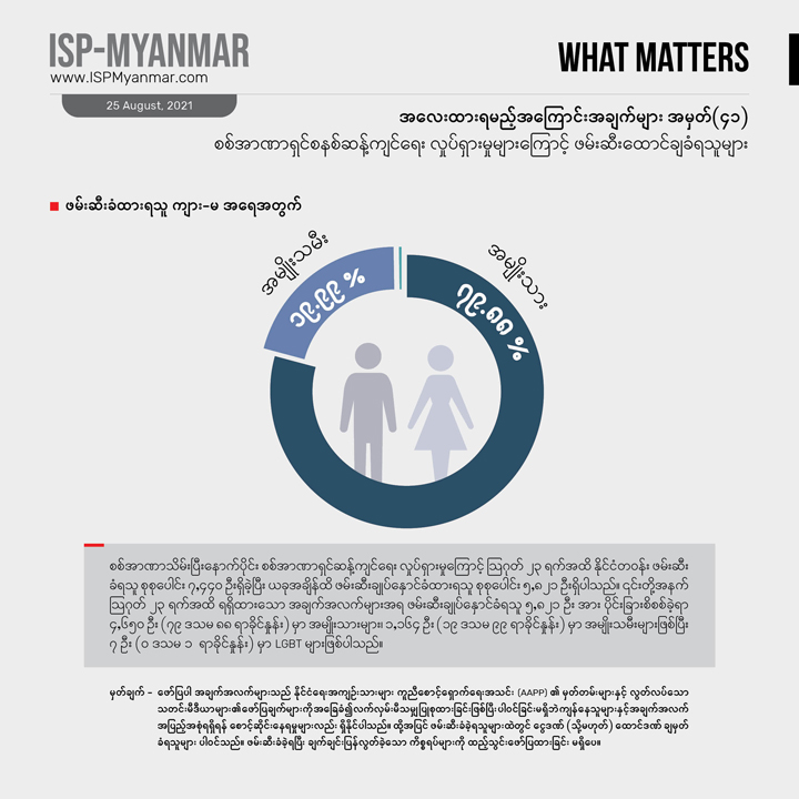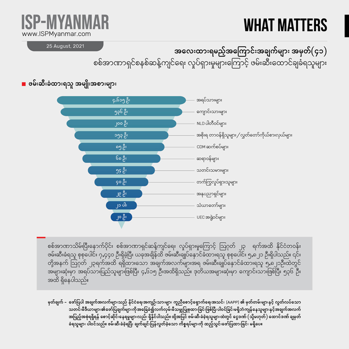 ၂၀၂၁ ခုနှစ် ဖေဖော်ဝါရီ ၁ ရက် စစ်အာဏာသိမ်းပြီး နောက်ပိုင်း ဩဂုတ် ၂၃ ရက်အထိ စစ်အာဏာရှင်စနစ် ဆန့်ကျင်ရေးလှုပ်ရှားမှုတွေကြောင့် နိုင်ငံတဝန်း ဖမ်းဆီးခံရသူ စုစုပေါင်း ၇,၀၀၀ ကျော် အထိ ရှိခဲ့ပါတယ်။ ဒီအထဲကမှ ၅,၈၂၁ ဦးဟာ လက်ရှိအချိန်အထိ ဖမ်းဆီး ချုပ်နှောင်ခံ ထားရဆဲ ဖြစ်ပါတယ်။ ဖမ်းဆီး ခံထားရသူ အများစုက စစ်အာဏာရှင်စနစ် ဆန့်ကျင်ရေး လူထုလှုပ်ရှားမှုမှာ ပါဝင်ခဲ့ကြတဲ့ သာမန်အရပ်သား ပြည်သူတွေနဲ့ ကျောင်းသားတွေ ဖြစ်ကြပါတယ်။ CDM မှာ ပါဝင်တဲ့ ဝန်ထမ်းတွေနဲ့CDM ကို ထောက်ခံ အားပေးသူတွေ၊ အနုပညာရှင်တွေနဲ့ သတင်းသမားတွေသာမက ဆရာဝန်၊ သူနာပြုနှင့် ဆေးဘက်ဆိုင်ရာဝန်ထမ်းတွေကိုလည်း ဖမ်းဆီး ထိန်းသိမ်း ထားပါတယ်။ လက်ရှိ အချိန်ထိ ဖမ်းဆီး ချုပ်နှောင်ခံရသူတွေထဲမှာ ဆရာဝန် ၄၈ ဦးပါဝင်နေပြီး ကိုဗစ်ကာလ ဆေးကုသမှု လှည့်လည် ပြုလုပ်ပေးနေတဲ့ ပရဟိတ ဆရာဝန်တွေကိုပါ စစ်ကောင်စီက ဖမ်းဆီးမှုတွေလုပ်နေပါတယ်။ ဖမ်းဆီးထားသူတွေအပေါ် တရားစွဲဆိုမှု လုပ်ထားတဲ့ ကိန်းဂဏန်းတွေကို လေ့လာ ကြည့်ရင် ပုဒ်မ ၅၀၅ (က) ကိုအများဆုံး အသုံးပြုနေတာ တွေ့ရပါတယ်။ ယခင်အပတ်က ဖော်ပြခဲ့သော ကိန်းဂဏန်းများ (အလေးထားရမည့်အကြောင်းအချက်များ အမှတ်-၃၈ ကိုရှုပါ) နှင့်နှိုင်းယှဉ်ပါက တပတ်အတွင်း ဖမ်းဆီးချုပ်နှောင်ခံရသူ ၂၅၉ ဦး တိုးလာပါတယ်။ဒါ့အပြင် ဇူလိုင်လစာရင်းနဲ့ နှိုင်းယှဉ်မယ်ဆိုရင် ဖမ်းဆီးခံရသူ အရေအတွက် ပိုများလာပါတယ်။