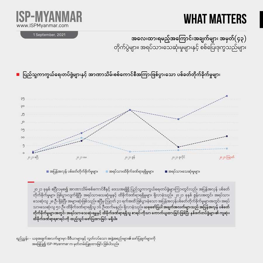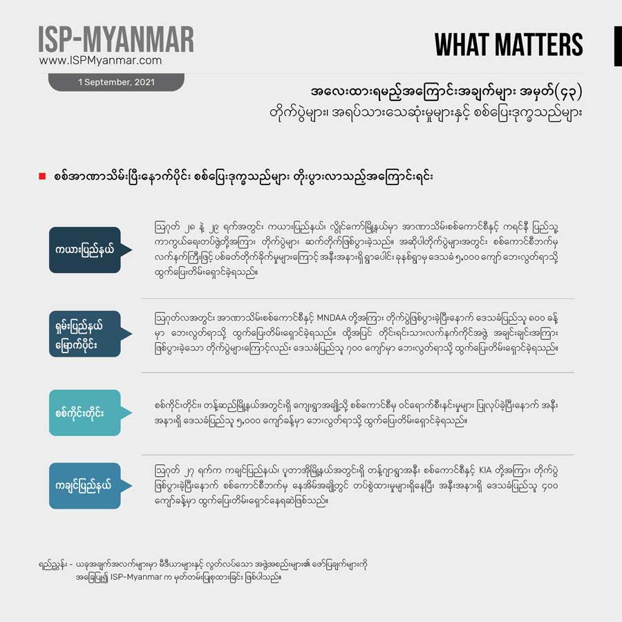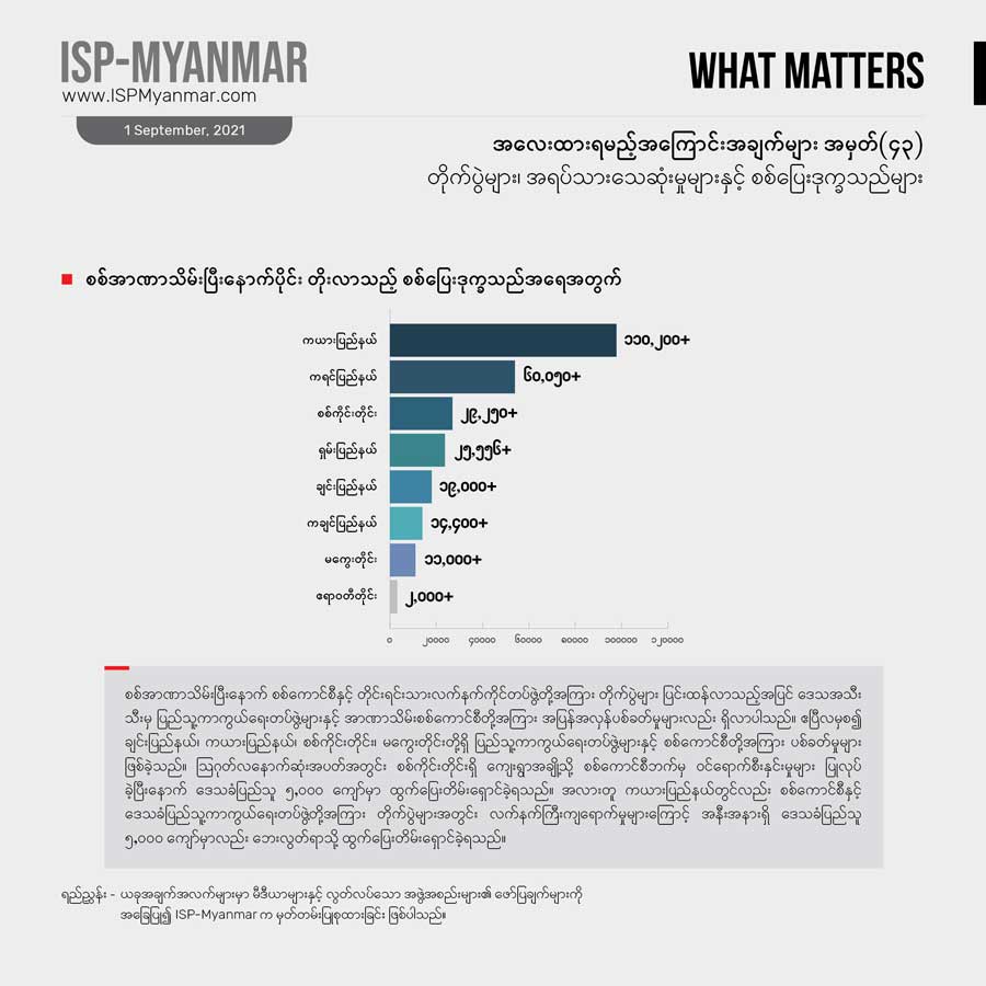 တခါ ဖြစ်ပွားခဲ့တဲ့ တိုက်ပွဲနဲ့ အပြန်အလှန် ပစ်ခတ်မှုတွေကြောင့် ယခုတပတ် အတွင်း စစ်ပြေး ဒုက္ခသည် ၁၁,၈၅၆ ဦးကျော် တိုးလာပြီး၊ စစ်အာဏာသိမ်းမှု နောက်ပိုင်း စစ်ပြေးဒုက္ခသည် အရေအတွက် ၂၇၁,၄၅၆ ဦးကျော် ရှိလာခဲ့ပါတယ်။ ၂၀၂၀ ပြည့်နှစ်ဇန်နဝါရီ ၁ရက် ကစပြီး အခု ၂၀၂၁ ခုနှစ် ဩဂုတ် ၃၁ ရက်အထိ စစ်ပြေး ဒုက္ခသည် အရေအတွက်ကို ကြည့်ရင် ၇၆၈,၉၅၆ ဦးကျော် ရှိလာခဲ့ပါတယ်။