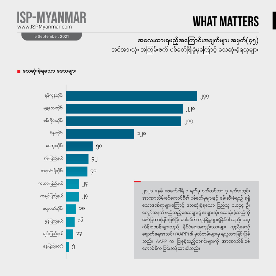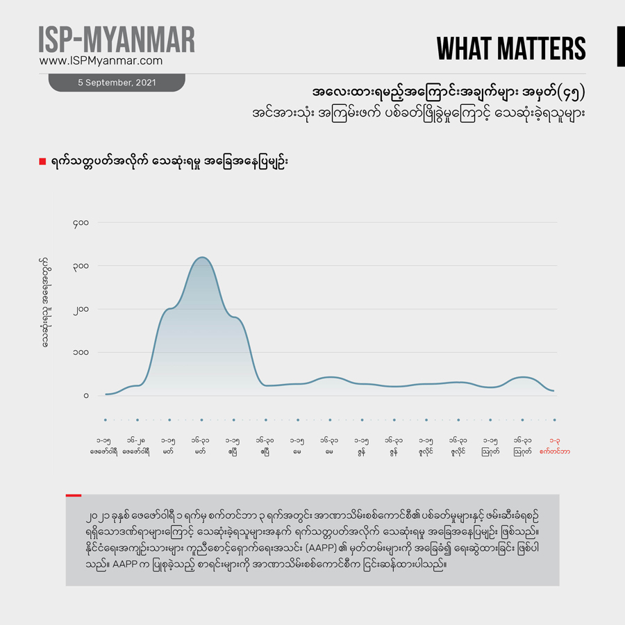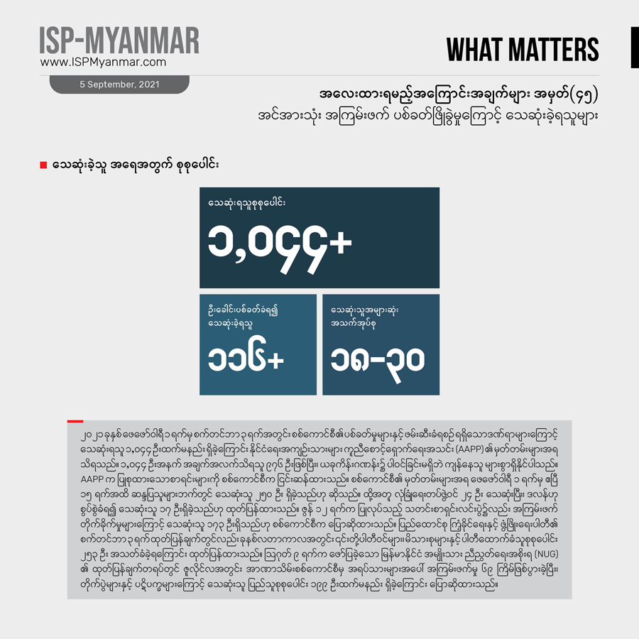 ဩဂုတ် ၂၇ ရက်က ဖော်ပြခဲ့တဲ့ အလေးထားရမည့် အကြောင်းအချက်များ အမှတ် (၄၂) နဲ့ နှိုင်းယှဉ်ကြည့်ရင် အသစ်ထပ်တိုးလာတဲ့ သေဆုံးသူအရေအတွက်က တပတ်ကျော်ကာလအတွင်း ၂၅ ဦးထက်မနည်း ရှိခဲ့ပါတယ်။ ဒီအထဲကမှ ကိုးဦးဟာ စစ်ကိုင်းတိုင်းအတွင်း သေဆုံးခဲ့ရပြီး၊ ခြောက်ဦးကတော့ ရှမ်းပြည်နယ်အတွင်း သေဆုံးခဲ့ရသူများ ဖြစ်ပါတယ်။