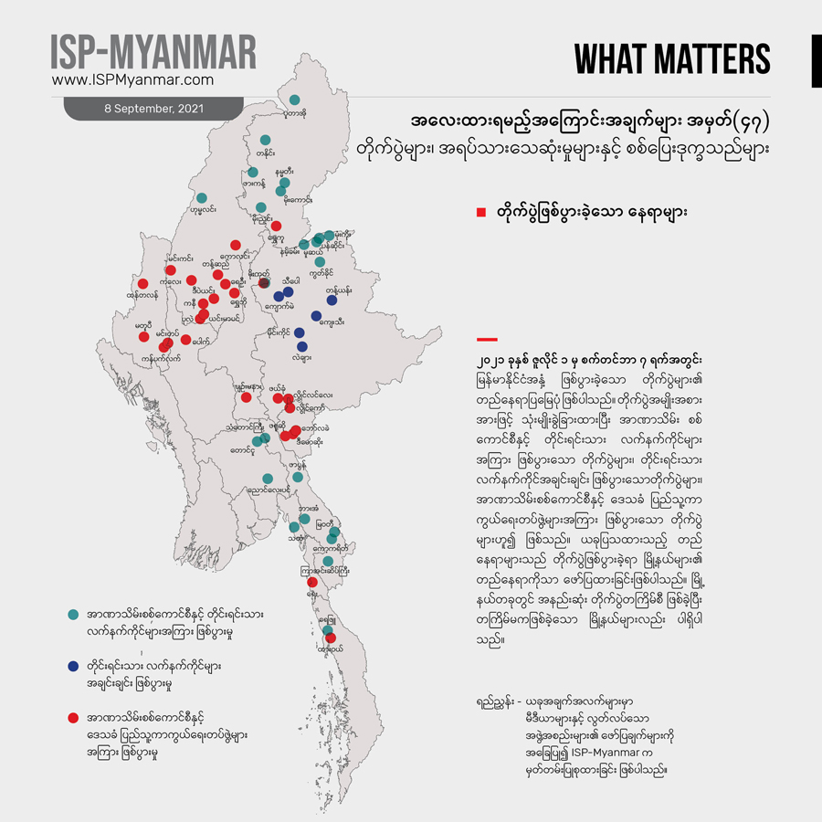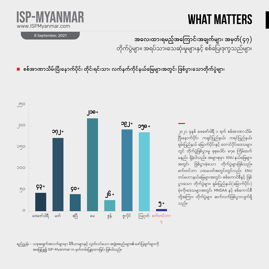 စစ်အာဏာသိမ်းမှု ဖြစ်ပြီးနောက်ပိုင်း တိုင်းရင်းသား ဒေသတွေအပါအဝင် ဒေသအချို့မှာ တိုက်ပွဲနဲ့ အပြန်အလှန် ပစ်ခတ်တိုက်ခိုက်မှု ၈၇၈ ကြိမ်ထက်မနည်း ဖြစ်ပွားခဲ့ပါတယ်။ ကရင်ပြည်နယ်အတွင်းက KNU တပ်မဟာ နယ်မြေတွေမှာတော့အာဏာသိမ်း စစ်ကောင်စီနဲ့ KNU တို့အကြား လက်နက်ကိုင်တိုက်ပွဲတွေ အများဆုံး ဖြစ်ခဲ့ပါတယ်။ စက်တင်ဘာ ပထမပတ်အတွင်း ဖြစ်ပွားခဲ့တဲ့ တိုက်ပွဲတွေအနက် ကရင်ပြည်နယ်နဲ့ တနင်္သာရီတိုင်း အတွင်းက KNU တပ်မဟာ နယ်မြေတွေအတွင်း တိုက်ပွဲတွေ၊ စစ်ရေးလှုပ်ရှားမှုတွေ ဖြစ်ပွားနေပါတယ်။ ဒါ့အပြင် ရှမ်းပြည်နယ်(မြောက်ပိုင်း)၊ မုံးကိုးဒေသအတွင်း MNDAA နဲ့ စစ်ကောင်စီတို့အကြား တိုက်ပွဲတွေ ဆက်လက် ဖြစ် ပွားနေပါတယ်။