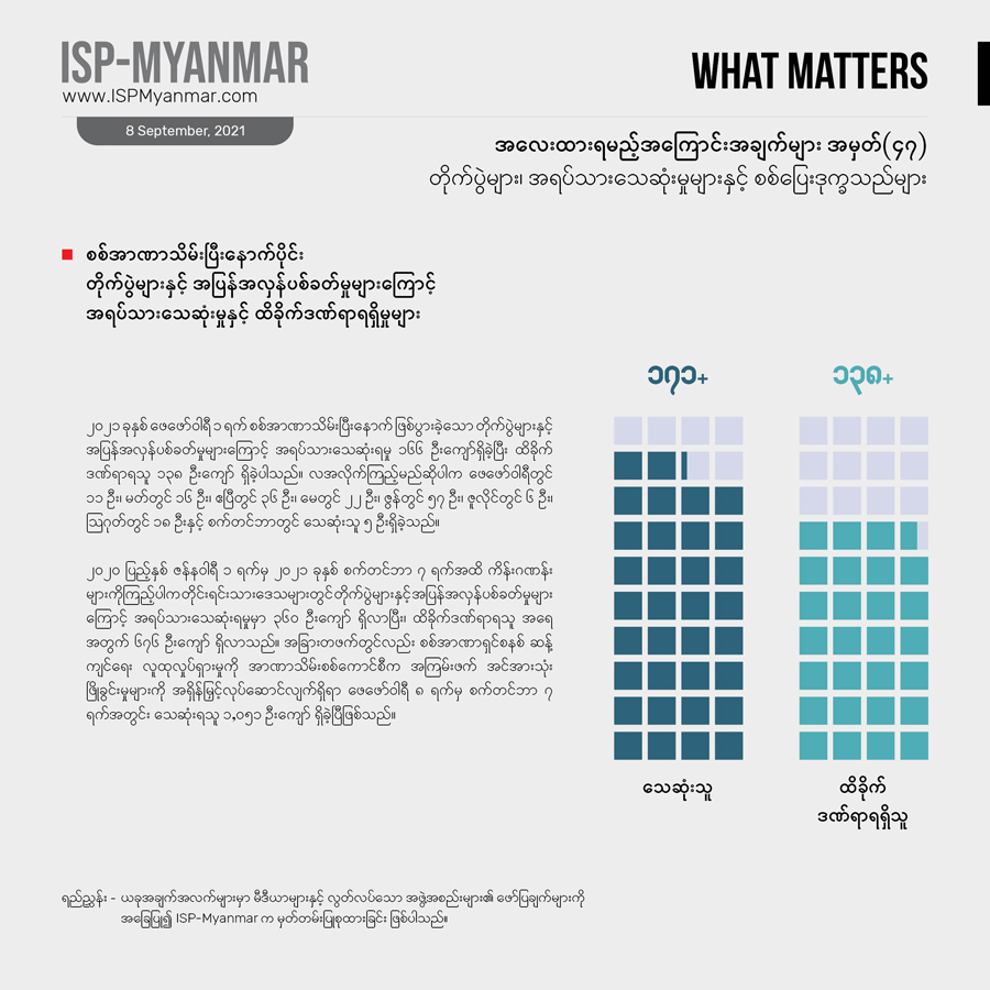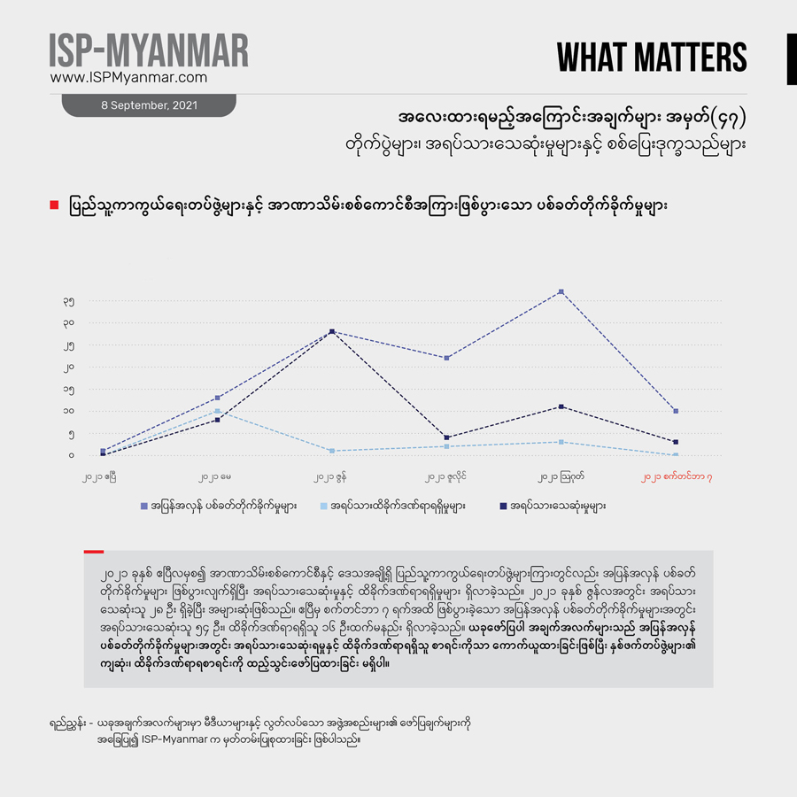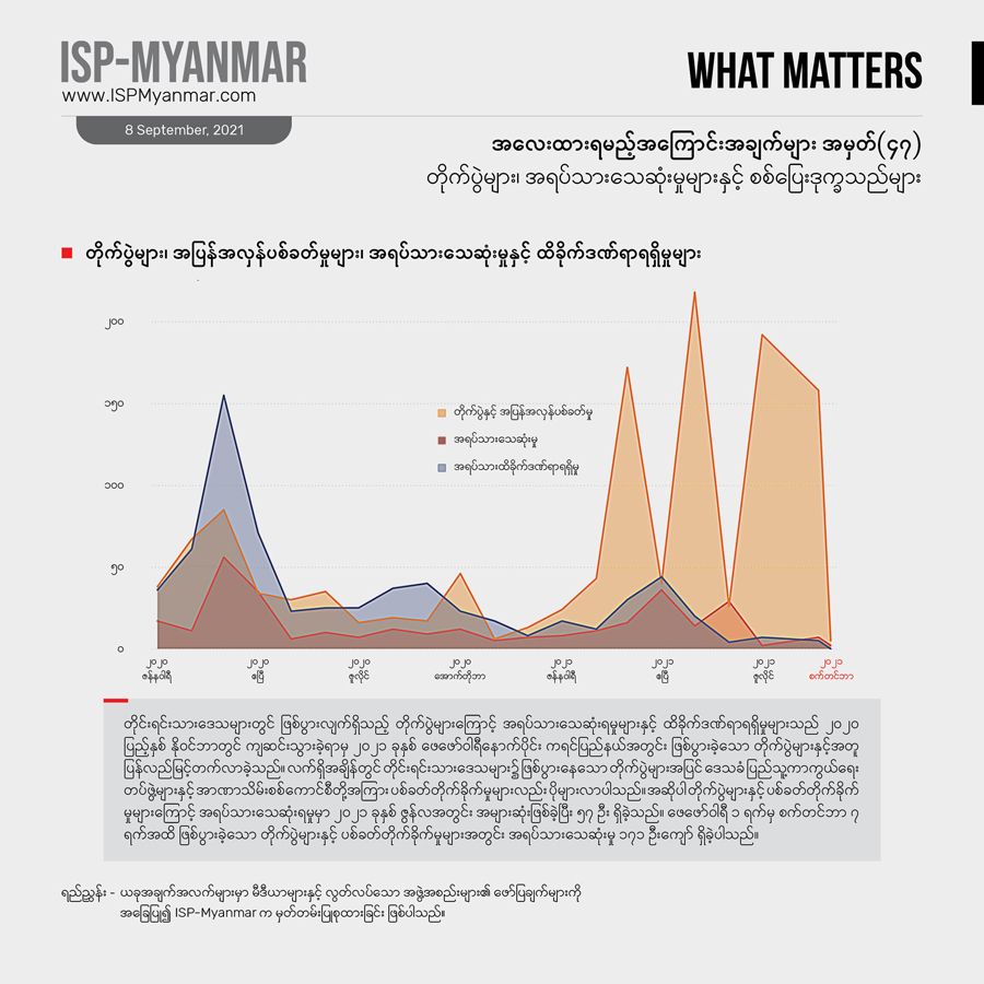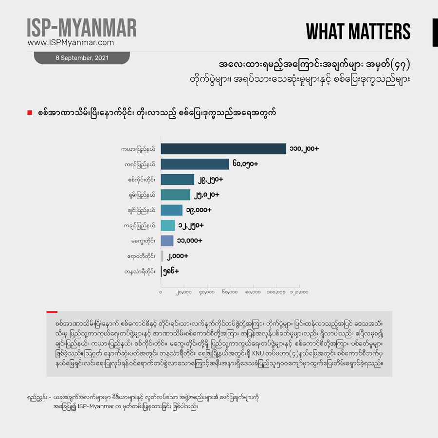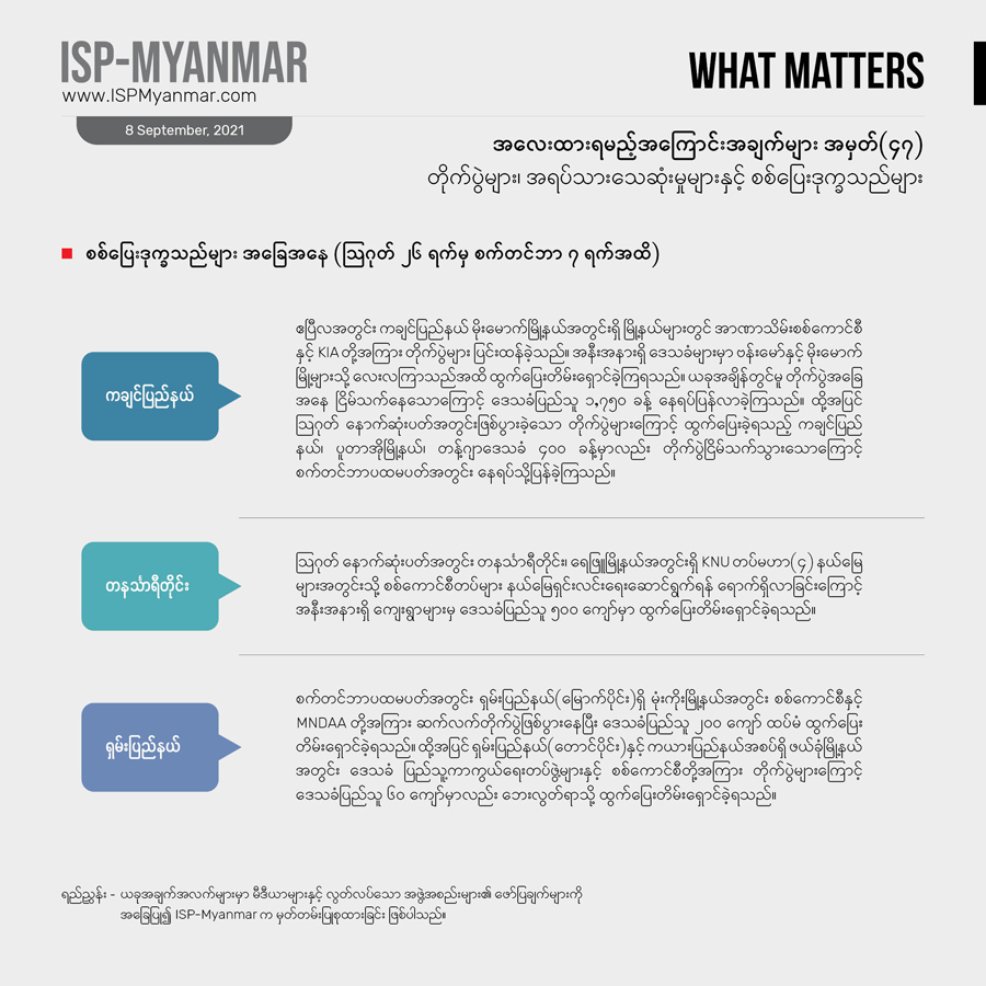 တခါ ဖြစ်ပွားခဲ့တဲ့ တိုက်ပွဲနဲ့ အပြန်အလှန်ပစ်ခတ်မှုတွေကြောင့် ရှမ်းပြည်နယ်နဲ့ တနင်္သာရီတိုင်းမှာ ယခုတပတ် အတွင်း စစ်ပြေးဒုက္ခသည် ၈၅၀ ဦးကျော် တိုးလာပြီး၊ တဖက်မှာလည်း ကချင်ပြည်နယ်အတွင်းက စစ်ရှောင် ပြည်သူ ၂,၁၀၀ ကျော်ခန့် နေရပ်ပြန်လာခဲ့ကြပါတယ်။ ၂၀၂၀ ပြည့်နှစ် ဇန်နဝါရီ ၁ရက် ကစပြီး အခု ၂၀၂၁ ခုနှစ် စက်တင်ဘာ ၇ ရက်အထိ စစ်ပြေး ဒုက္ခသည်အရေအတွက်ကို ကြည့်ရင် ၇၆၇,၆၅၆ ဦးကျော် ရှိလာခဲ့ပါတယ်။