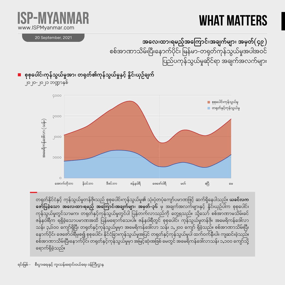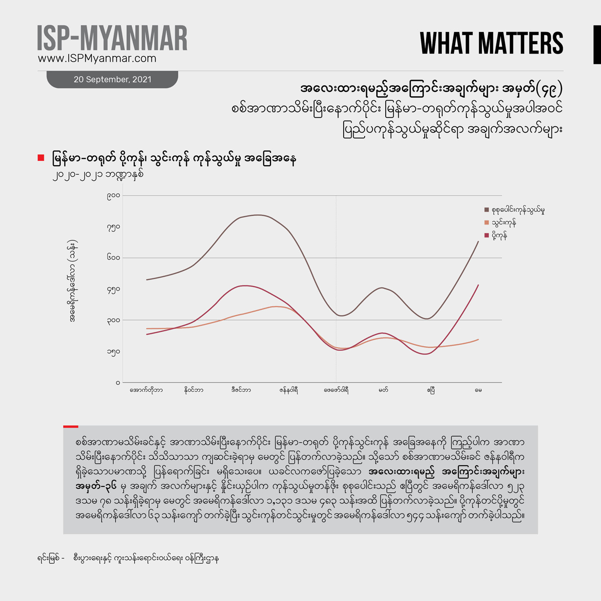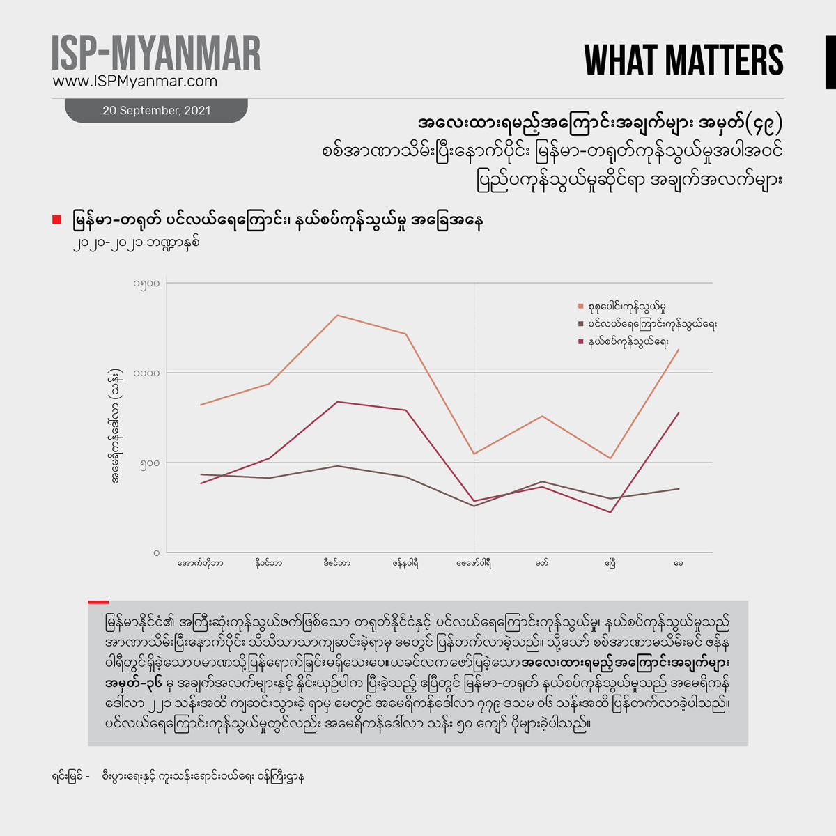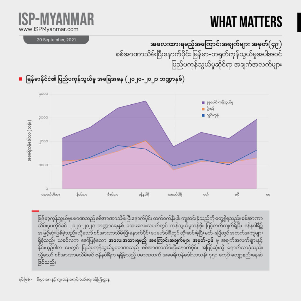 နိုင်ငံတခု၊ အုပ်ချုပ်မှု အဖွဲ့အစည်းတရပ် ရပ်တည် ရှင်သန်နိုင်ဖို့ဆိုရင် ကုန်သွယ်မှု ကဏ္ဍကလည်း အရေးပါတဲ့ ကိစ္စရပ်တခု ဖြစ်ပါတယ်။ ဒါကြောင့် စစ်အာဏာသိမ်းပြီး နောက်ပိုင်း မြန်မာနိုင်ငံရဲ့ ပြည်ပ ကုန်သွယ်မှု ဆိုင်ရာ အချက်အလက်တွေကို အလေးထားစောင့်ကြည့်ရမဲ့ ကိန်းဂဏန်းအချက်အလက်များအဖြစ် လစဉ် ထုတ်နုတ် တင်ပြသွားမှာ ဖြစ်ပါတယ်။ ဒီလိုတင်ပြရာမှာ စစ်အာဏာ မသိမ်းခင် ကုန်သွယ်ရေး အခြေအနေတွေနဲ့ နှိုင်းယှဉ်သုံးသပ်ပြီး ဘယ်လို ပြောင်းလဲလာတယ်၊ ကုန်သွယ်ရေးမှာ ဘယ်နိုင်ငံတွေကို ပိုပြီး အားကိုးလာရတယ် ဆိုတာကို အထောက်အထားအားဖြင့် ပေါ်လွင်စေမှာ ဖြစ်ပါတယ်။ အထူးသဖြင့် မြန်မာနိုင်ငံရဲ့ အကြီးမားဆုံး ကုန်သွယ်ဘက် ဖြစ်သလို အာဏာသိမ်း စစ်ကောင်စီကို အဓိက ကျောထောက် နောက်ခံပြုပေးနိုင်တဲ့ တရုတ်နိုင်ငံနဲ့ ကုန်သွယ်ရေး အခြေအနေတွေကို အလေးပေးစောင့်ကြည့် တင်ပြသွားမှာ ဖြစ်ပါတယ်။