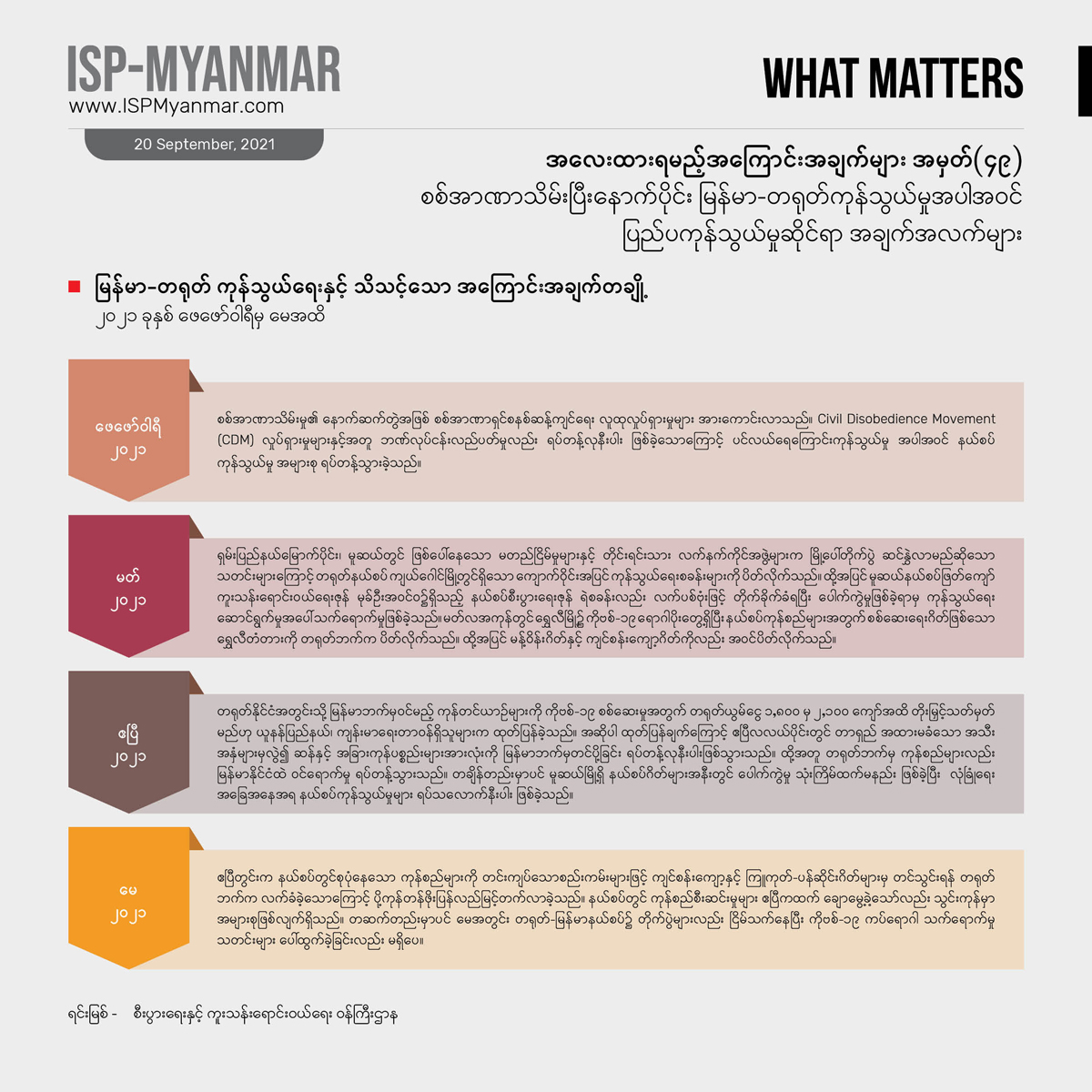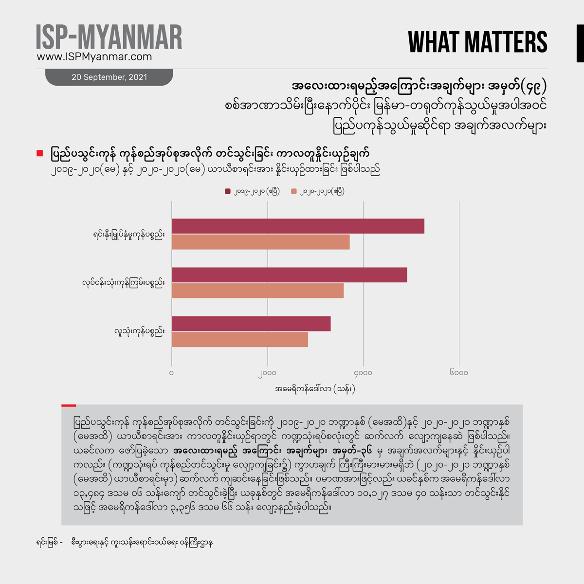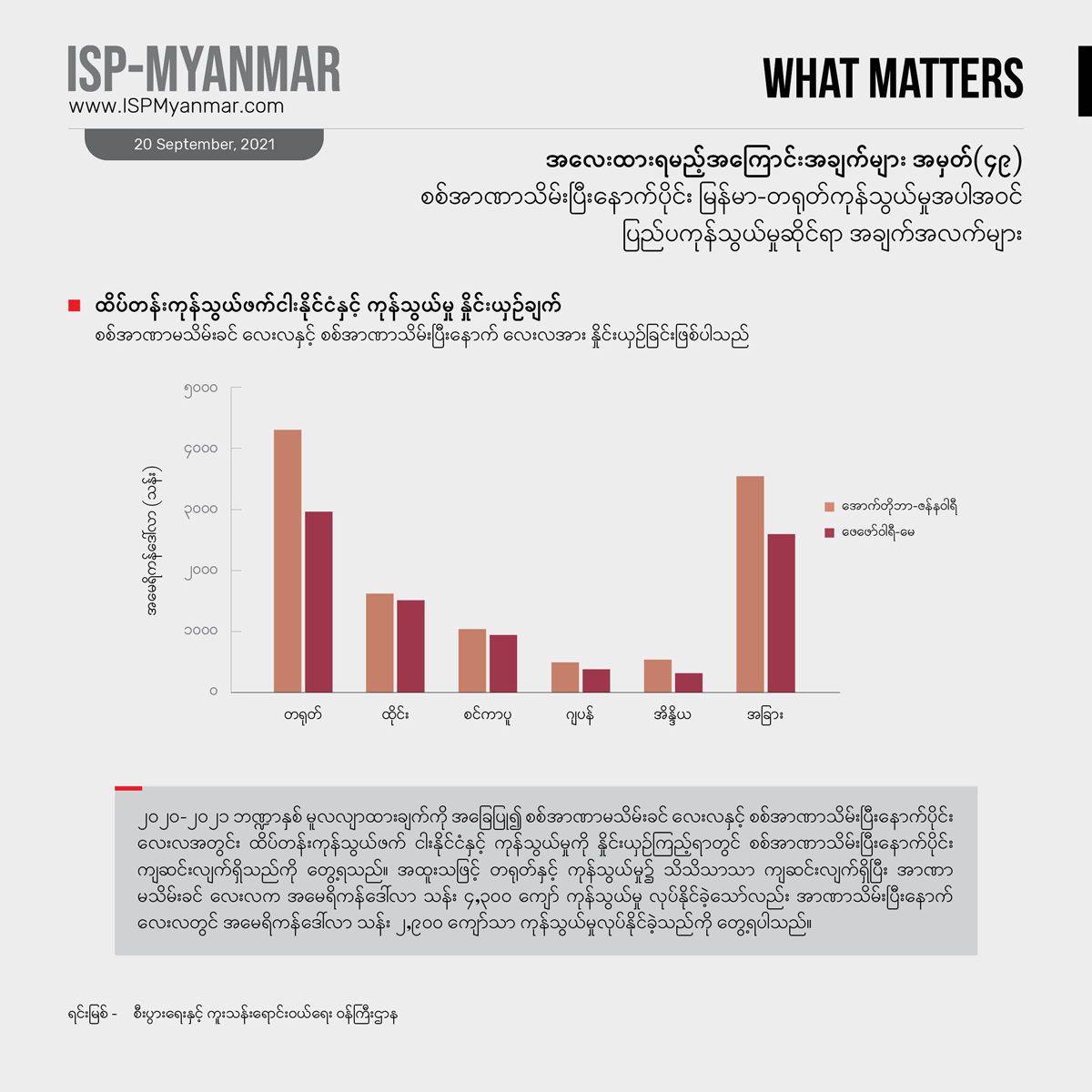 ပိုဆိုးတာက အခုအချိန်မှာ ကိုဗစ်-၁၉ တတိယလှိုင်းရဲ့ ရိုက်ခတ်မှုကို နိုင်ငံတဝန်း ပြင်းပြင်းထန်ထန် ရင်ဆိုင် နေရတာကြောင့်စီးပွားရေး၊ လူမှုရေး ထိခိုက်မှုတွေဟာ ခန့်မှန်းထားတာတွေထက် ပိုပြီး ဆိုးနိုင်ခြေ ရှိပါတယ်။ အာဏာသိမ်းမှုအပြီးမှာ ဖြစ်ပွားခဲ့တဲ့စီးပွားရေး အကျပ်အတည်းတွေနဲ့ အနောက်နိုင်ငံတွေရဲ့ စီးပွားရေး ပိတ်ဆို့ အရေးယူမှုတွေက မြန်မာနိုင်ငံရဲ့ ပြည်ပ ကုန်သွယ်မှုအပေါ်မှာ ဘယ်လို သက်ရောက်မှုတွေရှိမလဲ ဆိုတာဟာ မြန်မာနိုင်ငံရဲ့ စီးပွားရေးနဲ့ ဒီမိုကရေစီ ပြုပြင်ပြောင်းလဲရေးအတွက်အရေးပါပါတယ်။ ဒါ့အပြင် စီးပွားရေး ကိန်းဂဏန်းတွေဟာ ပြည်ပနိုင်ငံတွေရဲ့ နိုင်ငံရေးနဲ့ အကျိုးစီးပွား စဉ်းစားချက်တွေကို များစွာ ထင်ဟပ်လျက်ရှိတာကြောင့် မြန်မာနိုင်ငံရဲ့ ဒီမိုကရေစီရေးကြိုးပမ်းမှုမှာ ပြည်ပနိုင်ငံတွေရဲ့ အခန်းကဏ္ဍကို ပိုပြီးထဲထဲဝင်ဝင်နားလည်စေဖို့ အထောက်အပံ့ ဖြစ်စေမှာ ဖြစ်ပါတယ်။