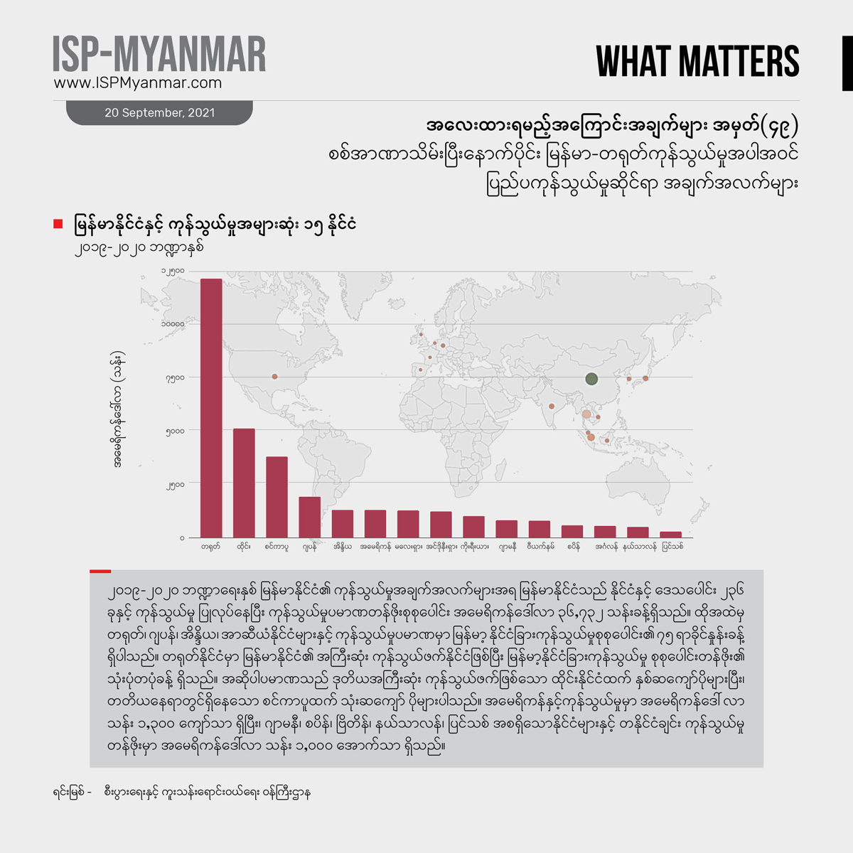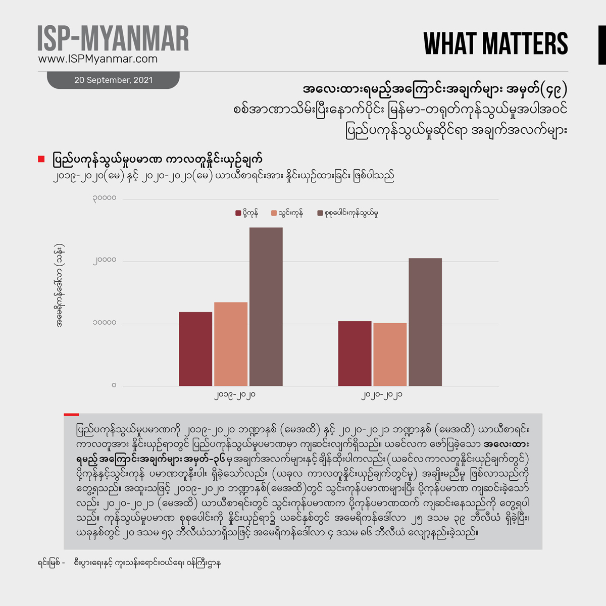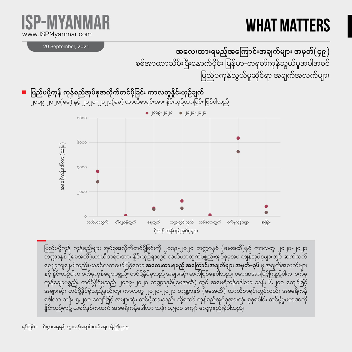 ပိုဆိုးတာက အခုအချိန်မှာ ကိုဗစ်-၁၉ တတိယလှိုင်းရဲ့ ရိုက်ခတ်မှုကို နိုင်ငံတဝန်း ပြင်းပြင်းထန်ထန် ရင်ဆိုင် နေရတာကြောင့်စီးပွားရေး၊ လူမှုရေး ထိခိုက်မှုတွေဟာ ခန့်မှန်းထားတာတွေထက် ပိုပြီး ဆိုးနိုင်ခြေ ရှိပါတယ်။ အာဏာသိမ်းမှုအပြီးမှာ ဖြစ်ပွားခဲ့တဲ့စီးပွားရေး အကျပ်အတည်းတွေနဲ့ အနောက်နိုင်ငံတွေရဲ့ စီးပွားရေး ပိတ်ဆို့ အရေးယူမှုတွေက မြန်မာနိုင်ငံရဲ့ ပြည်ပ ကုန်သွယ်မှုအပေါ်မှာ ဘယ်လို သက်ရောက်မှုတွေရှိမလဲ ဆိုတာဟာ မြန်မာနိုင်ငံရဲ့ စီးပွားရေးနဲ့ ဒီမိုကရေစီ ပြုပြင်ပြောင်းလဲရေးအတွက်အရေးပါပါတယ်။ ဒါ့အပြင် စီးပွားရေး ကိန်းဂဏန်းတွေဟာ ပြည်ပနိုင်ငံတွေရဲ့ နိုင်ငံရေးနဲ့ အကျိုးစီးပွား စဉ်းစားချက်တွေကို များစွာ ထင်ဟပ်လျက်ရှိတာကြောင့် မြန်မာနိုင်ငံရဲ့ ဒီမိုကရေစီရေးကြိုးပမ်းမှုမှာ ပြည်ပနိုင်ငံတွေရဲ့ အခန်းကဏ္ဍကို ပိုပြီးထဲထဲဝင်ဝင်နားလည်စေဖို့ အထောက်အပံ့ ဖြစ်စေမှာ ဖြစ်ပါတယ်။
