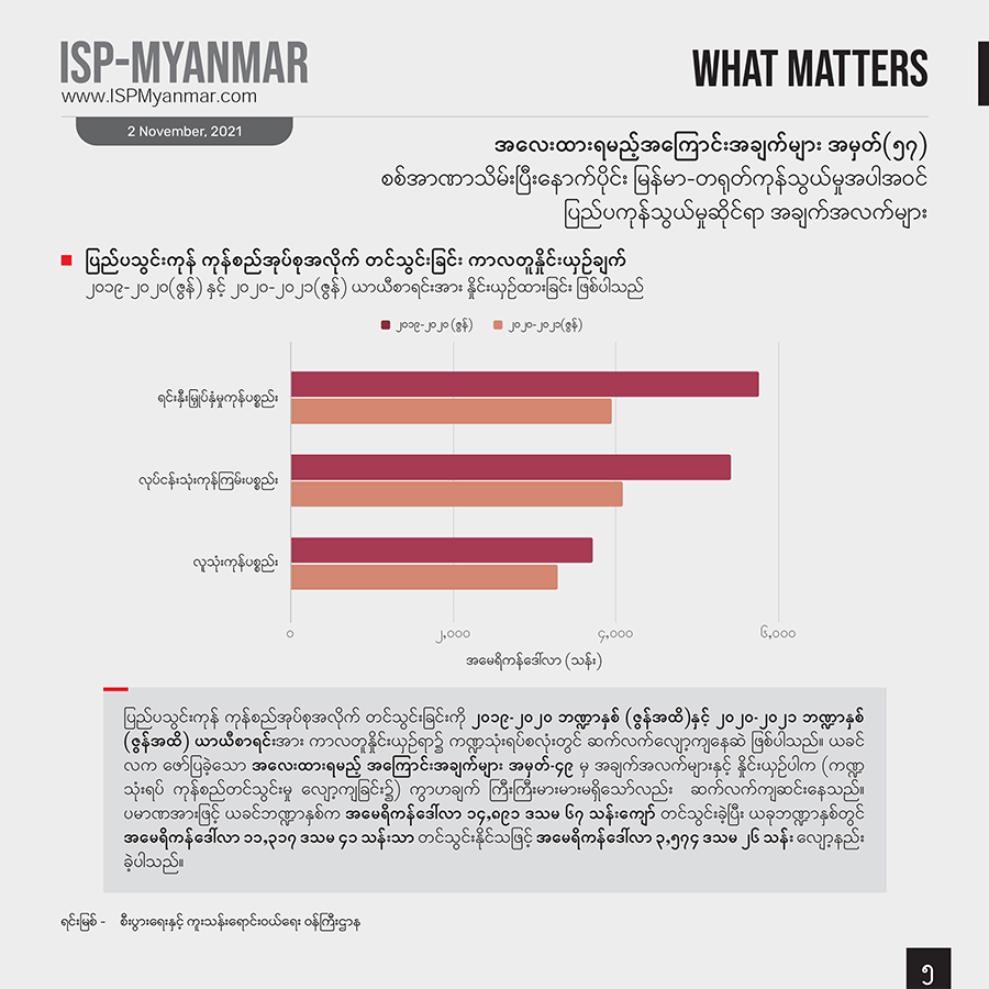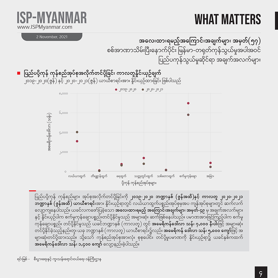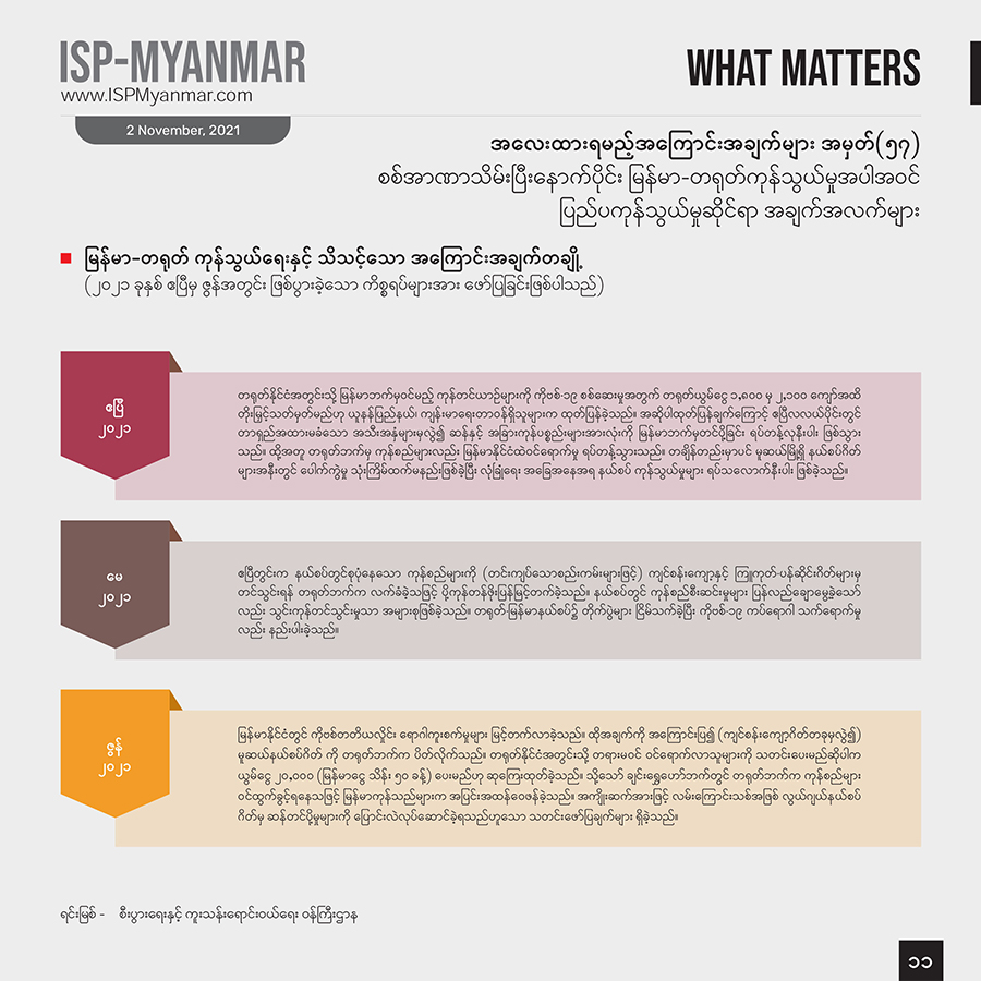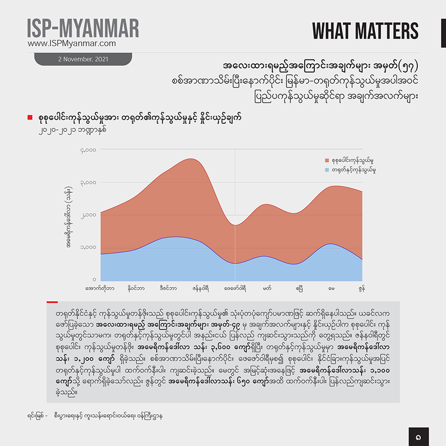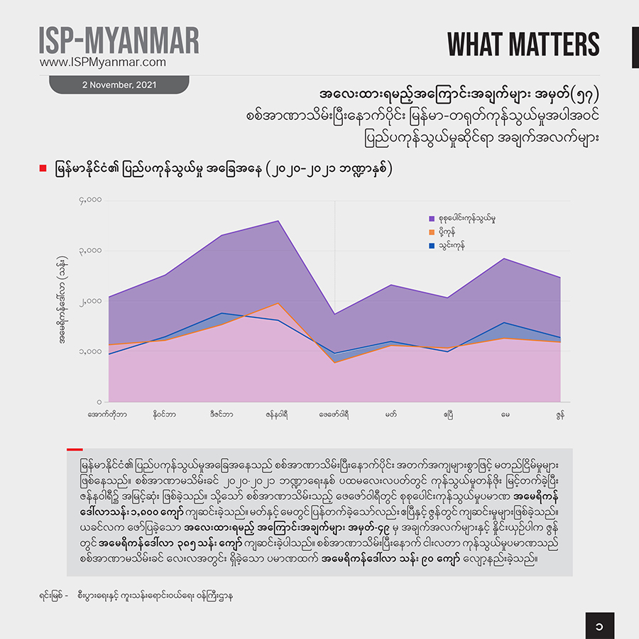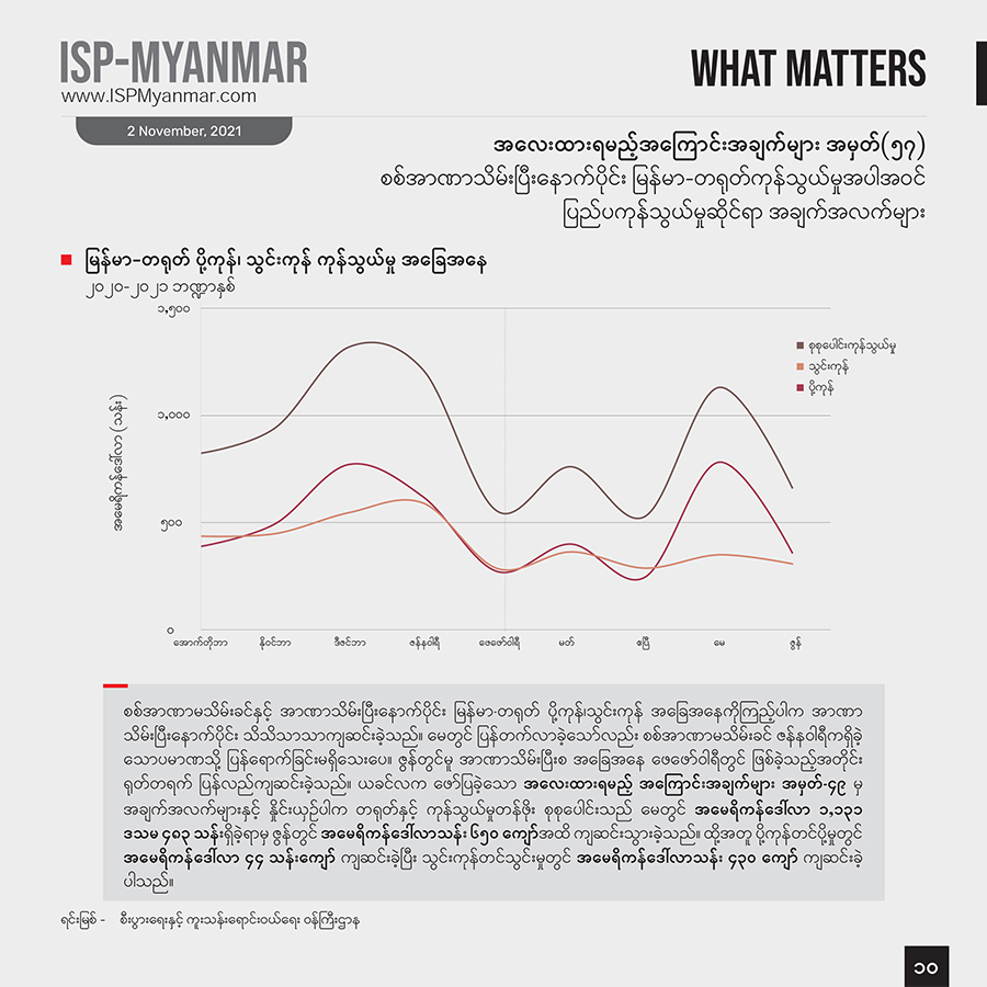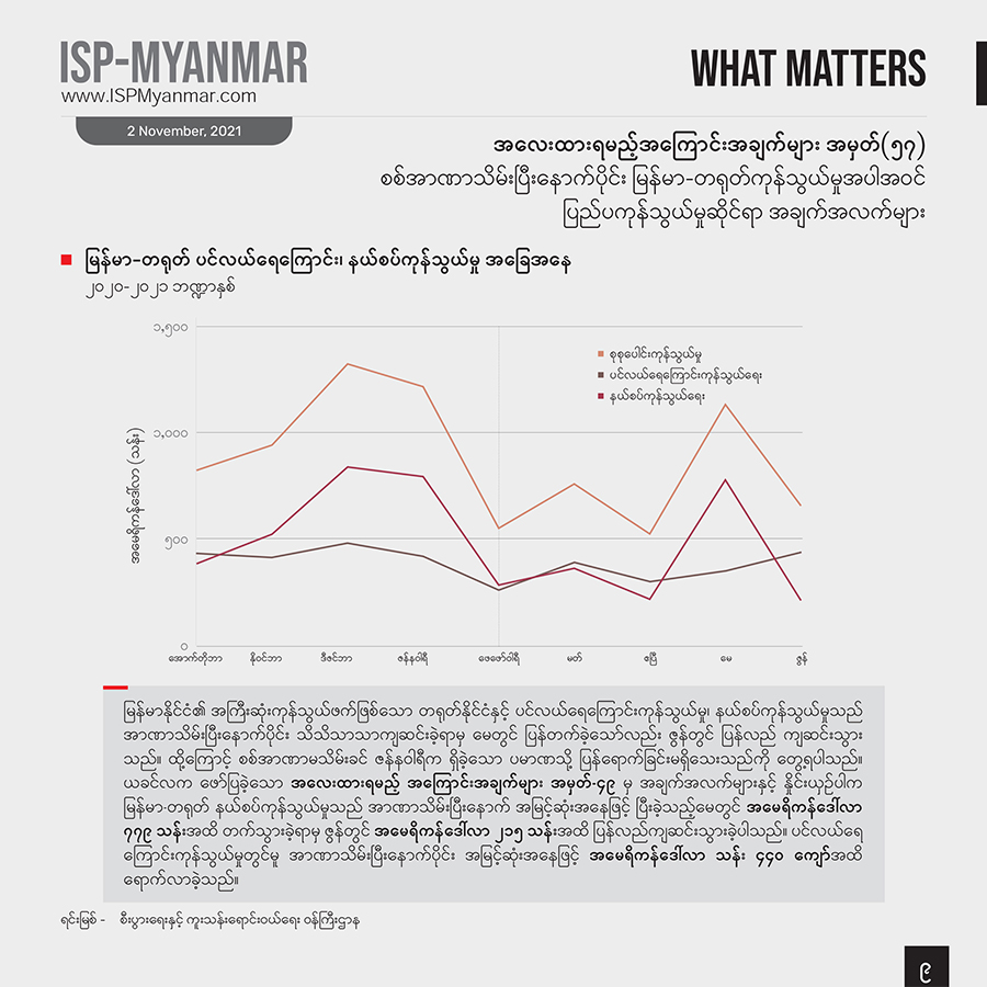 နိုင်ငံတခု၊ အုပ်ချုပ်မှု အဖွဲ့အစည်းတရပ် ရပ်တည် ရှင်သန်နိုင်ဖို့ဆိုရင် ကုန်သွယ်မှု ကဏ္ဍကလည်း အရေးပါတဲ့ ကိစ္စရပ်တခု ဖြစ်ပါတယ်။ ဒါကြောင့် စစ်အာဏာသိမ်းပြီး နောက်ပိုင်း မြန်မာနိုင်ငံရဲ့ ပြည်ပ ကုန်သွယ်မှု ဆိုင်ရာ အချက်အလက်တွေကို အလေးထားစောင့်ကြည့်ရမဲ့ ကိန်းဂဏန်းအချက်အလက်များအဖြစ် လစဉ် ထုတ်နုတ် တင်ပြသွားမှာ ဖြစ်ပါတယ်။ ဒီလိုတင်ပြရာမှာ စစ်အာဏာ မသိမ်းခင် ကုန်သွယ်ရေး အခြေအနေတွေနဲ့ နှိုင်းယှဉ်သုံးသပ်ပြီး ဘယ်လို ပြောင်းလဲလာတယ်၊ ကုန်သွယ်ရေးမှာ ဘယ်နိုင်ငံတွေကို ပိုပြီး အားကိုးလာရတယ် ဆိုတာကို အထောက်အထားအားဖြင့် ပေါ်လွင်စေမှာ ဖြစ်ပါတယ်။ အထူးသဖြင့် မြန်မာနိုင်ငံရဲ့ အကြီးမားဆုံး ကုန်သွယ်ဘက် ဖြစ်သလို အာဏာသိမ်း စစ်ကောင်စီကို အဓိက ကျောထောက် နောက်ခံပြုပေးနိုင်တဲ့ တရုတ်နိုင်ငံနဲ့ ကုန်သွယ်ရေး အခြေအနေတွေကို အလေးပေးစောင့်ကြည့် တင်ပြသွားမှာ ဖြစ်ပါတယ်။