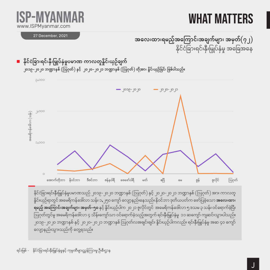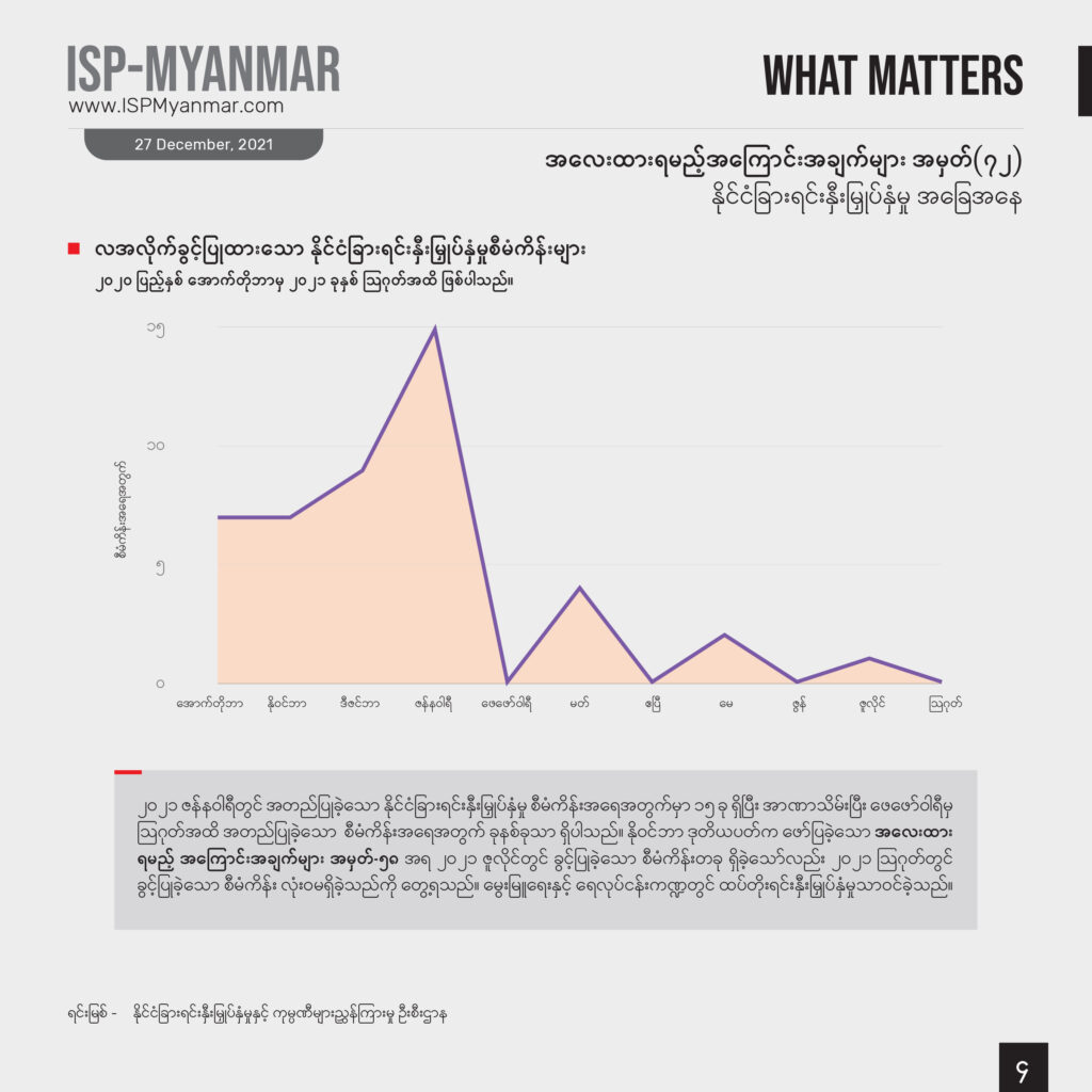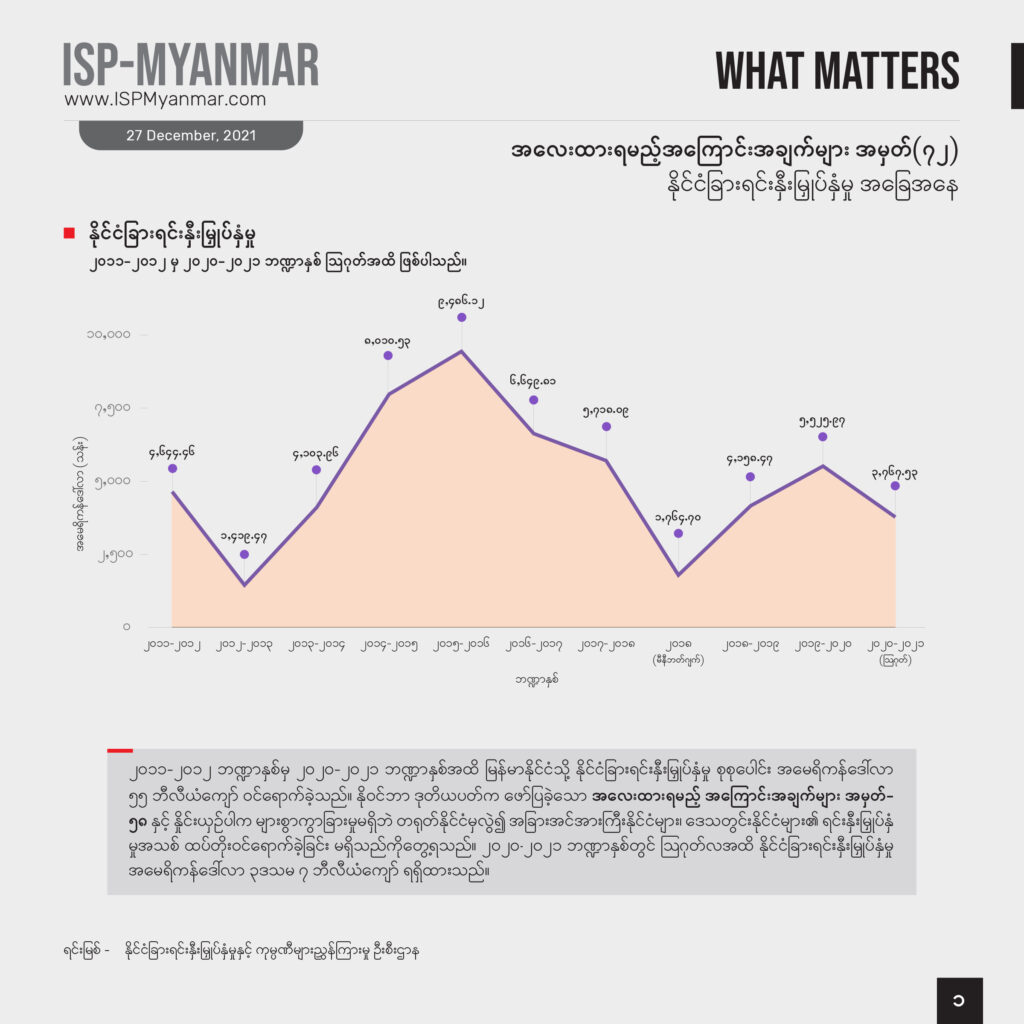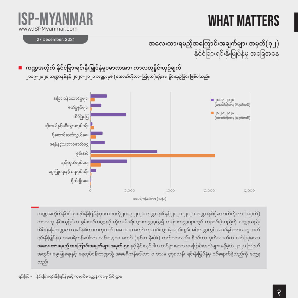 မြန်မာနိုင်ငံရဲ့ နိုင်ငံခြားရင်းနှီးမြှုပ်နှံမှုကို ၂၀၁၉-၂၀၂၀ ဘဏ္ဍာနှစ် (သြဂုတ်အထိ)နဲ့ ၂၀၂၀-၂၀၂၁ ဘဏ္ဍာနှစ် (သြဂုတ်အထိ) နှိုင်းယှဉ်ကြည့်တဲ့အခါ အမေရိကန်ဒေါ်လာ ၁ ဒသမ ၂ ဘီလီယံကျော်ကျဆင်း သွားပါတယ်။ သြဂုတ်လမှာ တရုတ်နိုင်ငံက မွေးမြူရေးနှင့် ရေလုပ်ငန်းကဏ္ဍမှာ အမေရိကန် ဒေါ်လာ ၄သိန်းကျော် ထပ်တိုးရင်းနှီးမြှုပ်နှံသာဝင်ခဲ့ပြီး ကျန်နိုင်ငံများက ရင်းနှီးမြှုပ်နှံမှုဝင်ရောက်ခဲ့ခြင်းမရှိပါဘူး။ စစ်ကောင်စီရဲ့ တရားဝင်ထုတ်ပြန်ထားတဲ့ အချက်အလက်တွေအရ ၂၀၂၁ ခုနှစ် သြဂုတ်လဟာ အာဏာသိမ်းပြီးနောက်ပိုင်း ရင်းနှီးမြှုပ်နှံမှု ပမာဏ အနိမ့်ဆုံးလ ဖြစ်ခဲ့ပါတယ်။