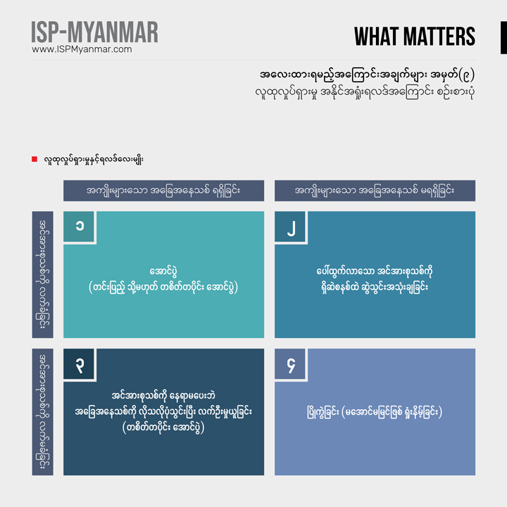 လက်ရှိ တိုင်းပြည်မှာ ဖြစ်ပေါ်နေတဲ့ စစ်အာဏာသိမ်းမှုနဲ့ ပြည်သူတွေ အံတုတဲ့ လူထု လှုပ်ရှားမှုတွေကို သုတေသန ရှုထောင့်ကနေ အကျိုးပြုနိုင်စေဖို့ အလေးထားရမယ့် အကြောင်းအချက်များ “What Matters” ဆိုတဲ့ ခေါင်းစဉ်နဲ့ ကဏ္ဍတခုကို ISP-Myanmar က ဖော်ပြနေတာ ဖြစ်ပါတယ်။ ဒီကဏ္ဍဟာ သုတေသန တွေ့ရှိချက်တွေကို အခြေခံပြီး တင်ပြပုံ လွယ်လွယ်နဲ့ ဖတ်ချိန် တိုတိုအတွင်း အလေးထားသင့်တဲ့ ကိစ္စရပ်တွေနဲ့ ဒေတာ အချက်လက်တွေကို လူတိုင်း လက်လှမ်း မီနိုင်အောင် မိတ်ဆက်ပေးသွားဖို့ ရည်ရွယ်ပါတယ်။ ကိစ္စရပ်မိတ်ဆက် ချက်တွေကို အမှန်၊ အမှား ယတိပြတ်သဘော ရှုမြင်ဖို့ မဟုတ်ဘဲ ဦးနှောက် နှိုးဆွဖို့ စဉ်းစား ဆင်ခြင်စရာအဖြစ် ဖော်ပြလိုတာ ဖြစ်ပါတယ်။ ဒေတာ အချက်လက် တင်ပြချက်တွေကိုတော့ ပိုမှန်ကန် ပြည့်စုံအောင်ဖြည့်စွက်သွားဖို့ ရည်ရွယ်ပါတယ်။